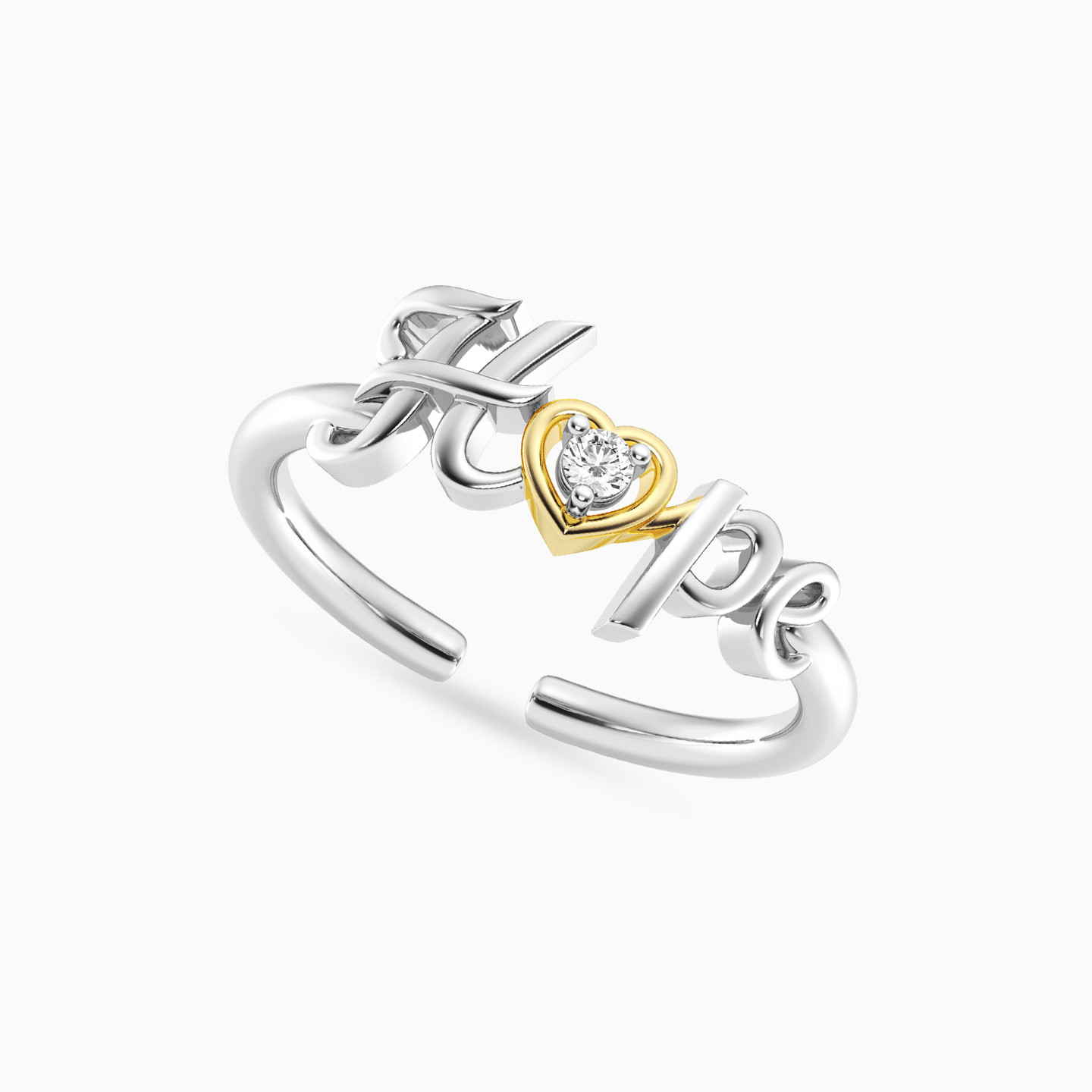 Discover affordable glamour and timeless style with this piece from Waves! This sterling silver ring radiates inspiration with the word “Hope” elegantly sculpted and highlighted by a golden heart that embraces a sparkling lab-grown diamond at its center. A delicate and meaningful piece, perfect for those who love to carry a touch of positivity and graceful shine every day.
