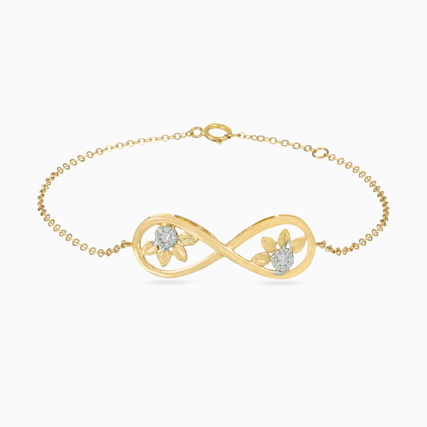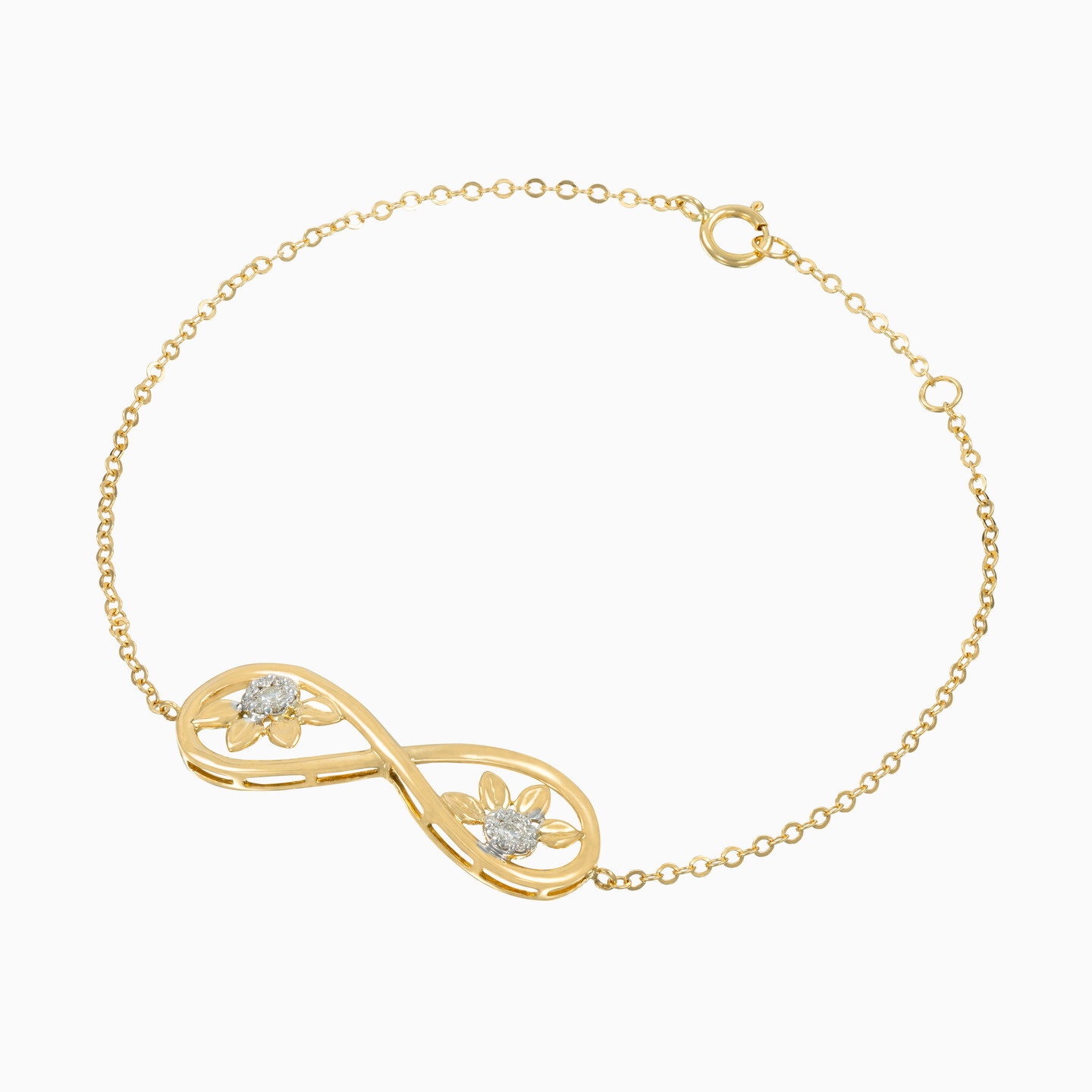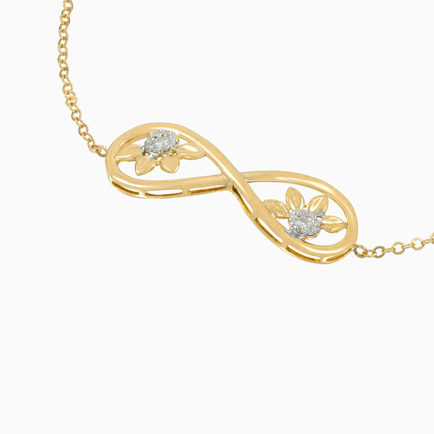 Combining elegant sparkle with feminine curves, this gorgeous chain bracelet from L'azurde Diamonds offers easy everyday glam. Fashioned in 18-karat yellow gold, this mesmerizing piece features brilliant cut diamond flowers that sparkle within an infinity loop. Pair this magnificent accessory with the matching pendant necklace, earrings and ring for the perfect finishing touch to any outfit.