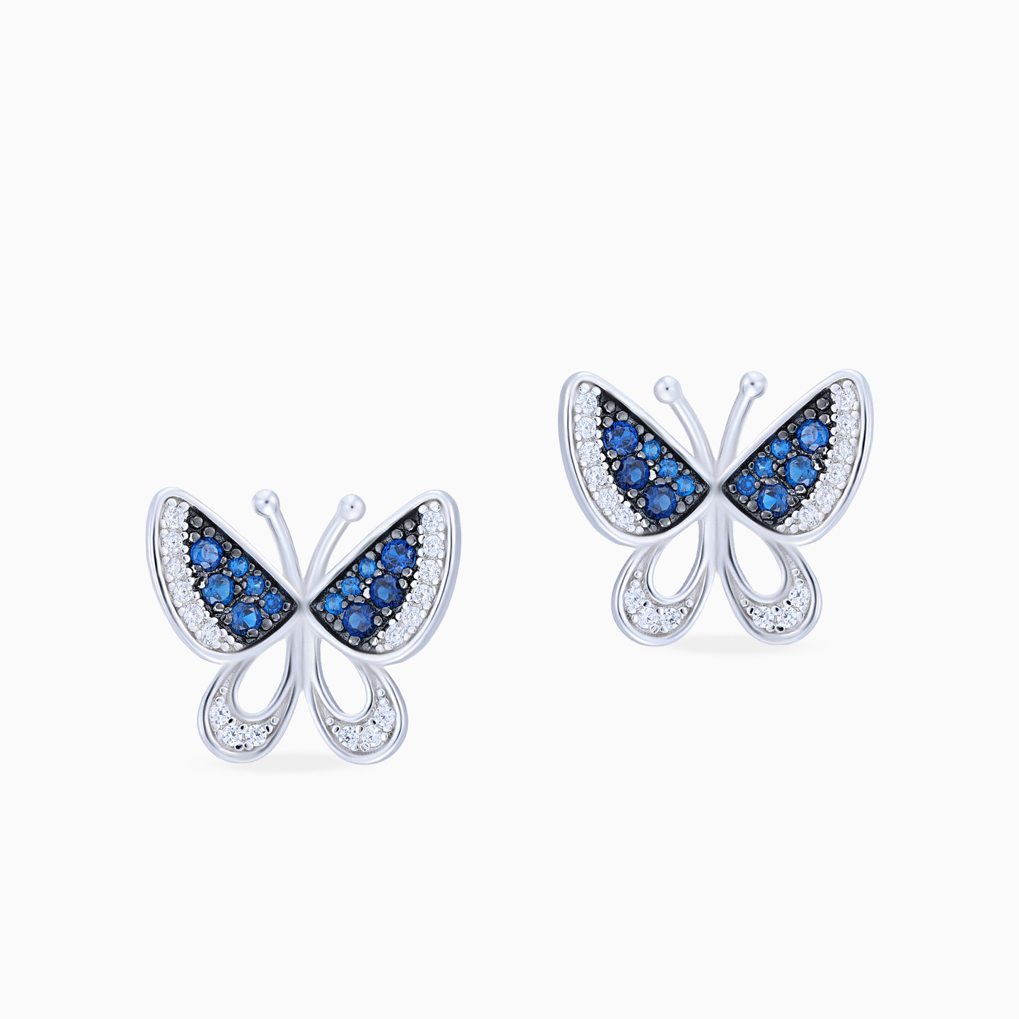 Discover affordable glamour and timeless style with this piece from Waves! These charming sterling silver earrings showcase an elegant butterfly design beautifully studded with a mix of sparkling clear and blue stones. The graceful butterflies add a playful and feminine touch to your look, while the dazzling stones create a subtle yet captivating shimmer. Perfect for any occasion, these earrings will effortlessly elevate your everyday style.