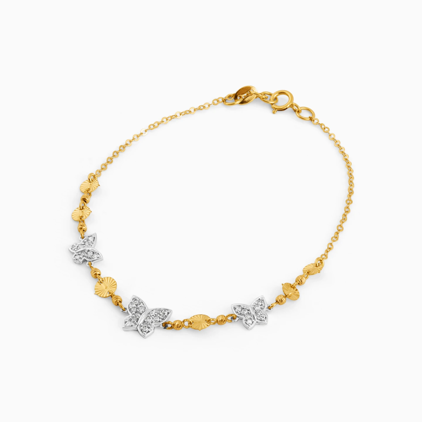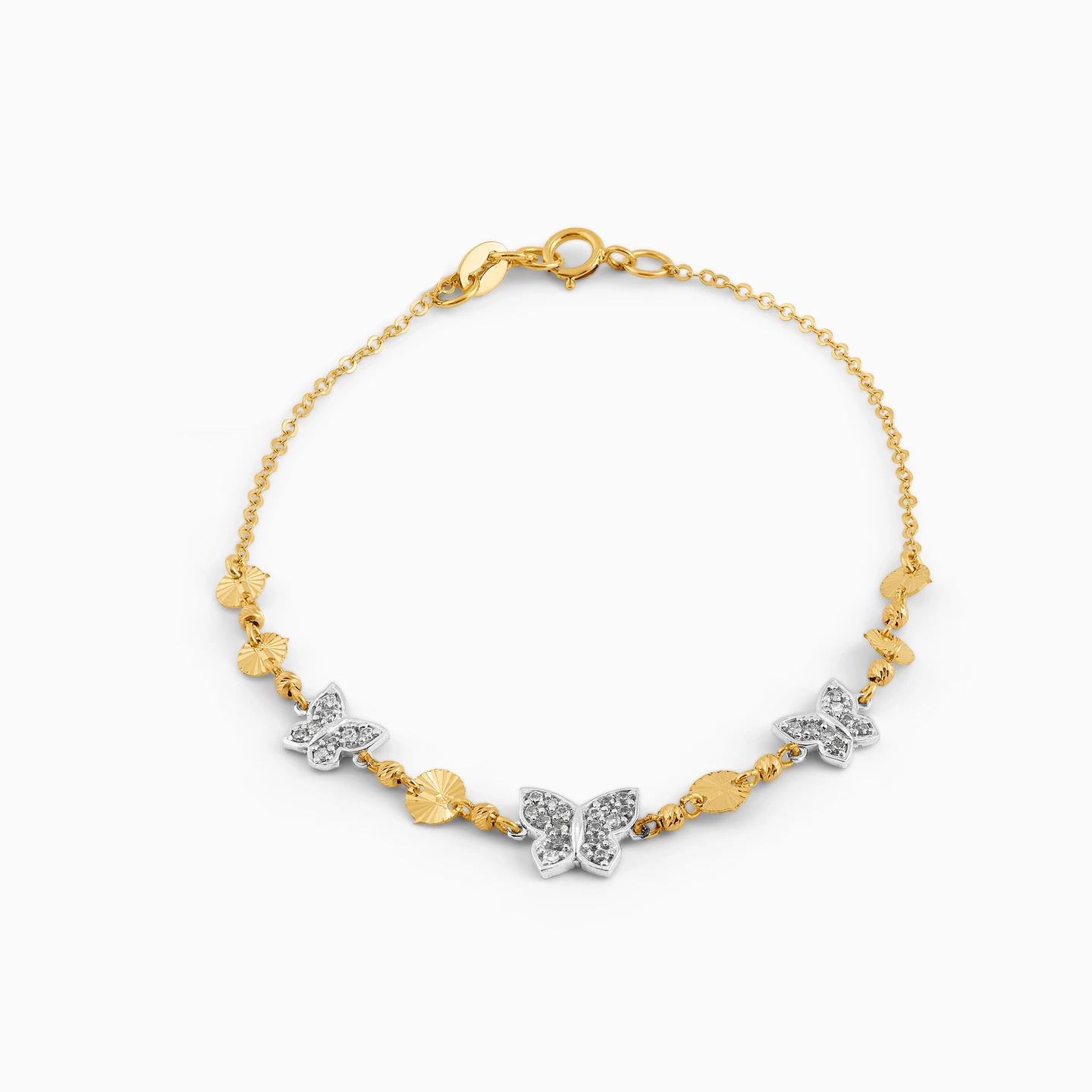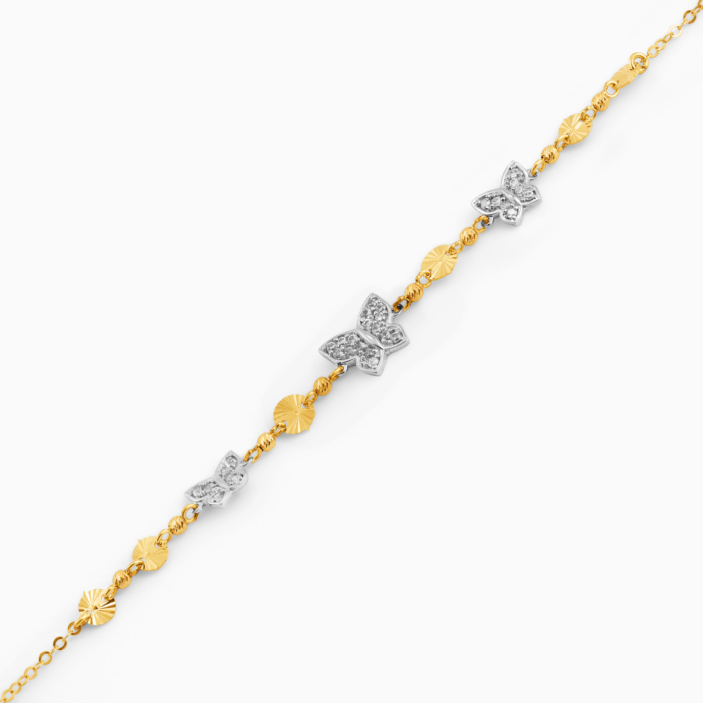 Enter the room with the grace and beauty of a butterfly with this feminine bracelet from L’azurde Gold on your wrist. This must-have bracelet makes an elegant addition to your jewelry collection. It shimmers in 18-karat yellow gold and features dainty discs and chic butterflies dotted with sparkling cubic zirconia stones. This sophisticated bracelet will take you from work day to weekend in style.