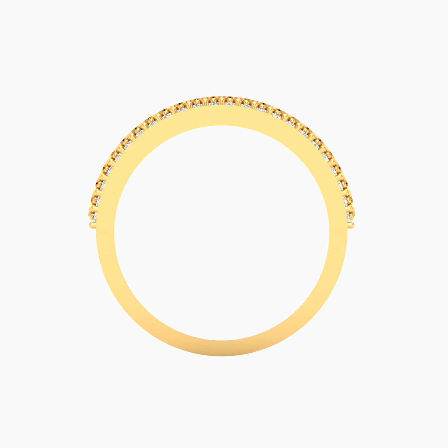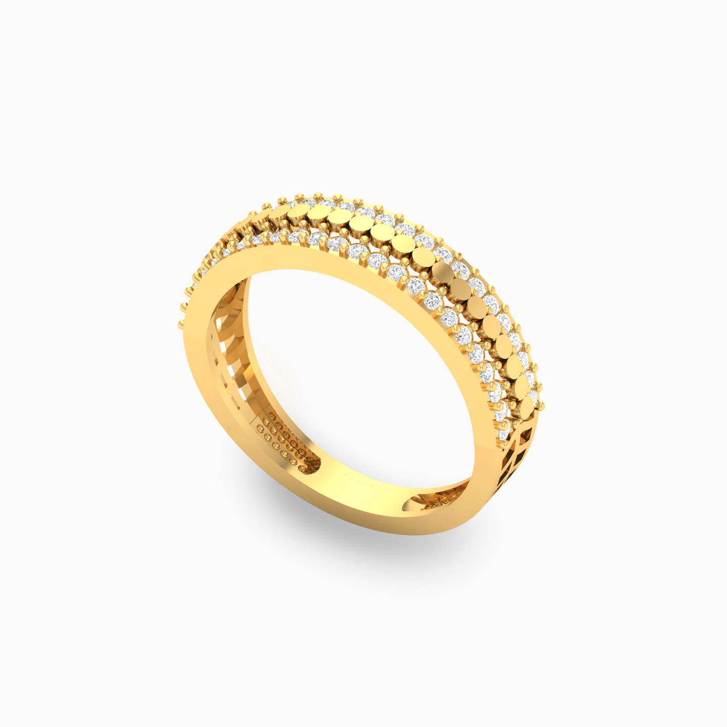 An alluring trio by L’azurde Gold to add subtle shine and elegance to your everyday outfits. It features a sleek band of circle-shaped motifs flanked by bands of pave set round cubic zirconia stones on either side. Completed by a lustrous 18-karat yellow gold body, this statement ring is always meant to be wrapped around your finger.