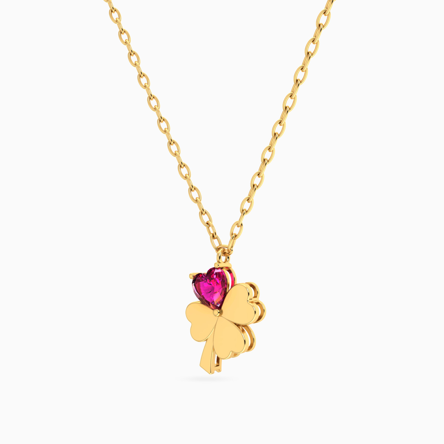 Luck meets luxury with this enchanting 18-karat yellow gold Necklace from L'azurde Instyle! It features a dainty links chain and a mesmerizing four-petal clover pendant. Three petals gleam with a brilliant mirror finish, while the fourth, a heart-shaped colored stone, glistens with playful charm. Wear this dazzling piece to carry your very own sparkle and fortune for the day!