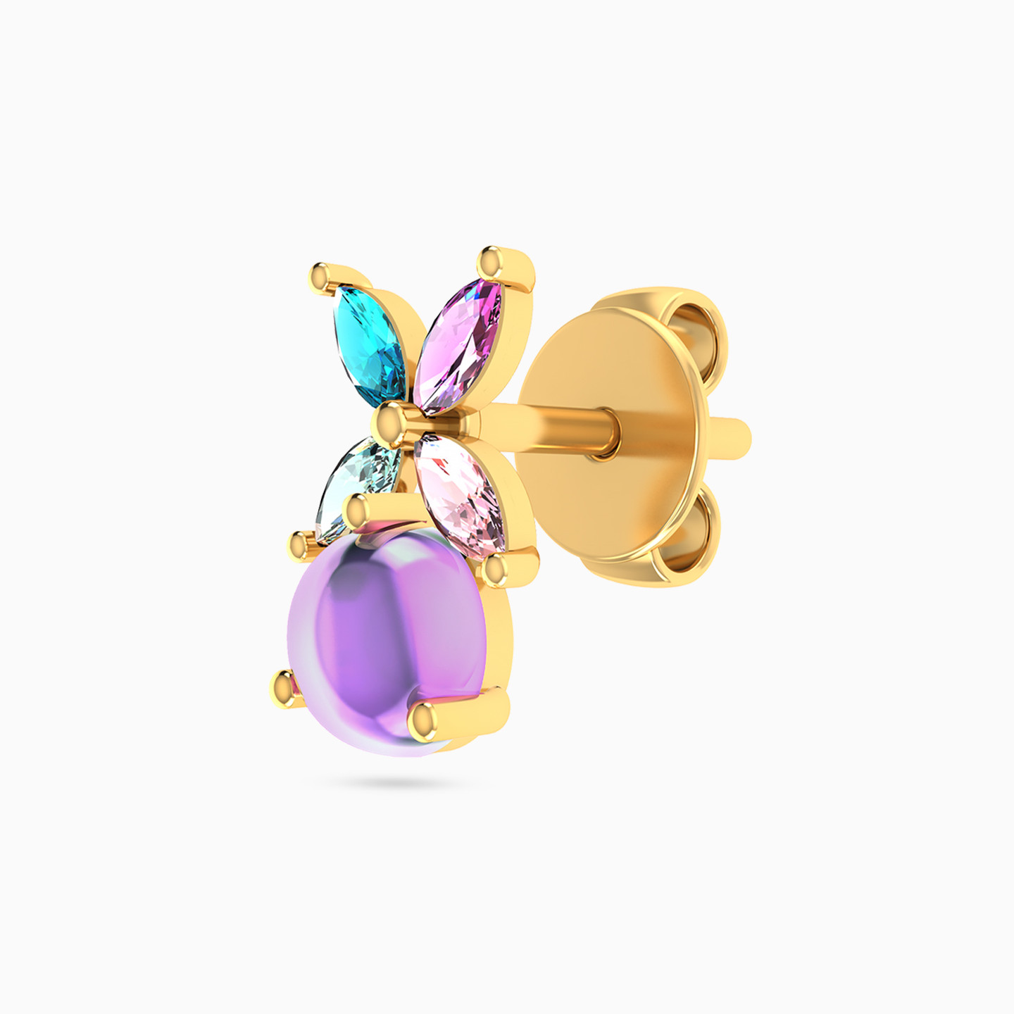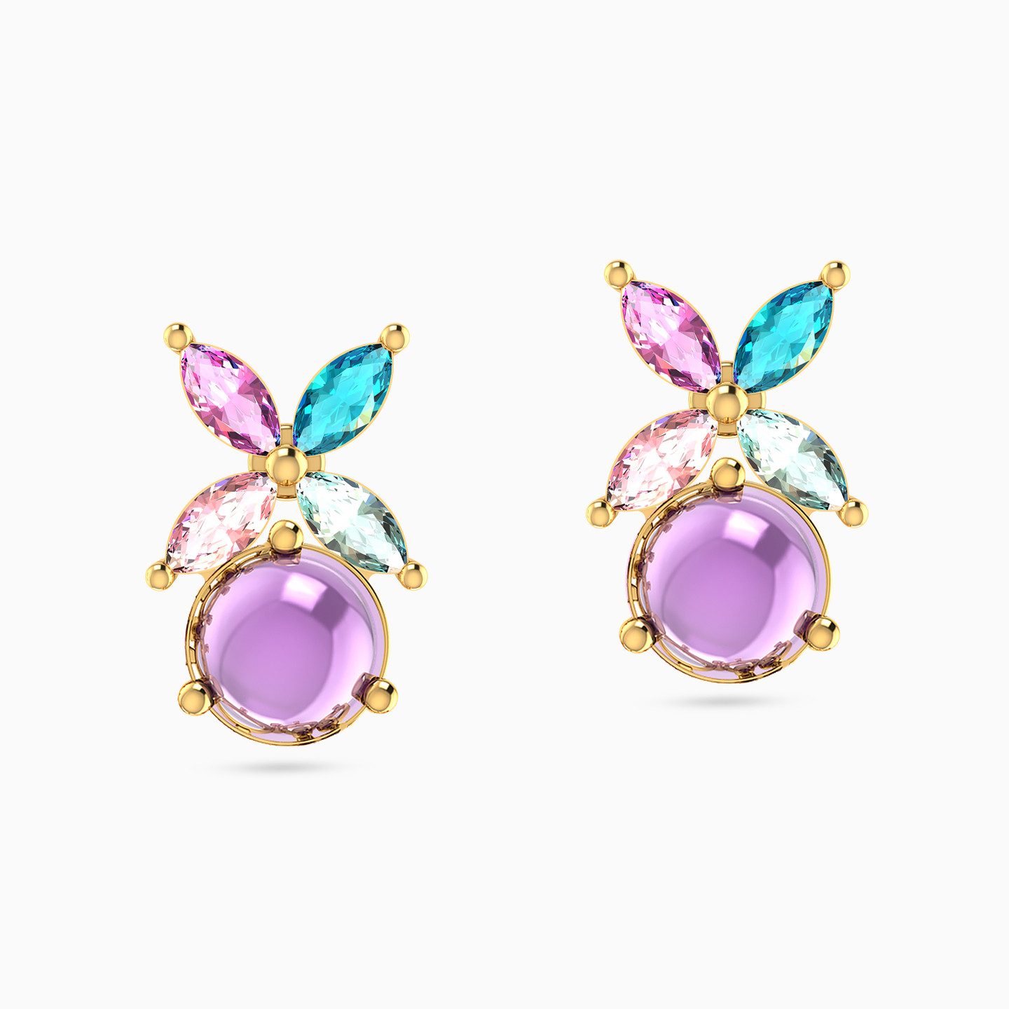 A garden of glamour, these 18-karat yellow gold stud earrings from Instyle showcase pastel-hued petals that bloom with brilliance! Each earring features a yellow-gold base with a radiant round-colored stone at its core, perched securely on prongs for maximum shine. Above it, a charming floral arrangement emerges, crafted from delicate marquise-shaped colored stones, all prong-set for a captivating display of nature-inspired elegance. Adorn your ears with these exquisite earrings like a springtime garden!