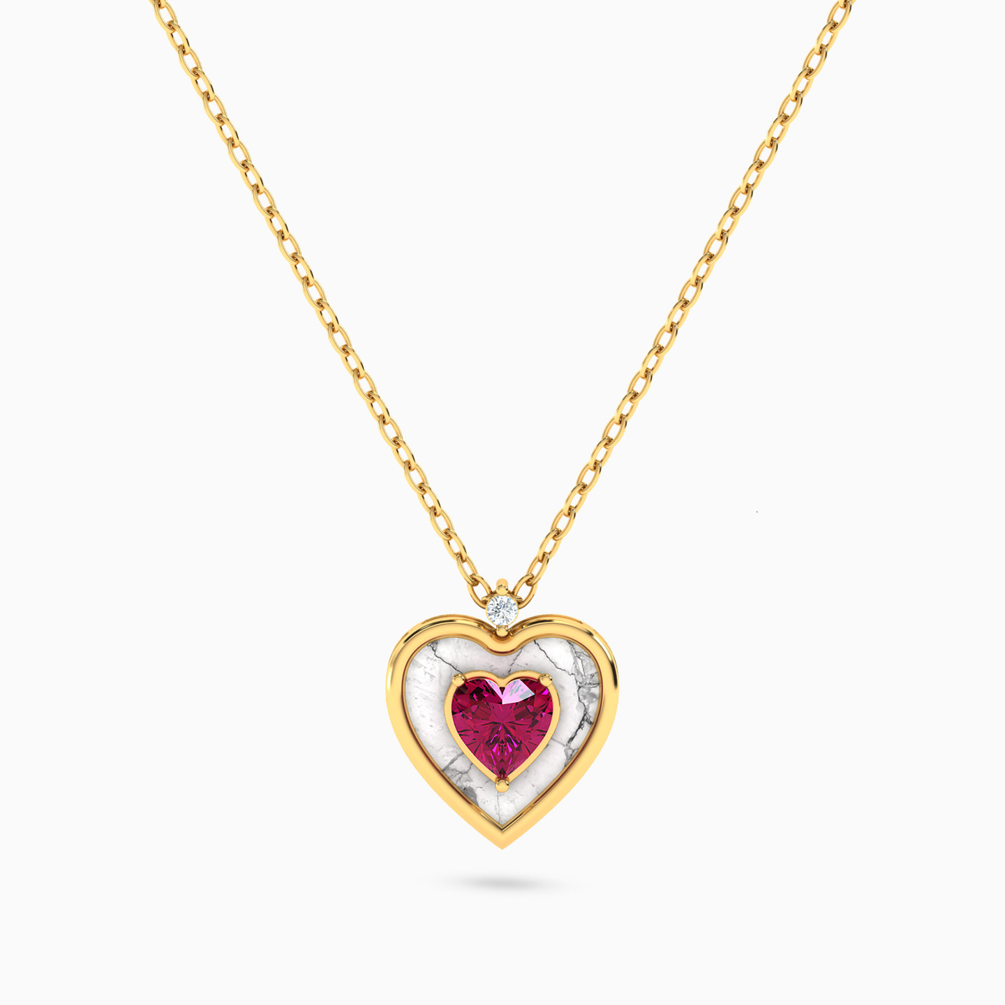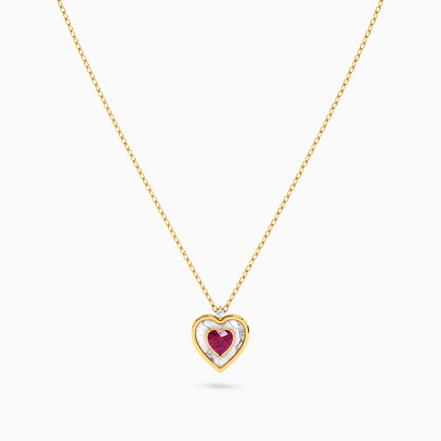 Intertwining love with luxury, this piece from L'azurde Instyle will not fail to impress. The heart shaped pendant in 18-karat yellow gold is beautifully crafted with a marbled mother of pearl layer and a deep red stone to the center. It gracefully drops from an 18-karat yellow gold chain to accentuate any plunge or V-neckline.