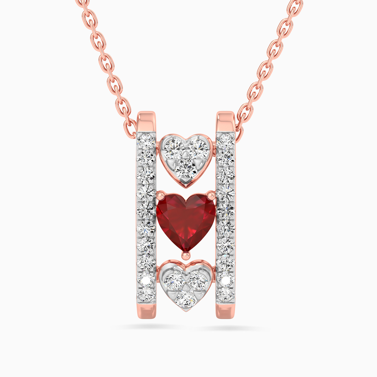 Celebrate the unity of hearts with this breathtaking 18-karat rose gold pendant necklace from L'azurde Diamonds. A classic chain gracefully holds a striking pendant featuring two sleek rings intimately connected and adorned with brilliant cut diamonds in a mesmerizing castle setting. The delicate link between the rings is tenderly expressed through a trio of hearts: two sparkling heart-shaped motifs studded with diamonds flanking a radiant red heart-shaped colored stone. This symphony of passion and brilliance makes a beautiful gift of everlasting love.