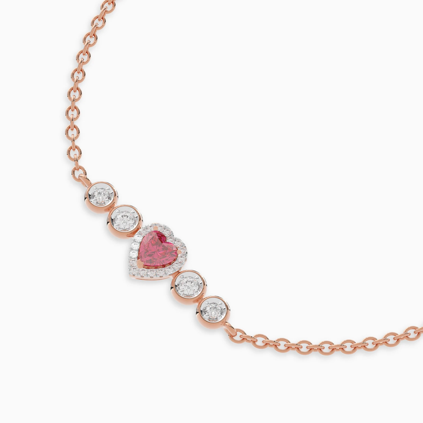 Celebrate love with the elegant bracelet from Lazurde Diamonds' Valentine's Collection. Crafted in 18k rose gold, this stunning chain bracelet features a heart-shaped colored stone, delicately framed with shimmering diamonds. On each side of the heart, two clear circular stones add a touch of brilliance, perfectly complementing the design. This bracelet is a true symbol of love and sophistication, making it the perfect gift for a special someone or a beautiful addition to your collection.
