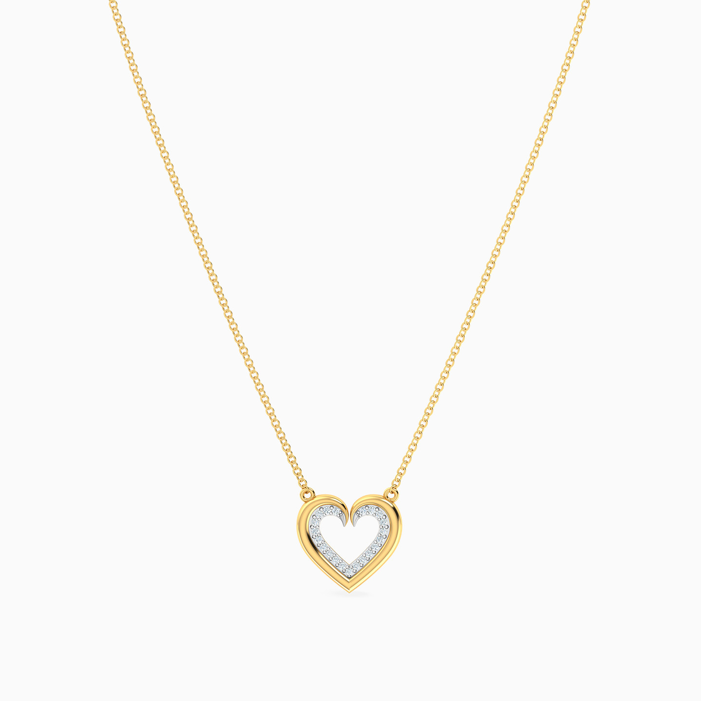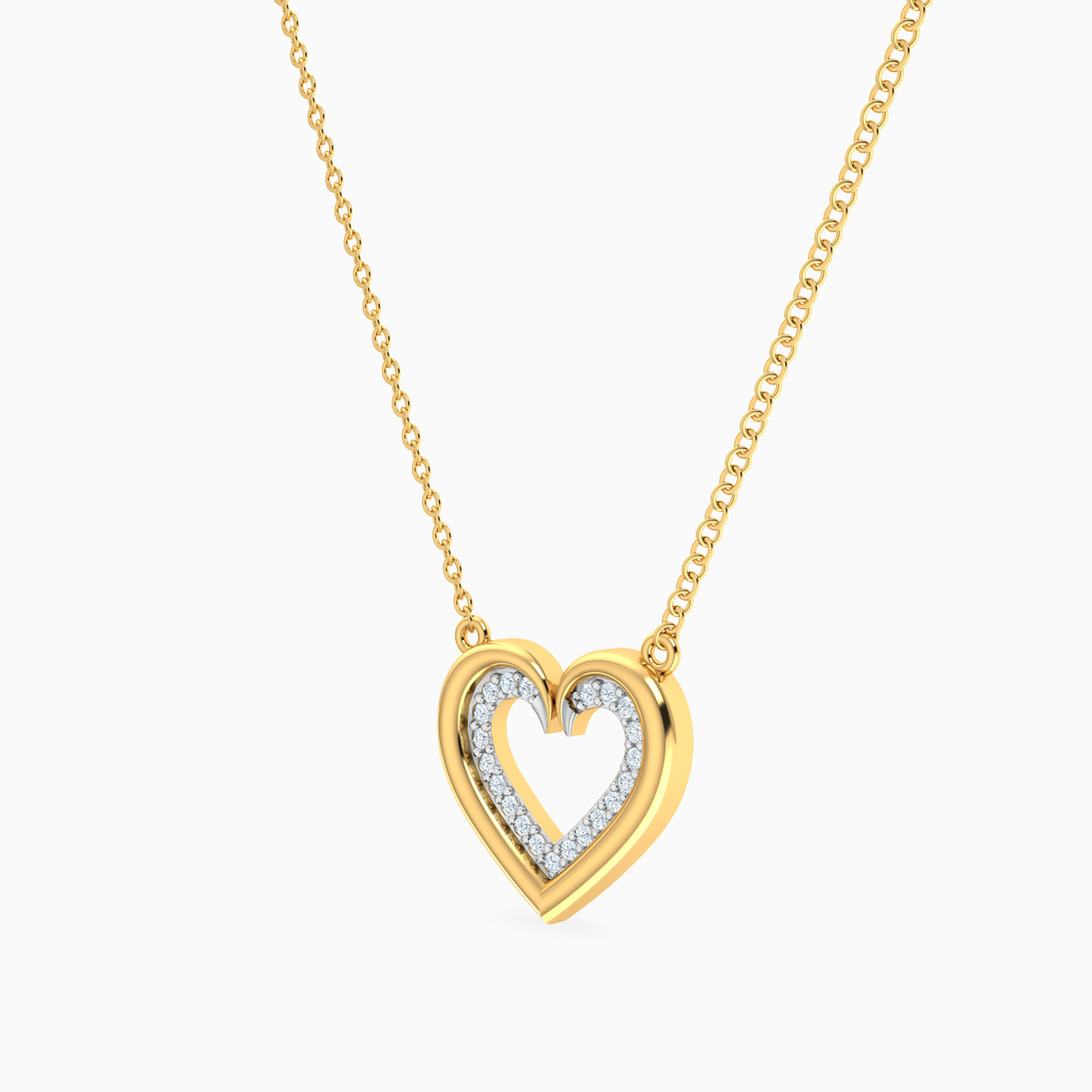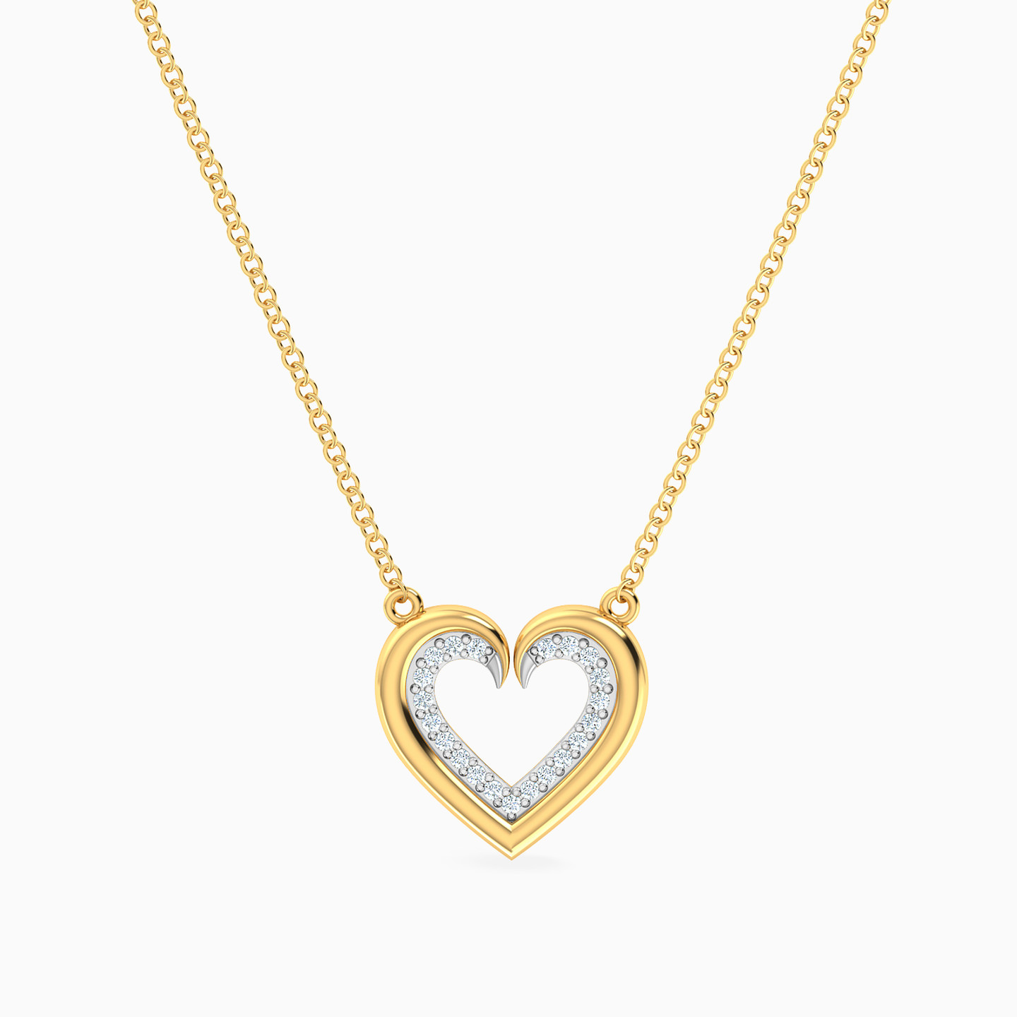 Experience the magic of entwined hearts with this 18-karat yellow gold pendant from Miss L' inspired by love's perfect union! It features a delicate chain and a heart-shaped silhouette as a pendant that is made of two sleek gold frames on the outside and an inner layer made of dazzling brilliant cut diamonds, creating the captivating dance of two hearts in harmony. This celebration of love's exquisite embrace makes the perfect gift for a loved one this Valentine’s Day.