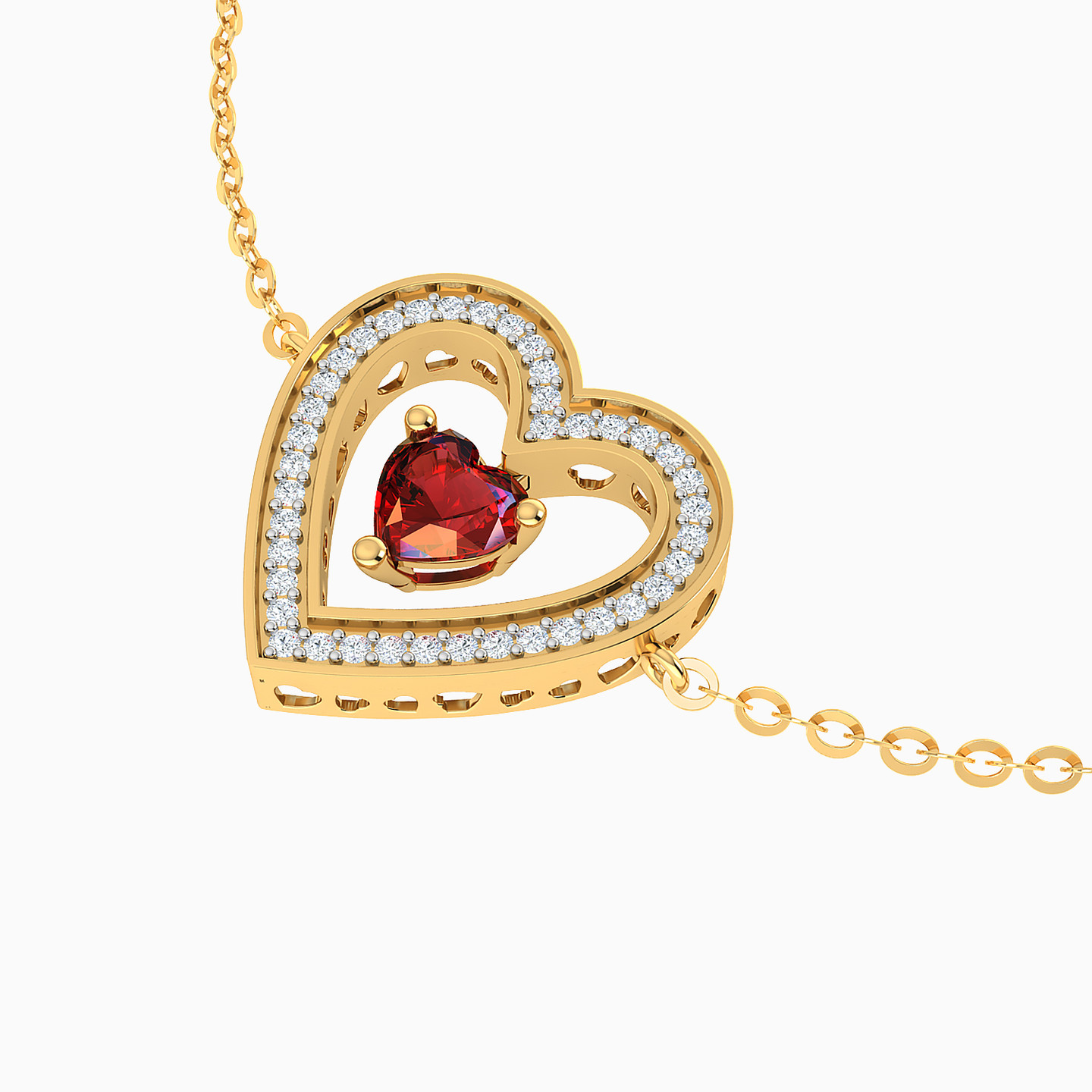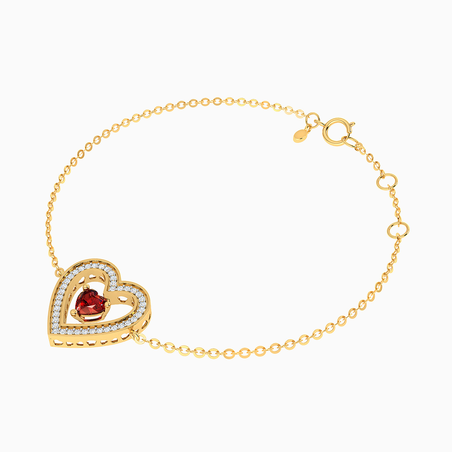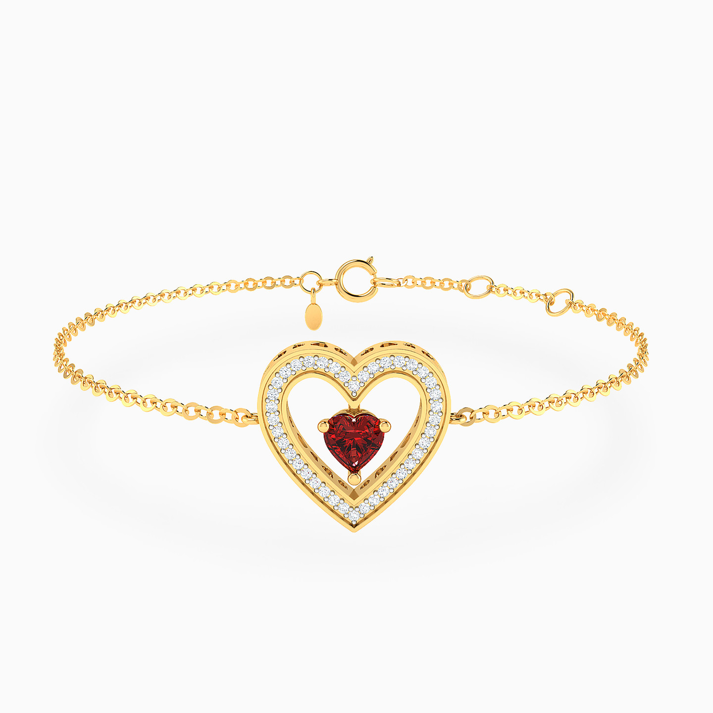 A quiet kind of romance, captured in a heart. From Lazurde Diamonds, this chain bracelet features a vivid red heart-shaped stone embraced by a halo of diamonds, all set in a warm yellow gold tone. Delicate yet full of sentiment, it’s the kind of piece chosen for a moment that matters — a meaningful gift for someone who deserves something personal and sincere.