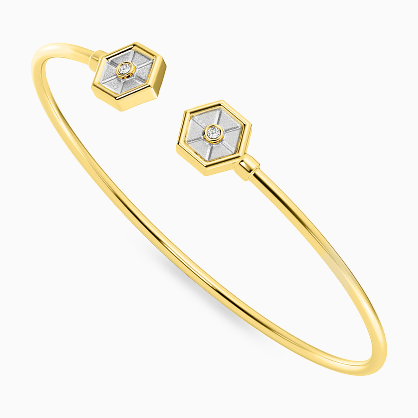 Discover affordable glamour and timeless style with this piece from Waves! This gold-plated cuff bracelet dazzles with modern geometry, featuring an open-ended design adorned by two elegant hexagon shapes, each set with a brilliant lab-grown diamond at the center for a subtle yet striking sparkle. Perfect for those who love contemporary elegance and geometric flair, it’s a refined statement piece to elevate everyday looks or special occasions.