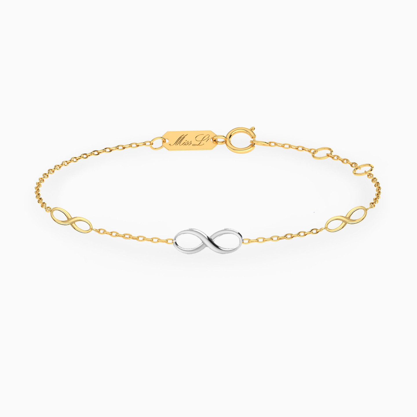 This two-tone infinity bracelet cast in 18-karat yellow and white gold makes a wonderful choice of wear over solid colors like white and black. You can wear it solo or stacked with similar pieces from our collection. This piece from Miss L’ makes a fitting choice for an AM to PM look.