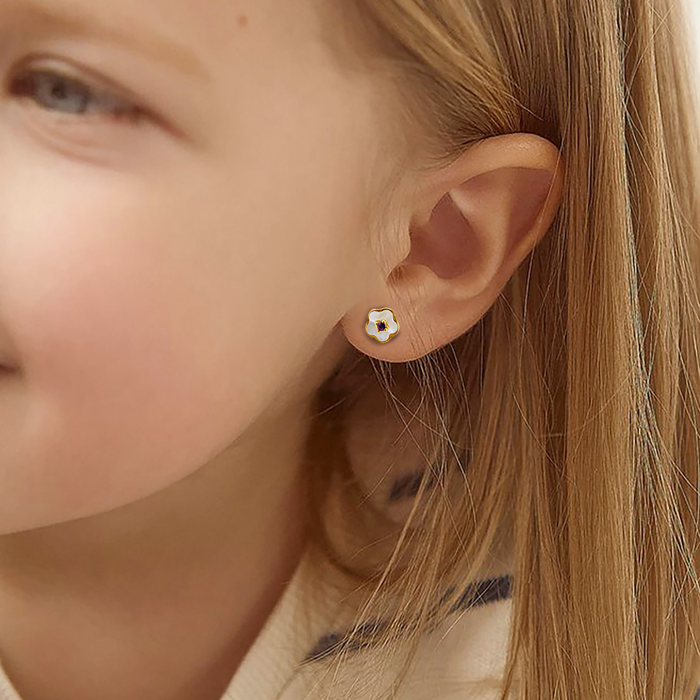 A tiny bloom for your little one. These Miss L’ earrings feature delicate white enamel flowers set in golden outlines—lightweight, safe, and full of charm. Designed for everyday sparkle with a soft, playful touch, they make a precious gift for a little girl’s first earrings or a special occasion.