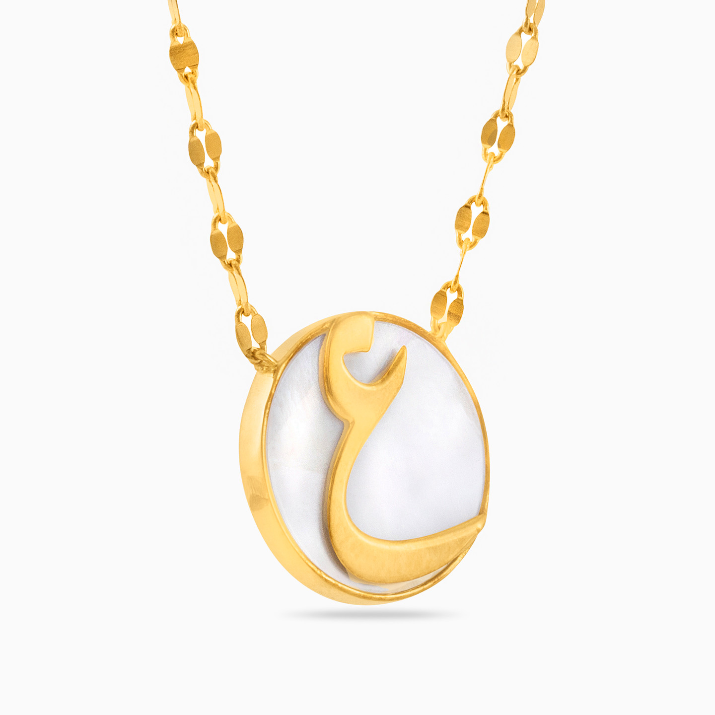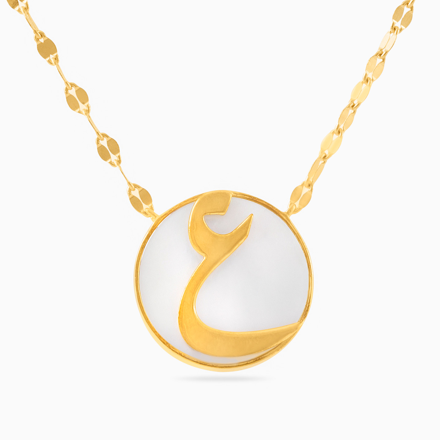 Make your style personal with this eye-catching pendant necklace from L'azurde Instyle. The Ayn letter in Arabic is outlined in 18-karat yellow gold and sits at the forefront of a gorgeous mother of pearl stone, suspended from a shimmering 18-karat yellow gold chain. We suggest adding it to your everyday attire for a look that always garners attention.