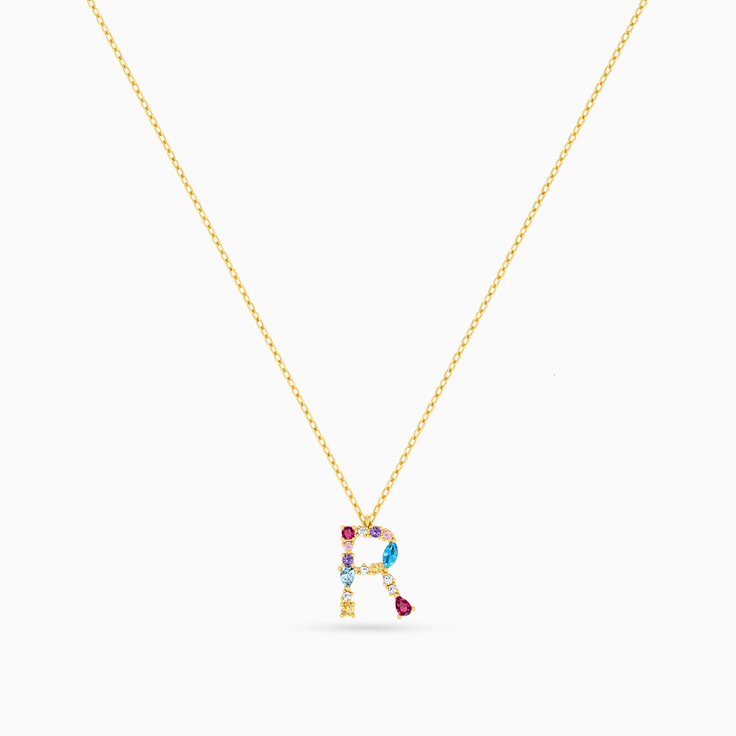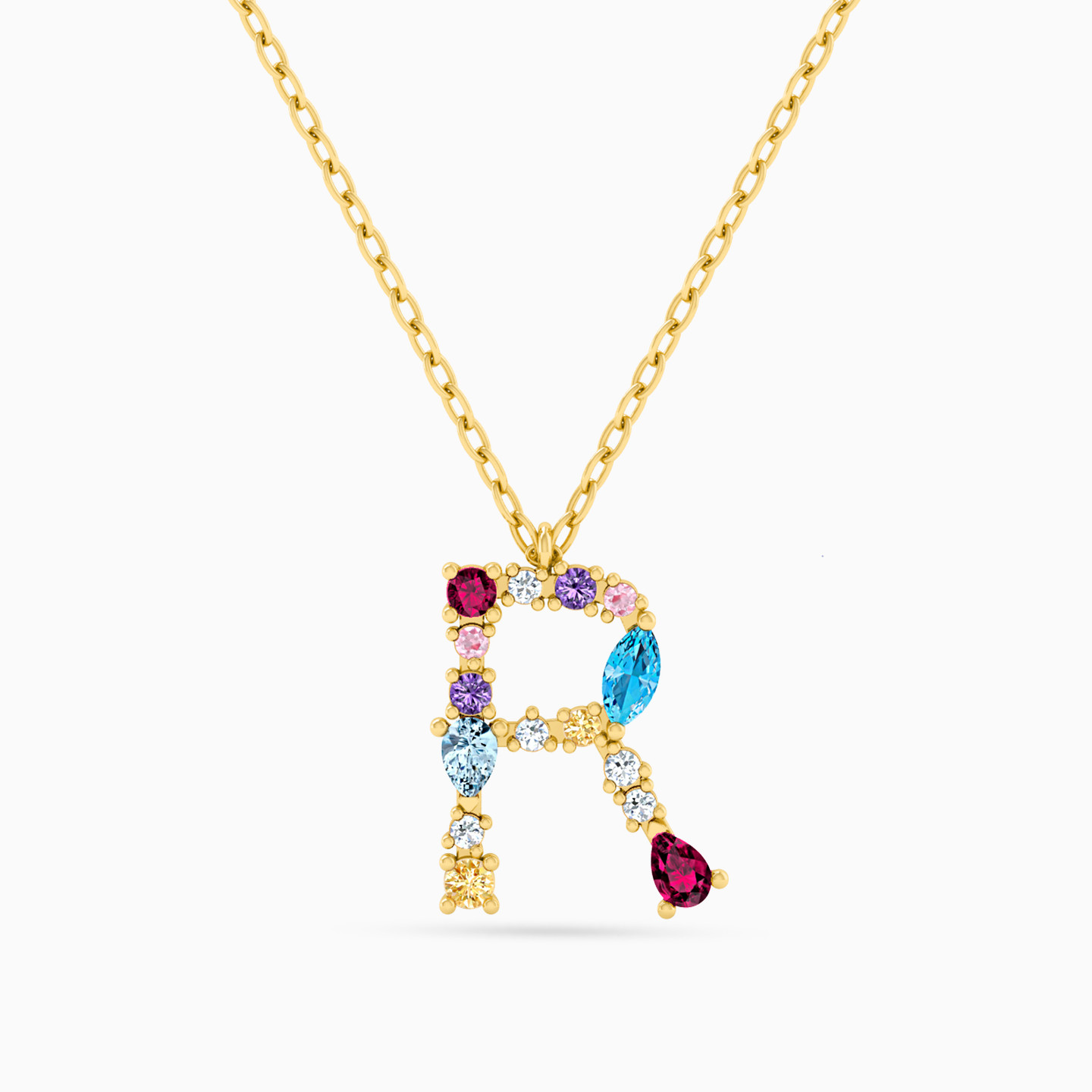 سلسلة ذهب حرف R عيار 18 قيراط مزينة بالأحجار الملونة