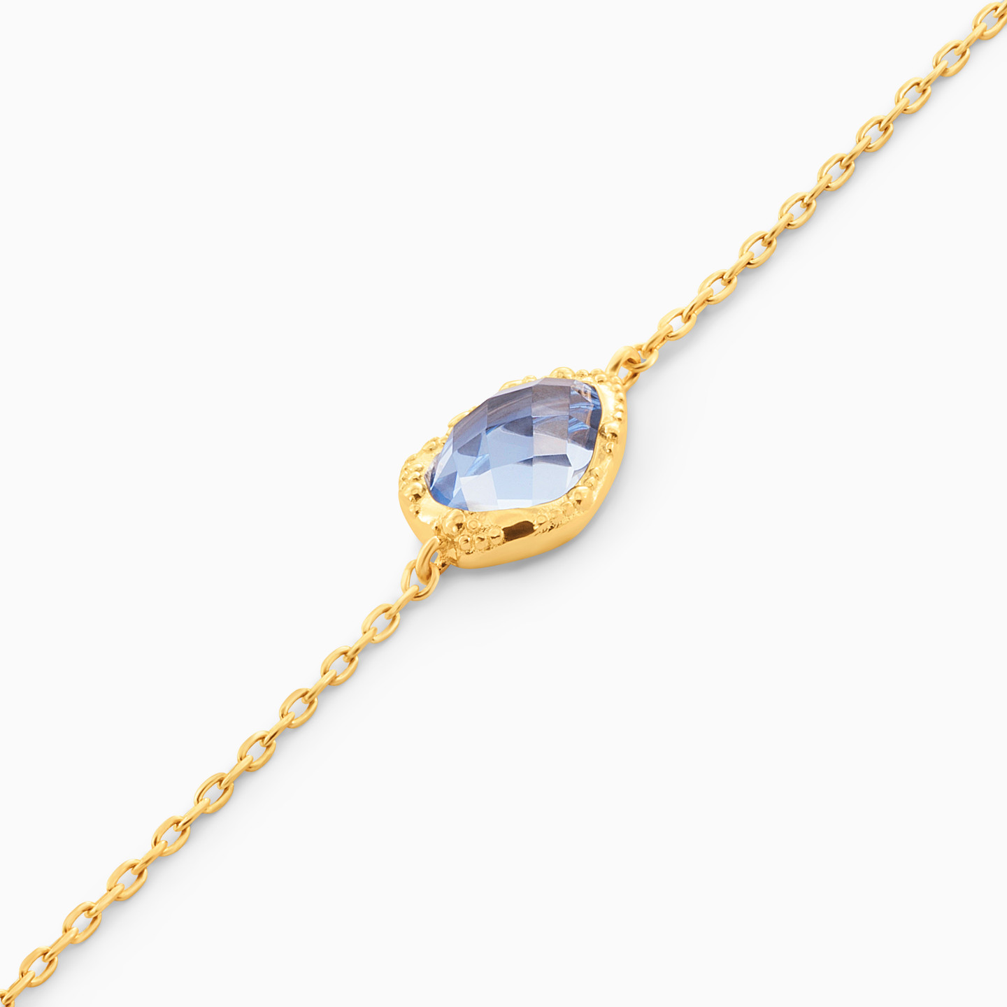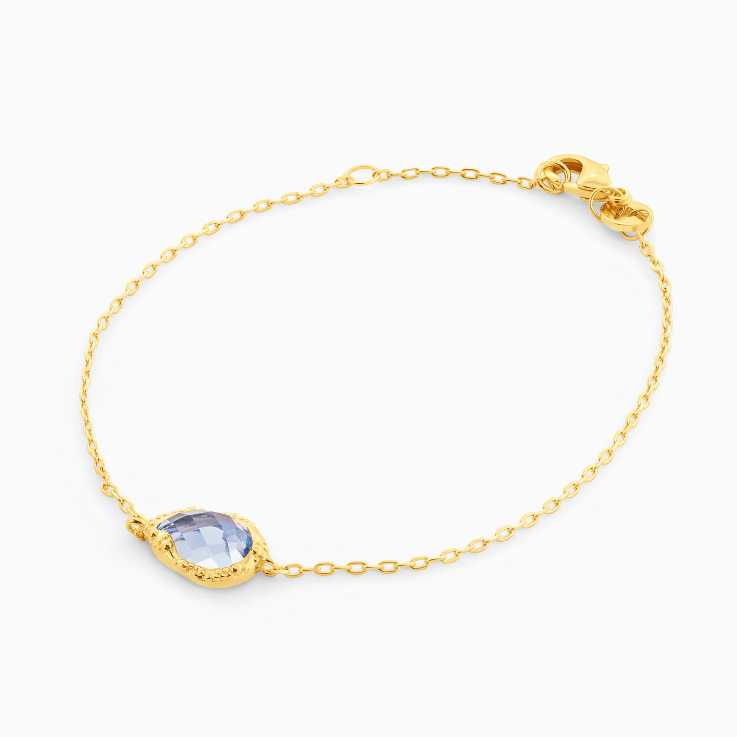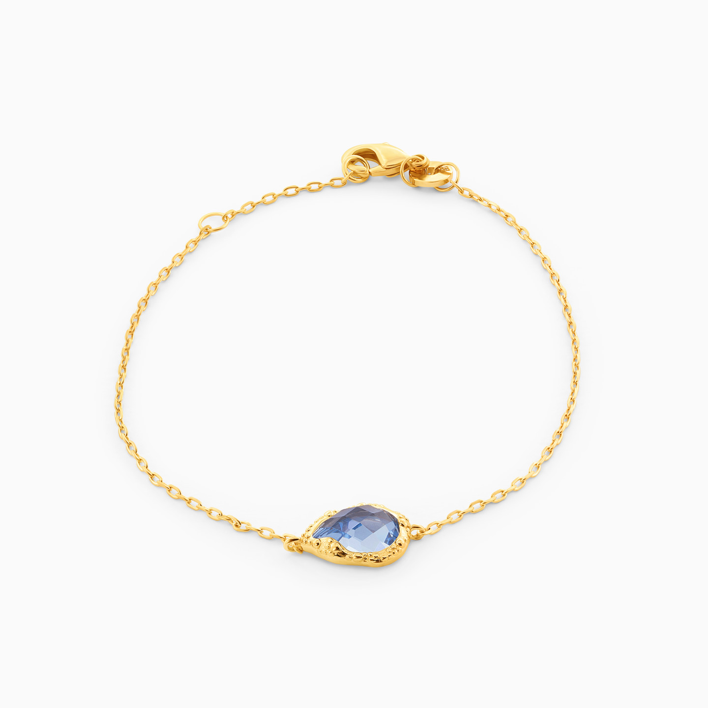 Add a pop of color to your wardrobe by wrapping this captivating chain bracelet from Waves around your wrist. A stunning multi-faceted pear-shaped colored stone sits horizontally at the center of this yellow gold plated chain bracelet, adding color and texture to the dainty chain design. We suggest letting this piece shine solo with business looks or layering it with yellow gold bangles for a chic vibe that captures attention.