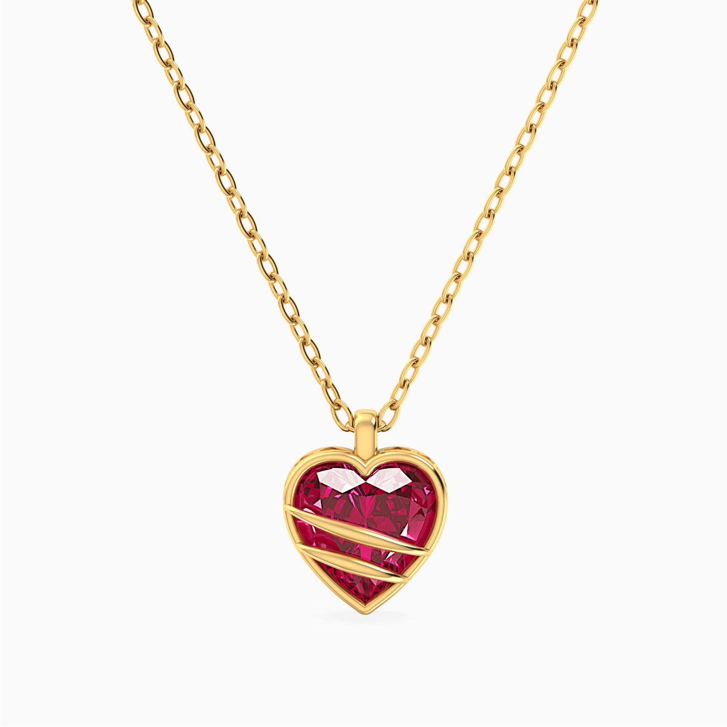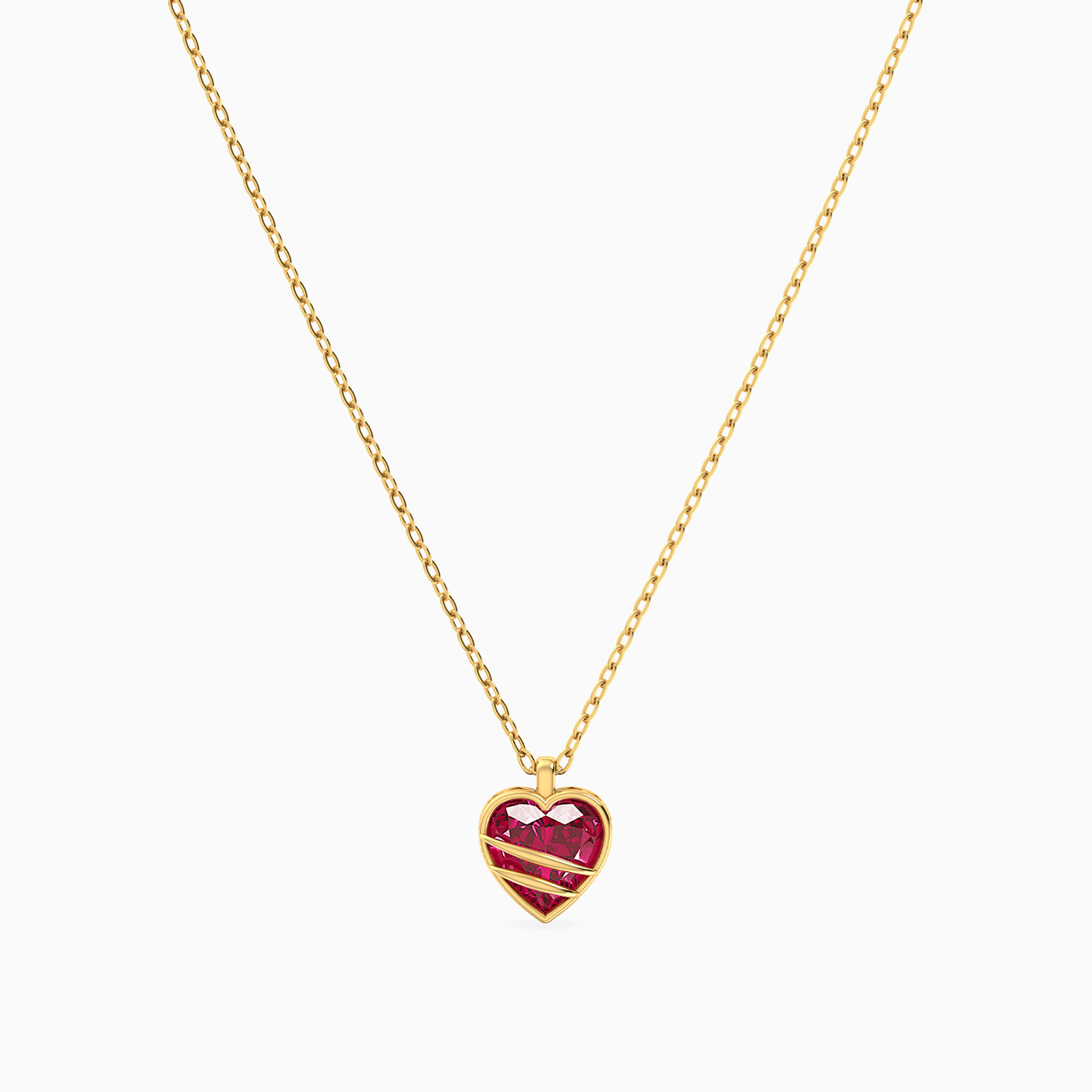 Ignite the flames of passion with this 18-karat yellow gold pendant necklace from Miss L'! This elegant necklace features a heart-shaped pendant with a vibrant red-colored stone, accented by delicate gold lines. A beautiful blend of classic romance and modern design, it’s perfect for any occasion.