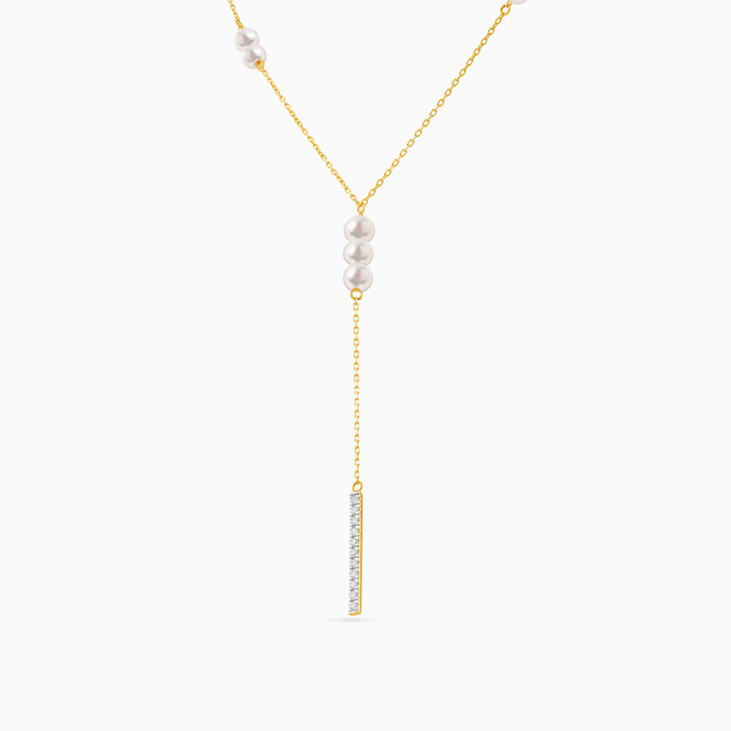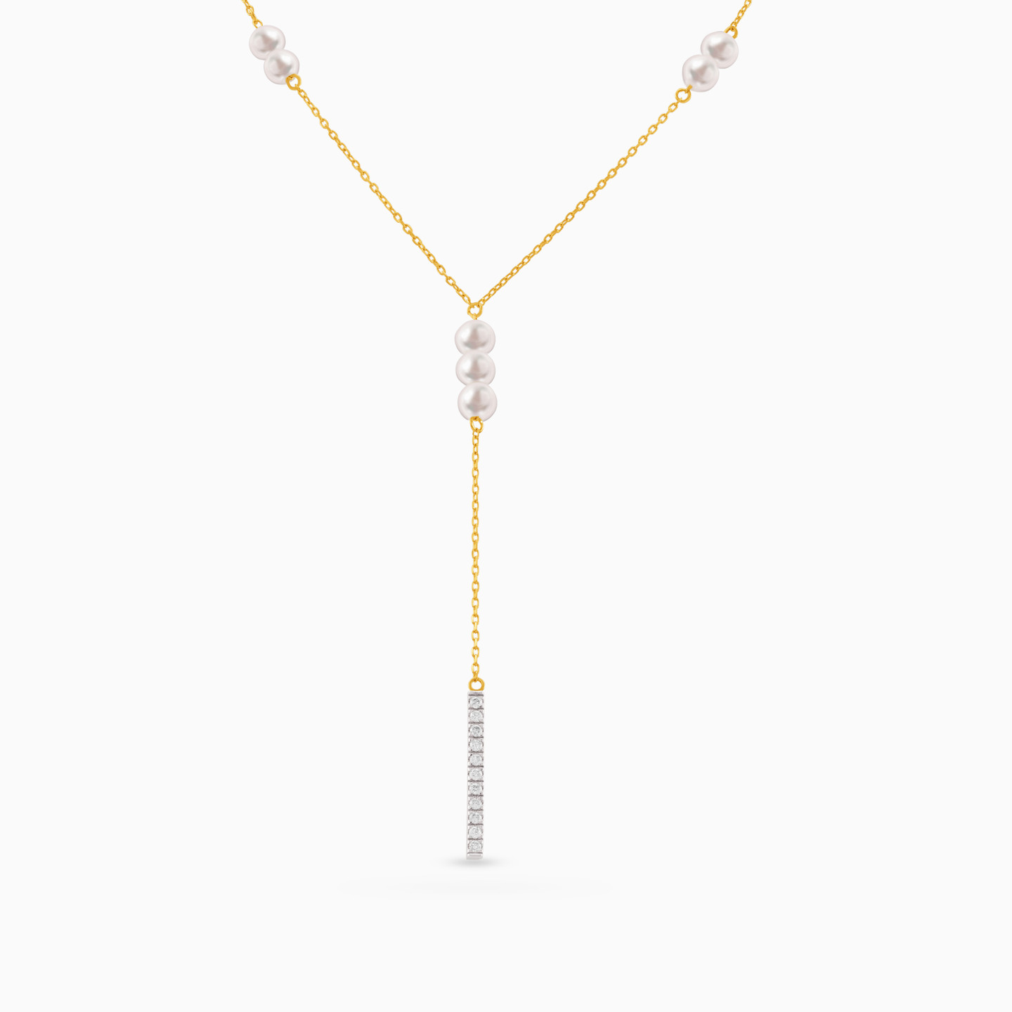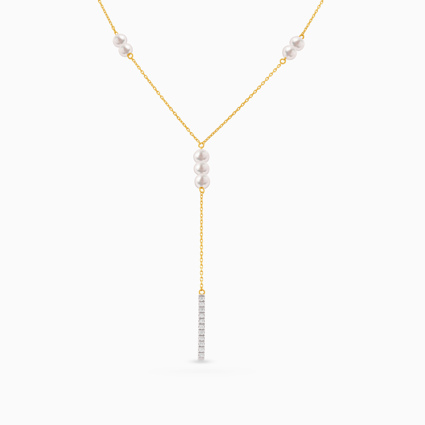 Add elegance and femininity to your look by wearing this sophisticated pearl and diamond lariat necklace from L'azurde Diamonds. Timeless pearls and a bar of dainty diamonds sparkle along this stunning 18-karat yellow gold necklace, offering plenty of styling options for daytime or evening looks. We suggest pairing this piece with chic pearl earrings for subtle glamour that offers irresistible allure.