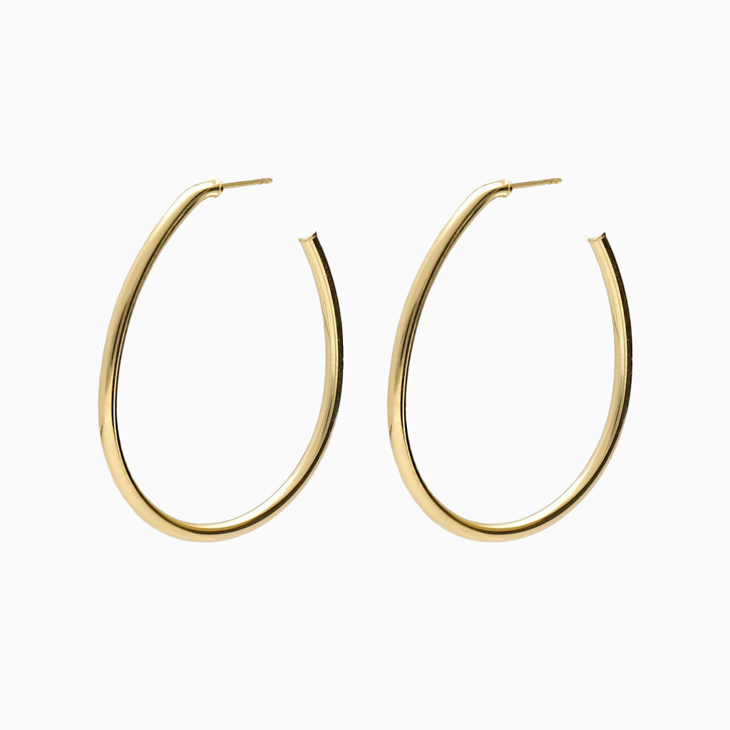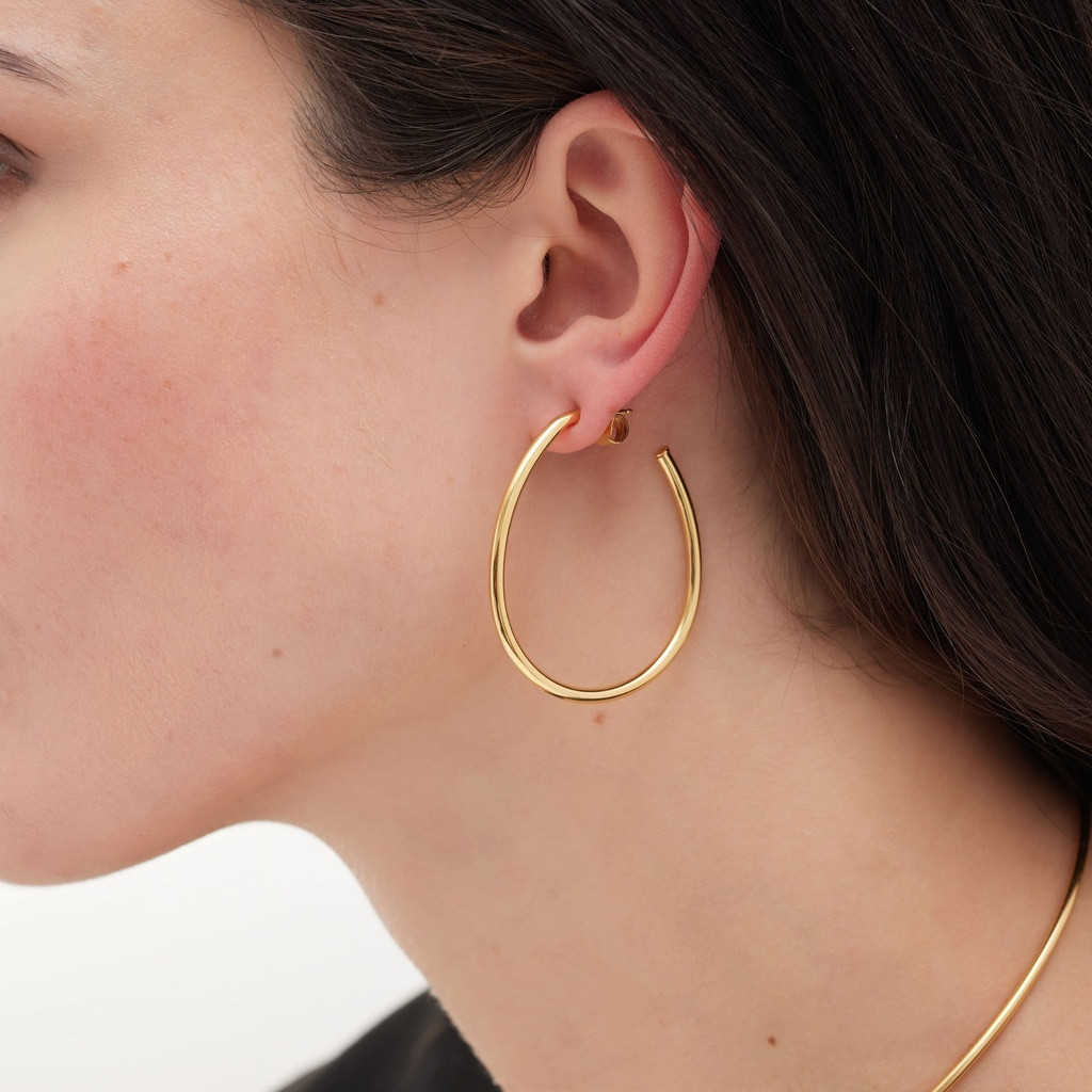 Grace in motion. These Waves hoop earrings in yellow gold plating take on an elegant teardrop curve, merging simplicity with fluid form. Their sculpted silhouette flatters every face, adding a soft shimmer that moves with you. A timeless gift for those who love effortless sophistication.