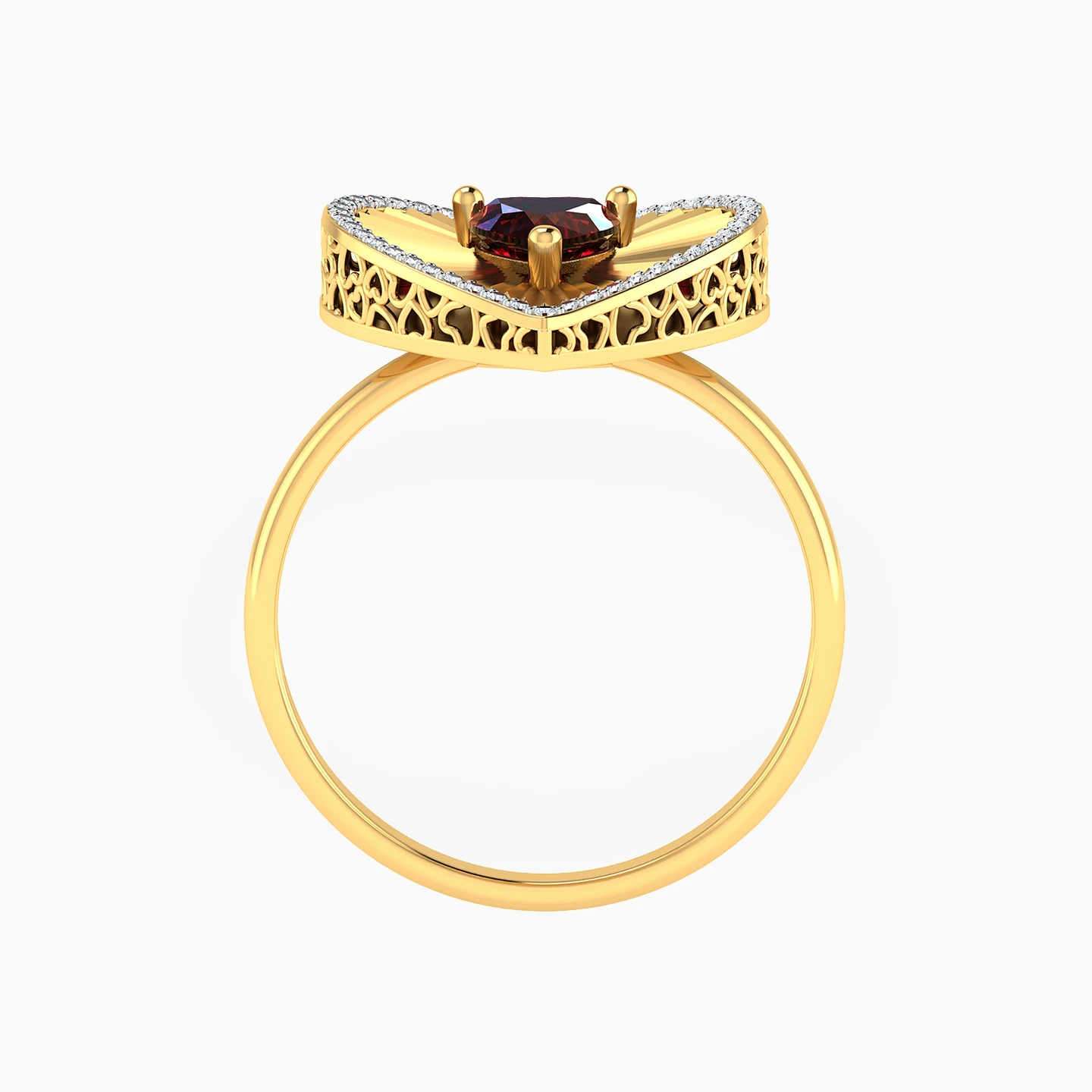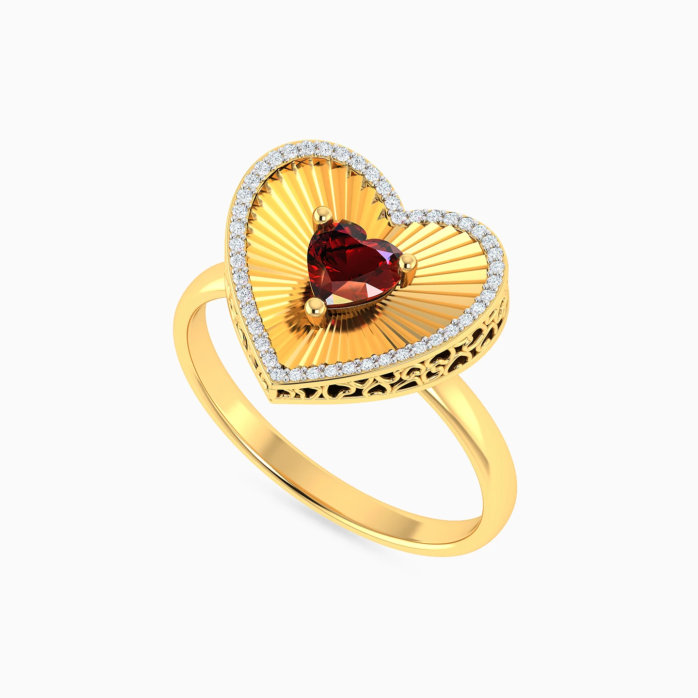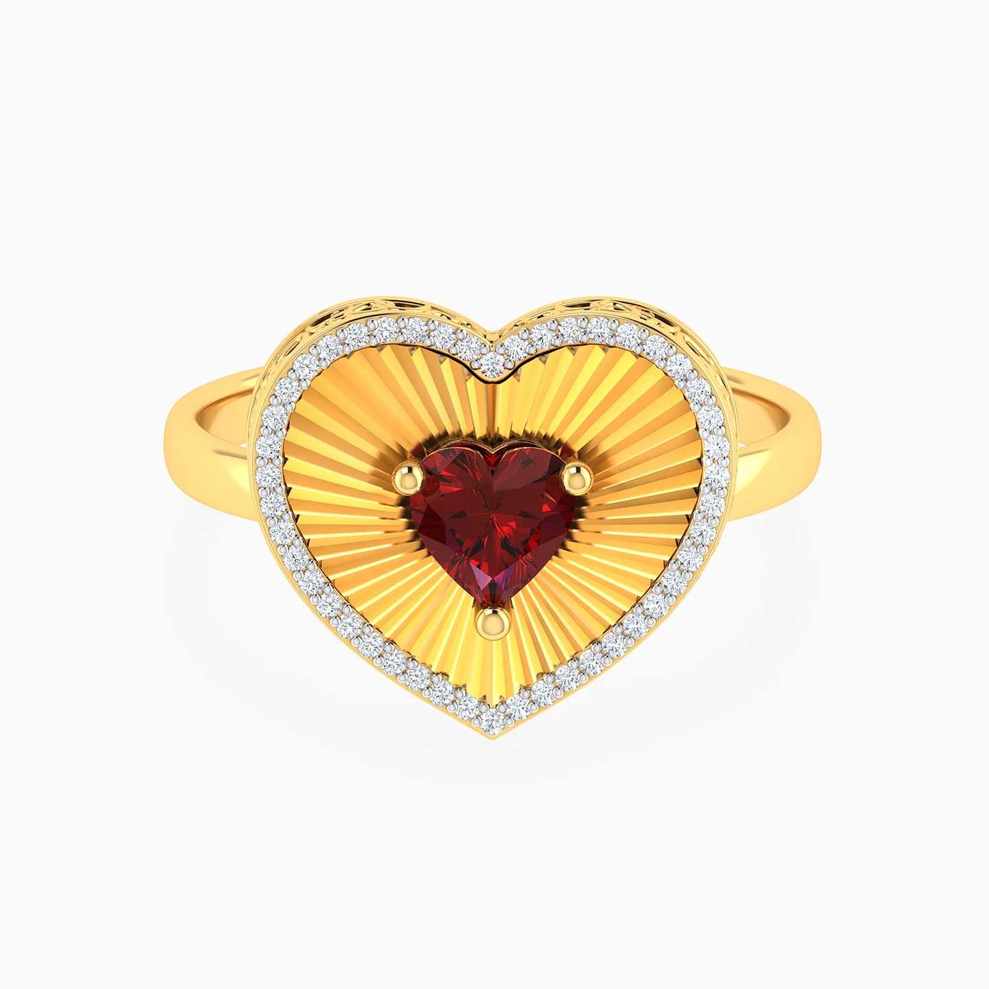 Crafted by Lazurde Diamonds, this yellow gold ring centers on a heart-shaped red stone set against a delicately textured background, adding depth and character to the design. A refined frame of brilliant diamonds outlines the heart, enhancing its warmth with subtle brilliance. Intimate and expressive, it rests gently at the neckline as a meaningful gift meant to be cherished.