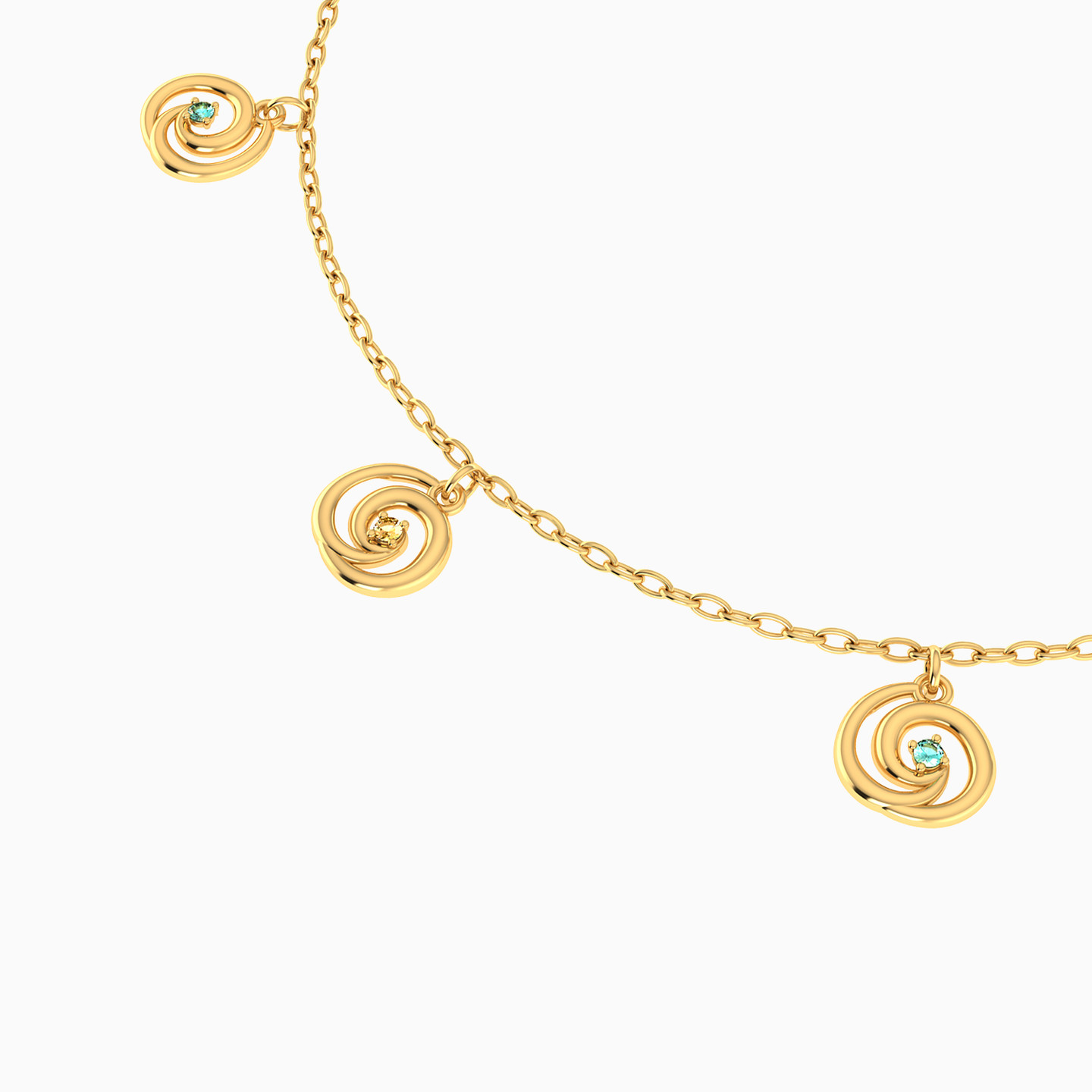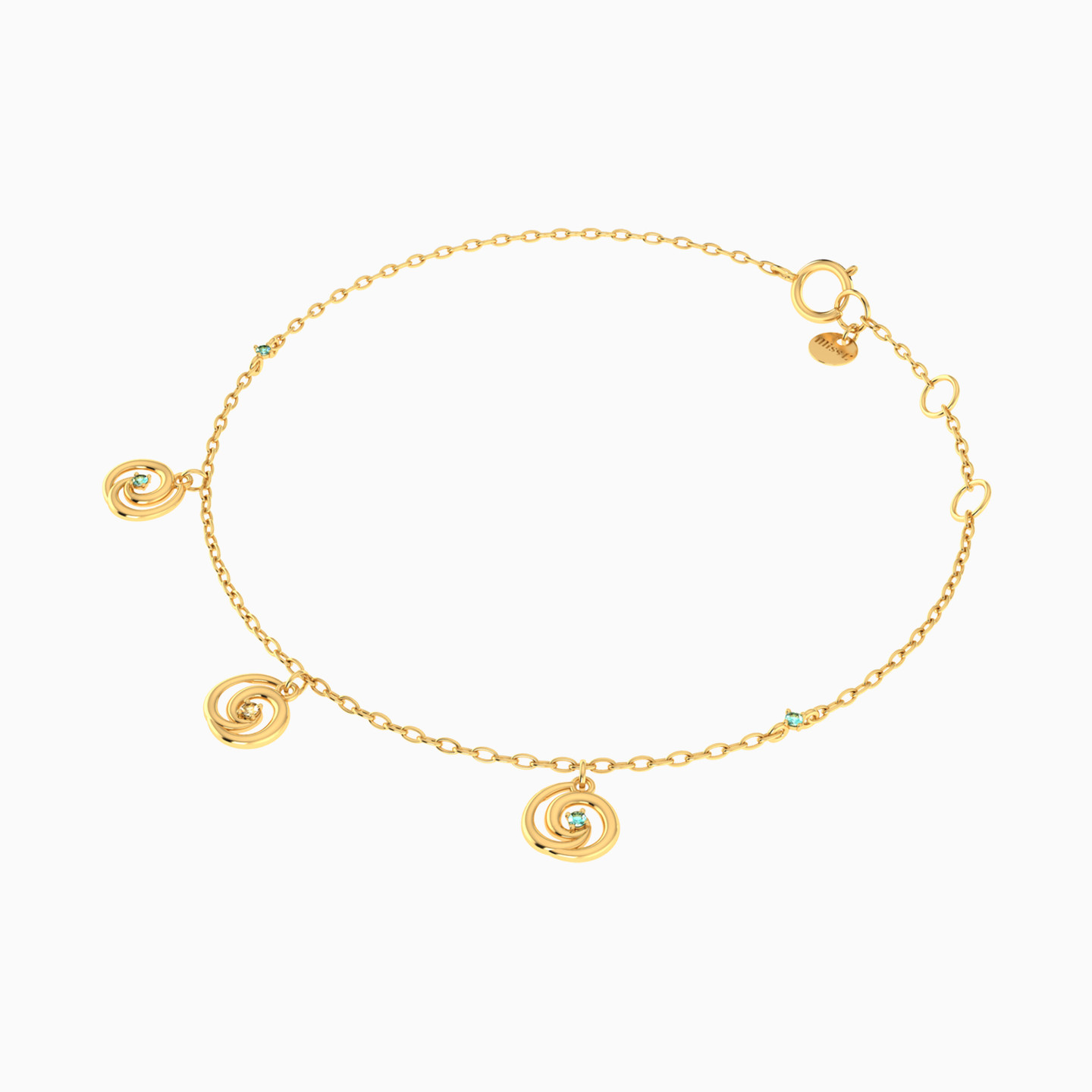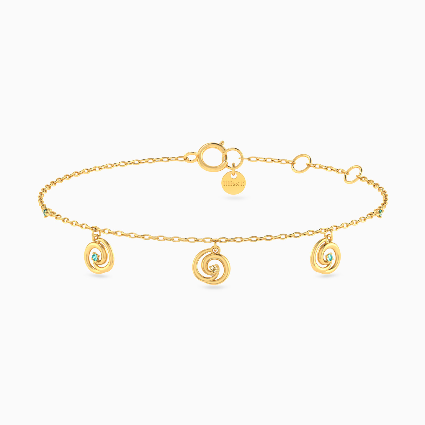 Prepare to be entranced by the whimsical charm of this 14-karat yellow gold chain anklet from Miss L'. This minimalist masterpiece features three mesmerizing spiral-like dangles, each cradling a sparkling round-shaped colored stone. Playfully spaced along the bracelet, these dangles create a captivating dance of light and design that's perfect for anyone who loves to make a stylish and fun statement with their accessories.