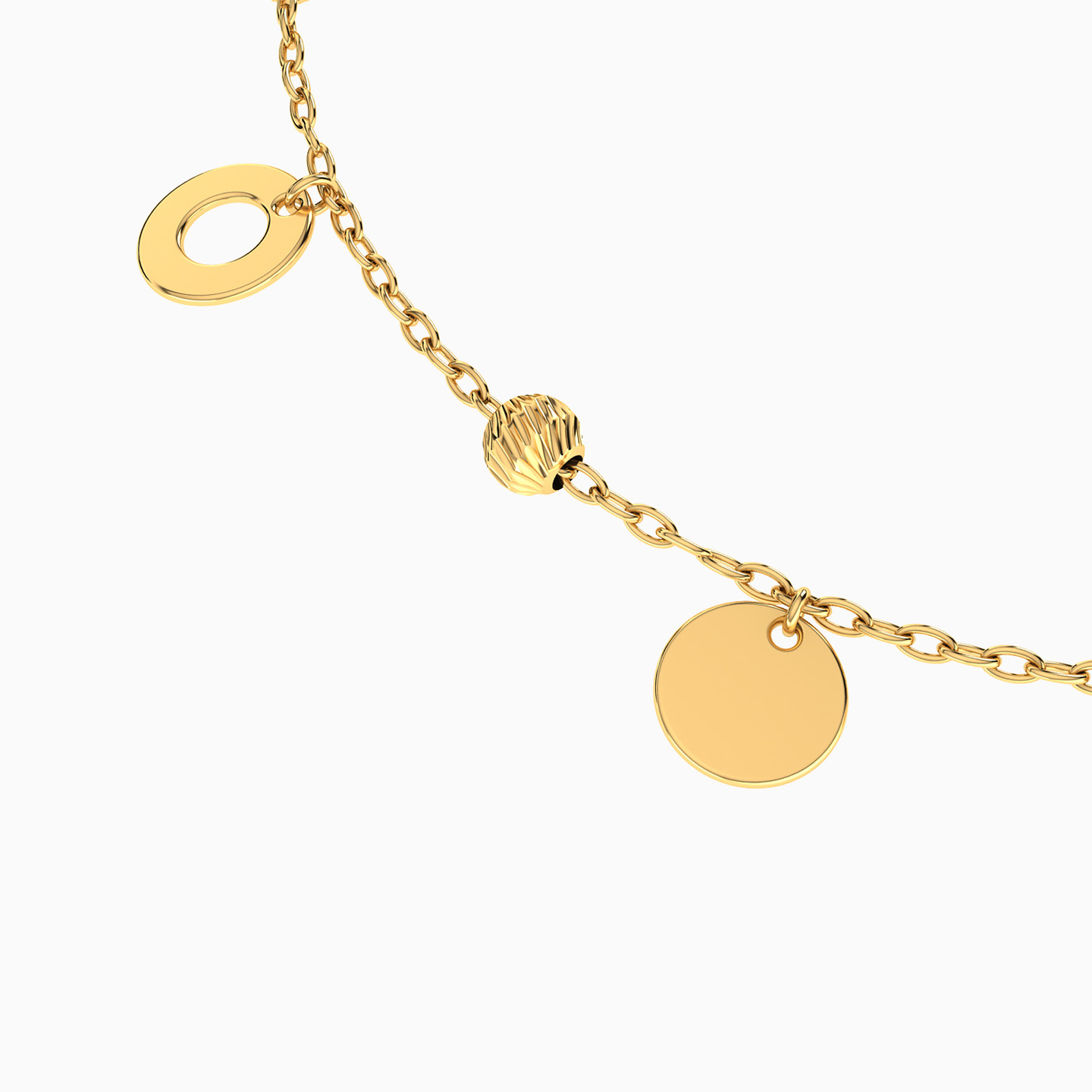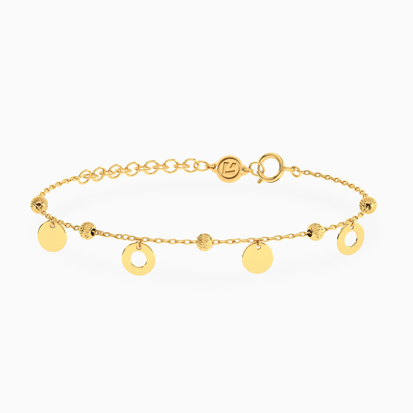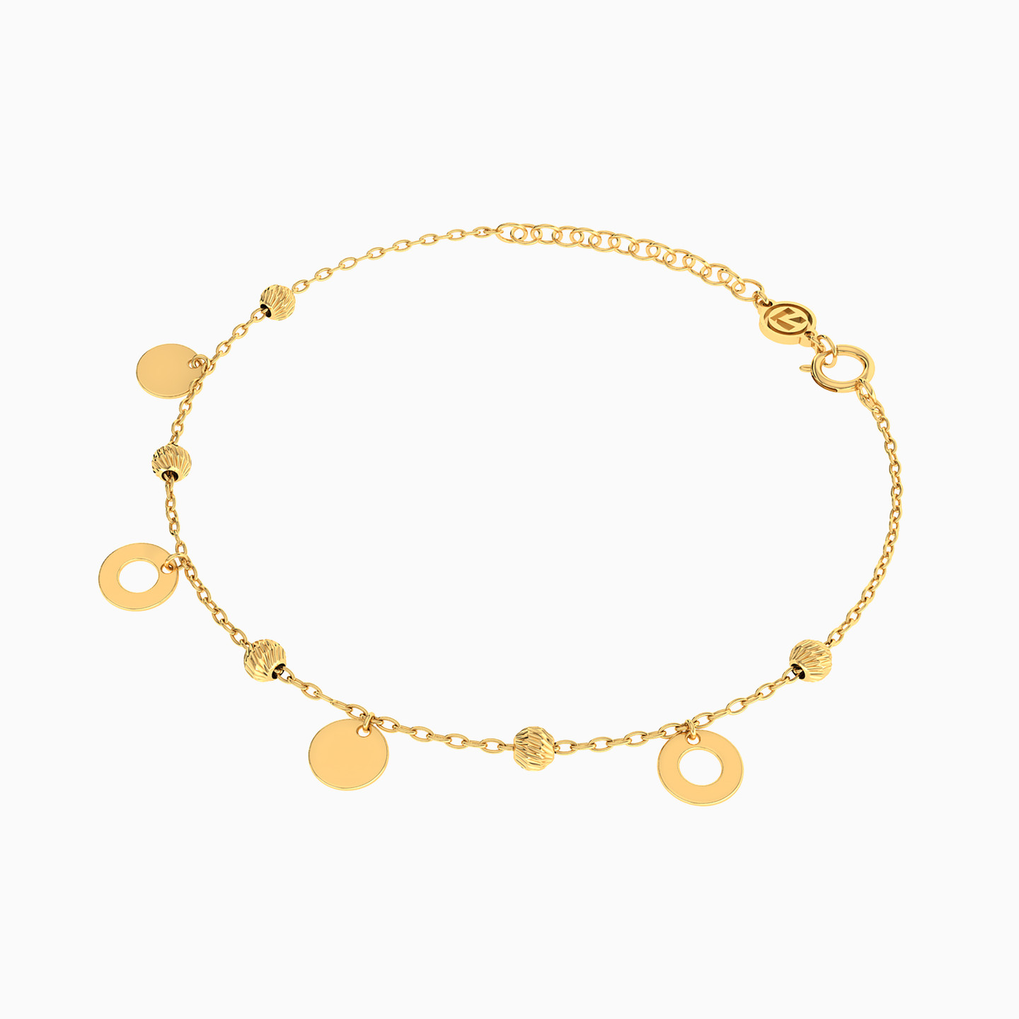 Adding a skip to your step, this circle charms anklet from Miss L’ is an essential piece for your casual wardrobe. Cast in 18-karat yellow gold, it features petite solid and cut work circles. Wear this with a pair of shorts or a basic flowy dress.