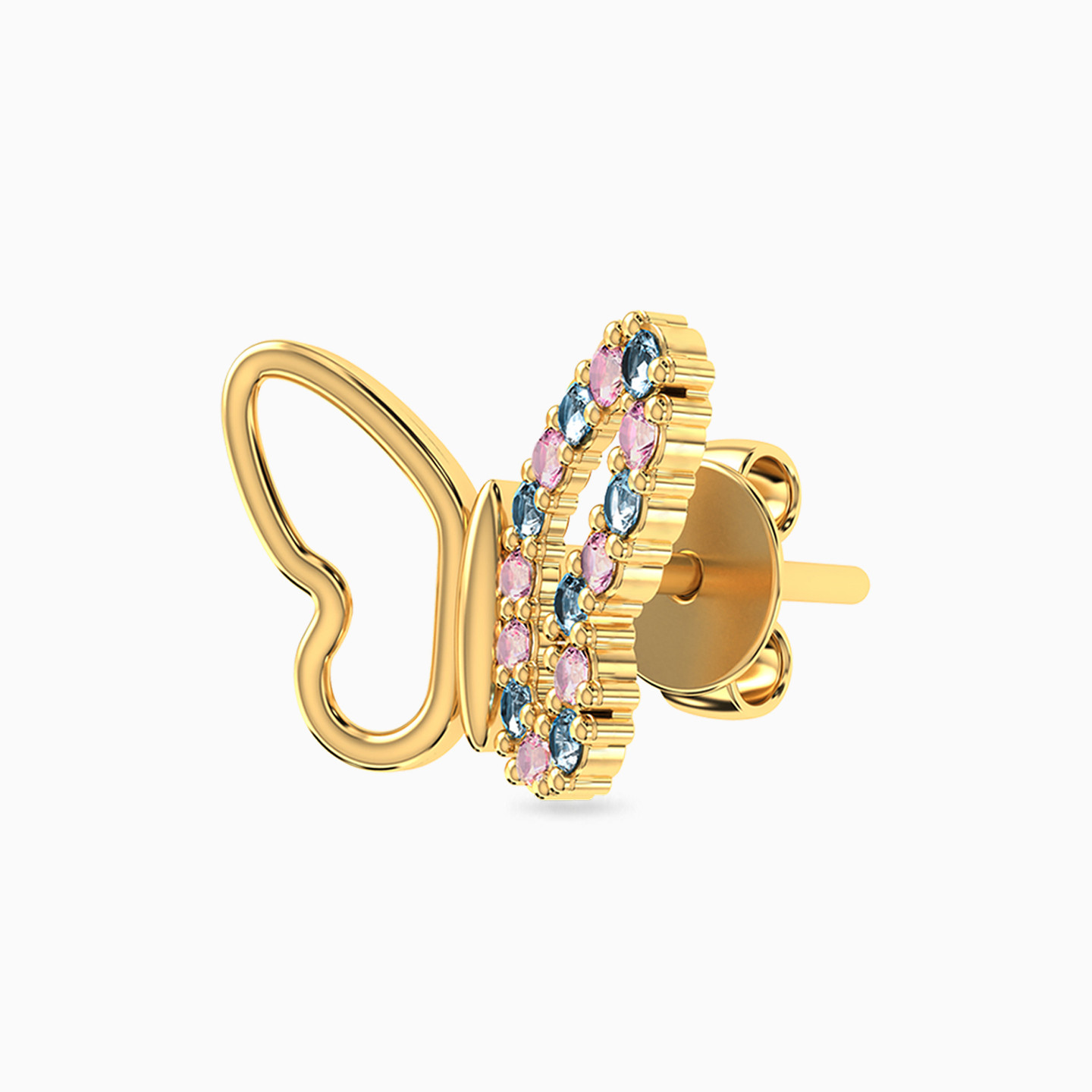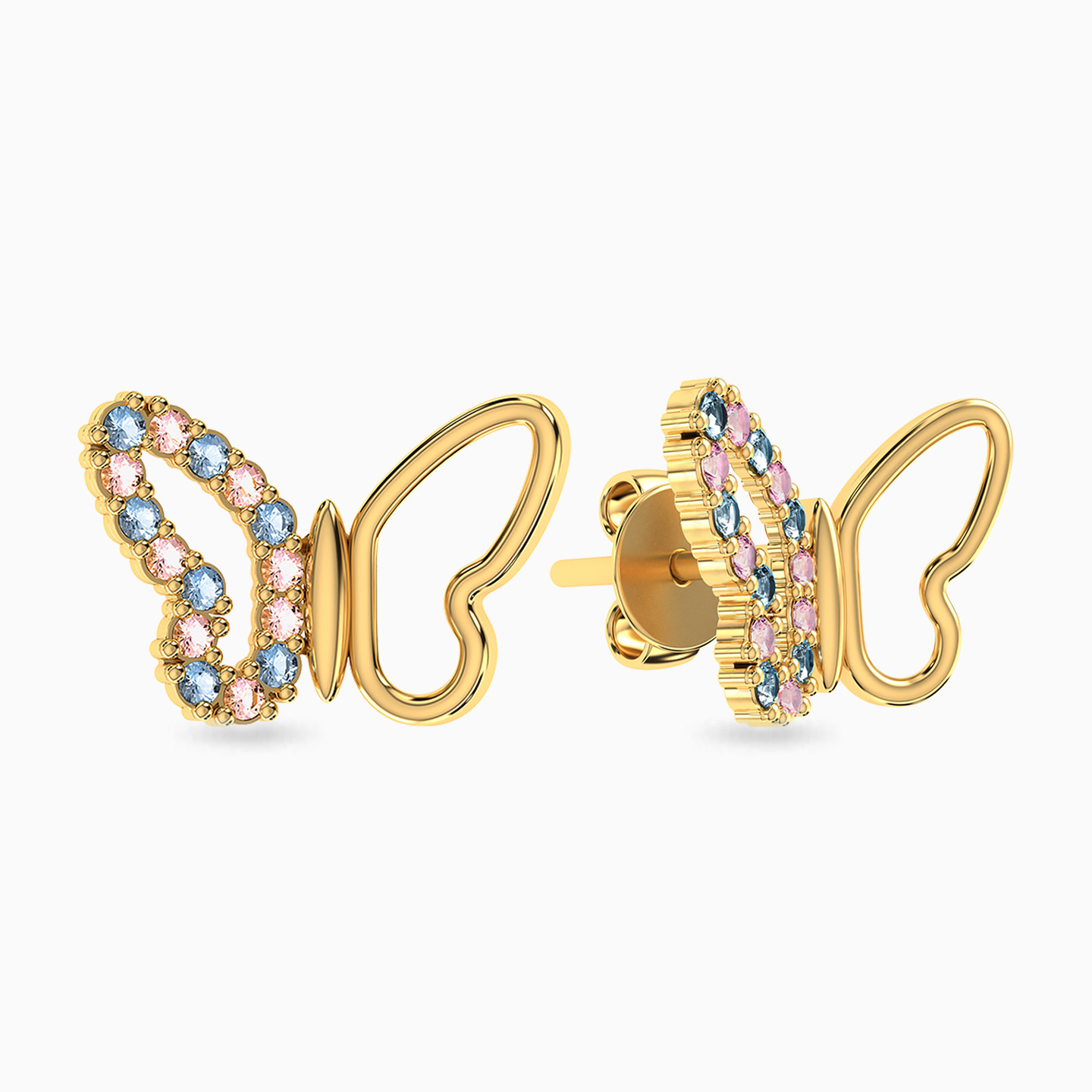 Up your look with a little extra glam with these ear studs from Miss L'. Cast in 18-karat yellow gold, these butterfly studs come partly studded with blue and pink stone. We recommend wearing them with a matching necklace from our collection to complete the set.