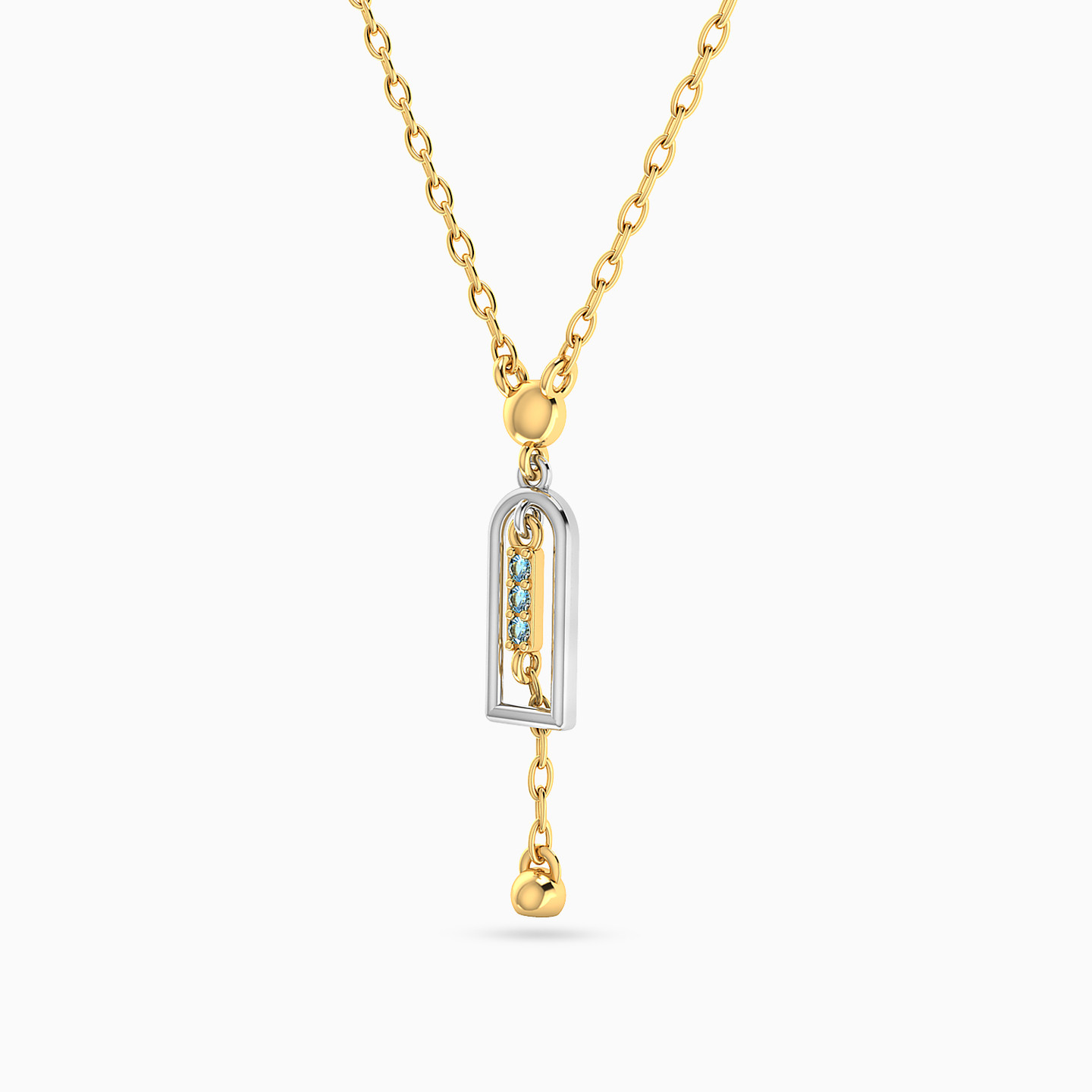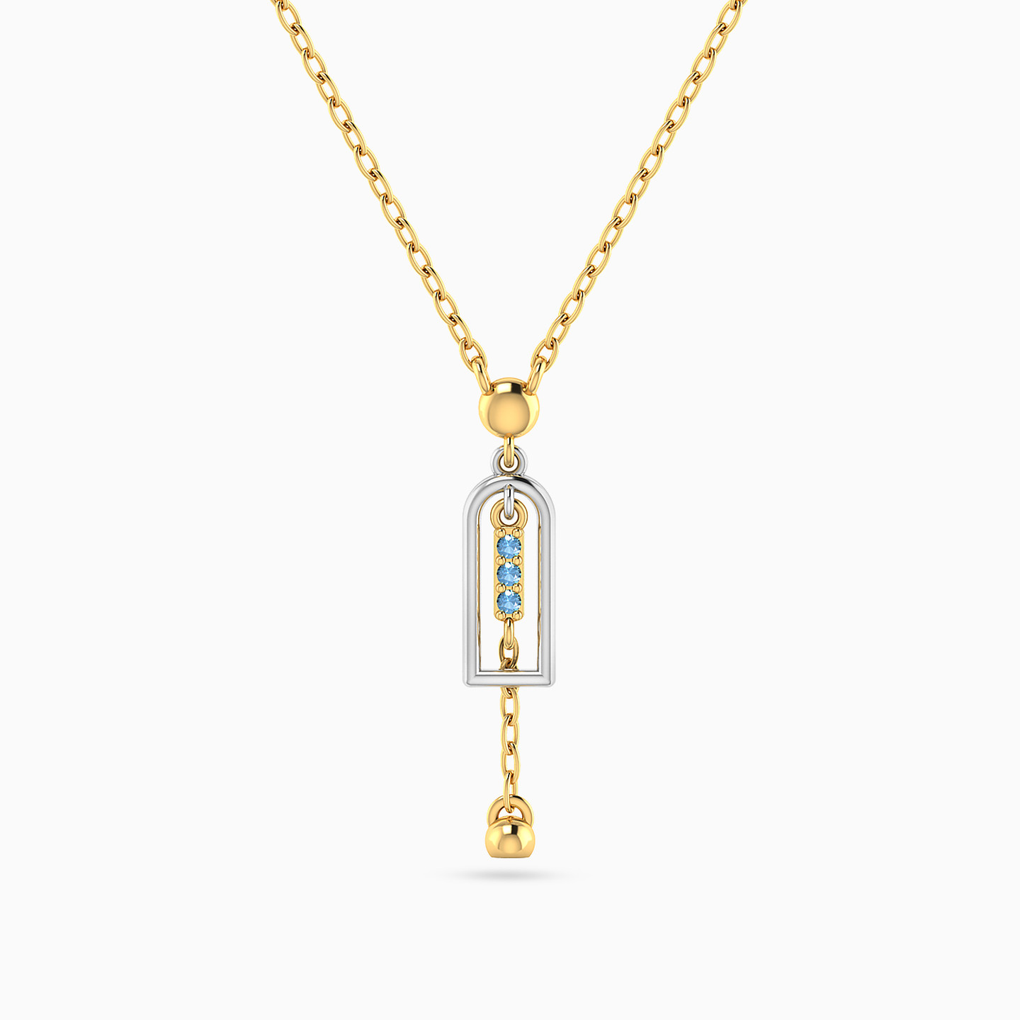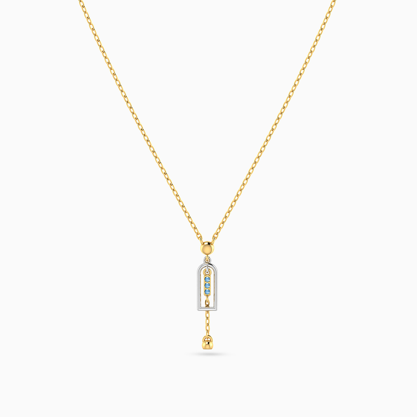 Elegance framed in harmony. This Miss L’ necklace from the Matrix Collection features a pendant shaped like a golden arch outlined in white gold, with a vertical row of blue stones at its center and a delicate golden bead drop below. A graceful design that blends modern charm with timeless sentiment, making it a meaningful gift.