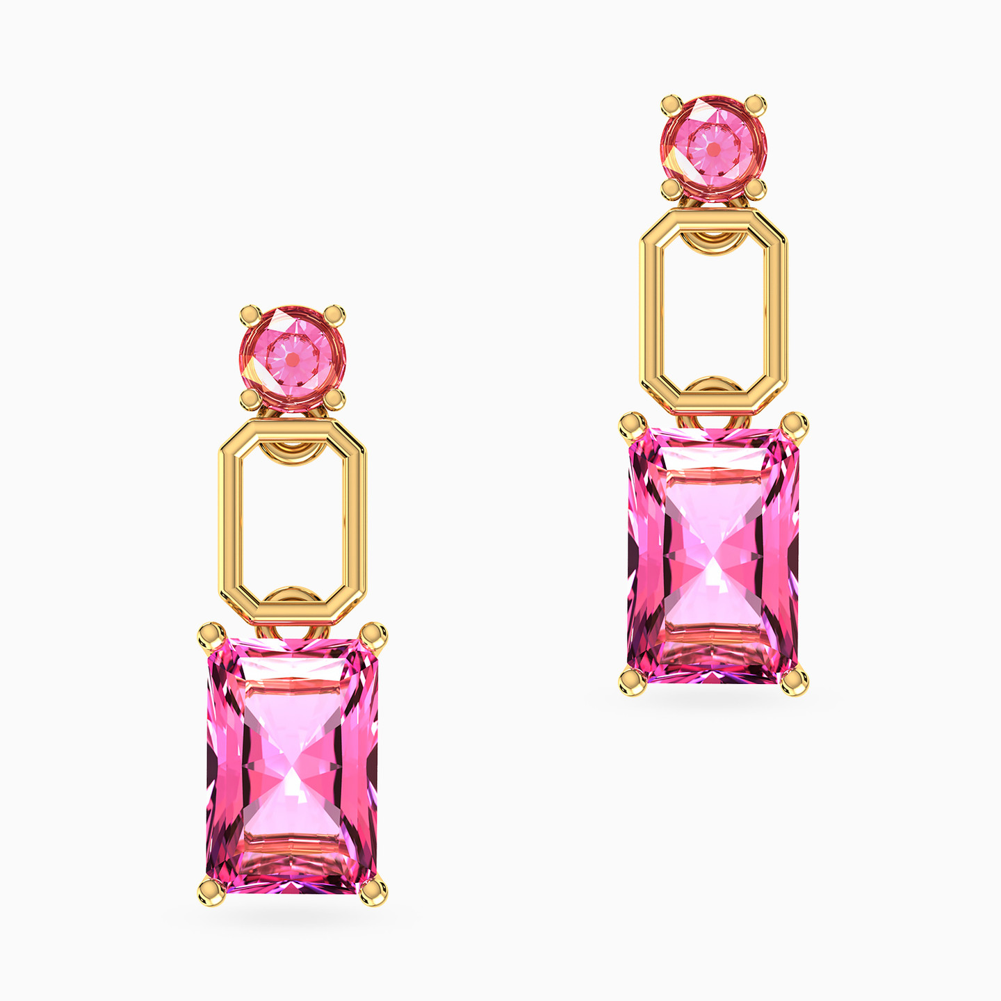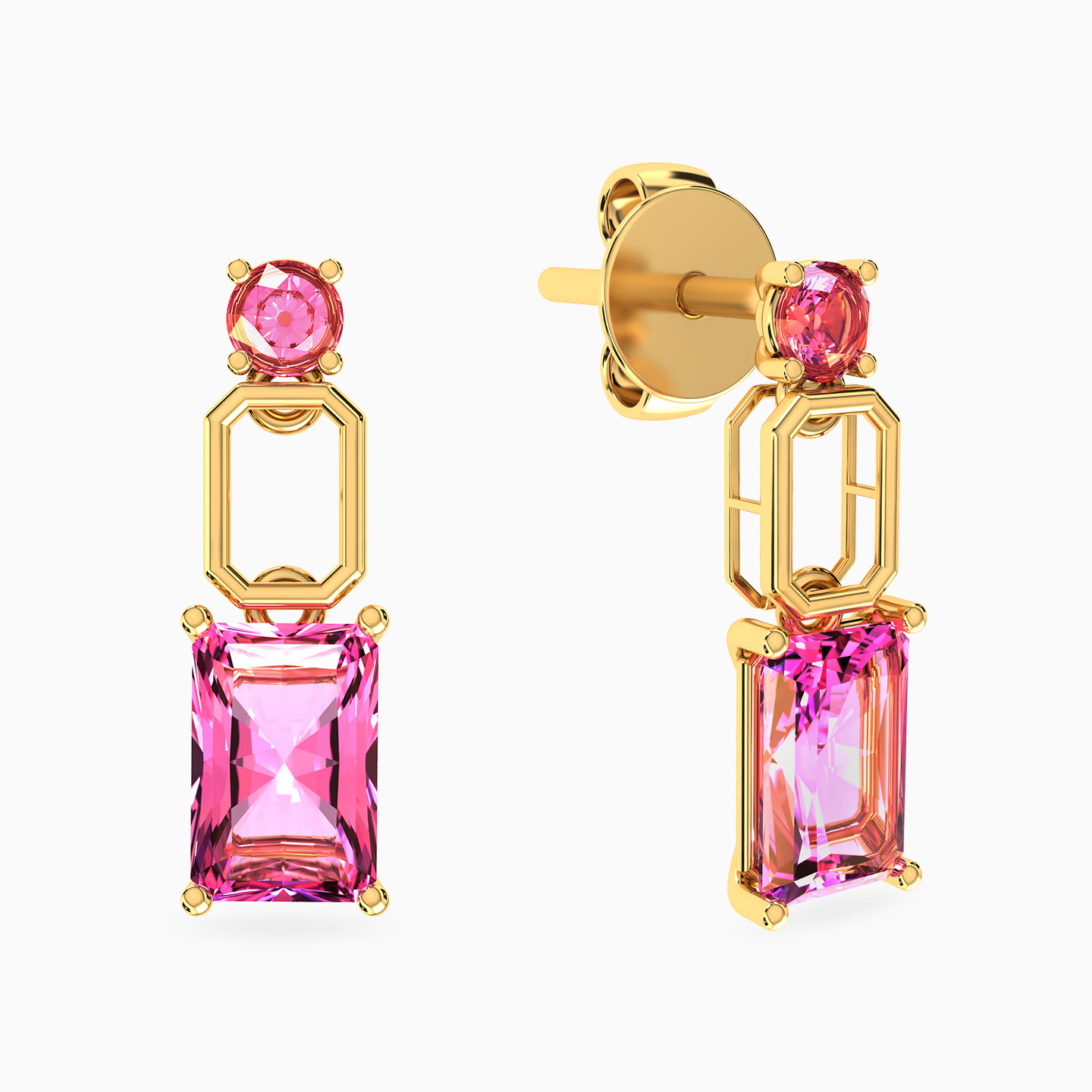 Add luxury and glamour to any outfit with these 14-karat yellow gold drop earrings from Miss L'. At the base, each earring boasts a vibrant round-shaped pink-colored stone, securely cradled by four sleek prongs. Cascading below is a dazzling dangle made of an alluring hexagon-shaped frame connected to a rectangle-shaped pink-colored stone, also set with meticulous precision on four prongs, creating an enchanting play of shapes and colors that will captivate admirers wherever you go. Classy, stylish and absolute show-stoppers!
