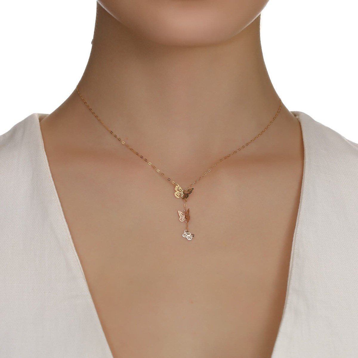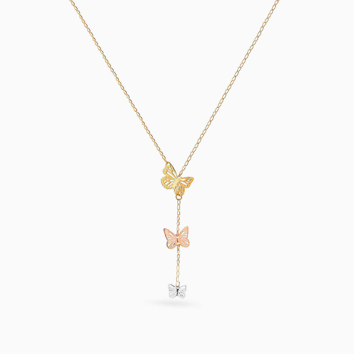 Three butterflies, three whispers of freedom. This charming necklace gracefully flows with a trio of butterflies in yellow, rose, and white gold tones—symbolizing transformation, beauty, and hope. A playful yet elegant touch for everyday radiance.