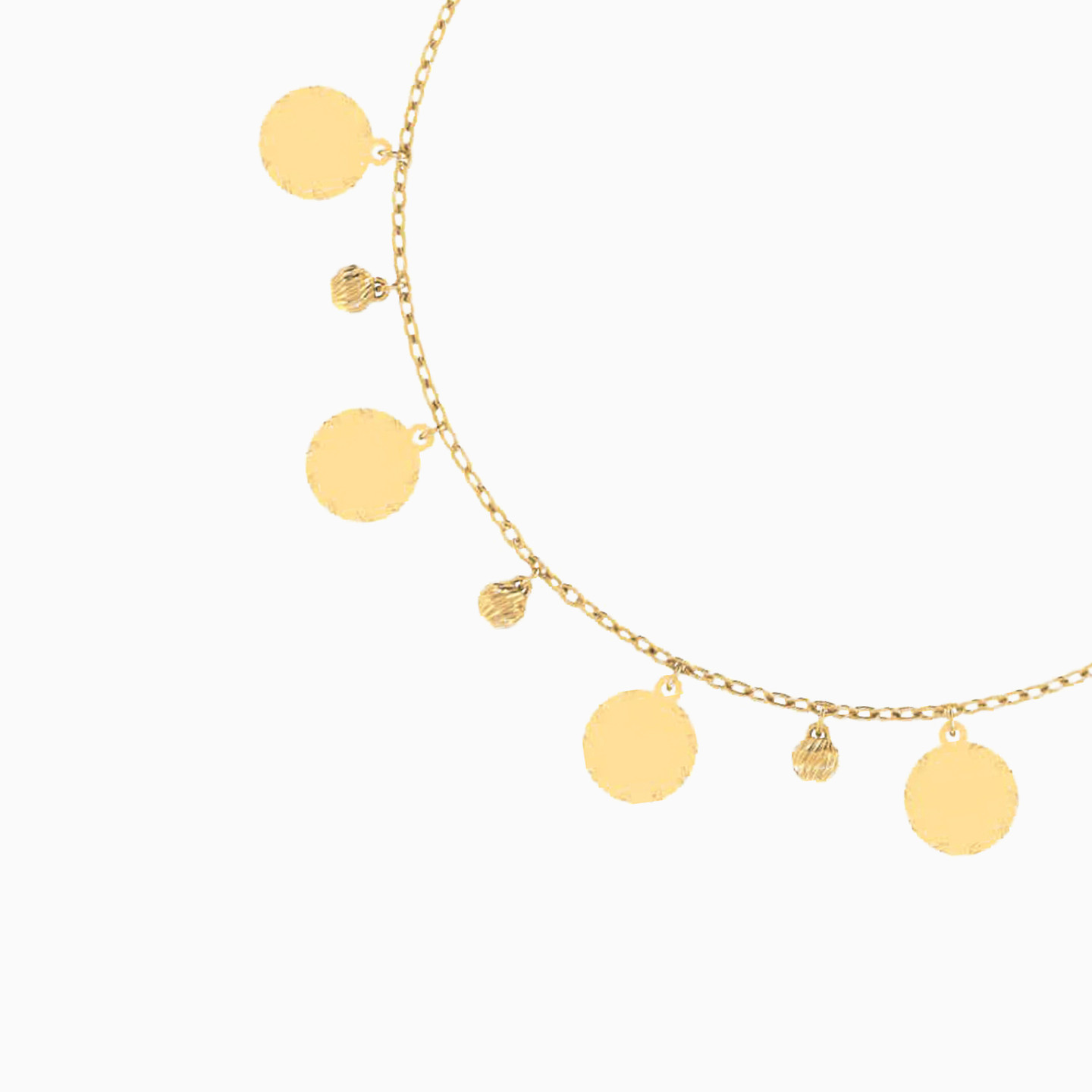 Classic meets playful in this necklace from Miss L’. Solid circle charms in 18-karat yellow gold adorn the petite chain and add a bounce to your look. This necklace will perfectly complement low or round necklines and work seamlessly into your everyday outfits.