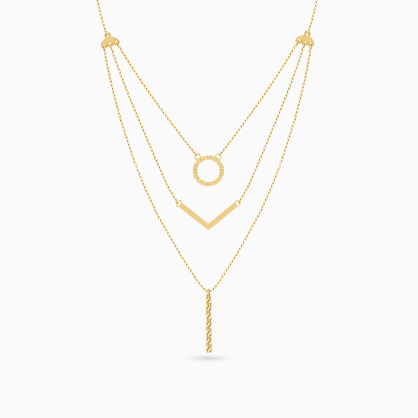 Step out looking splendid with this layered necklace from Miss L’. Featuring three rows of chains cast in 18-karat yellow gold with geometric motifs at the center of each, this piece will beautifully accentuate low or plunge necklines and make a statement whether you wear it at a party or style it with your city street attire.