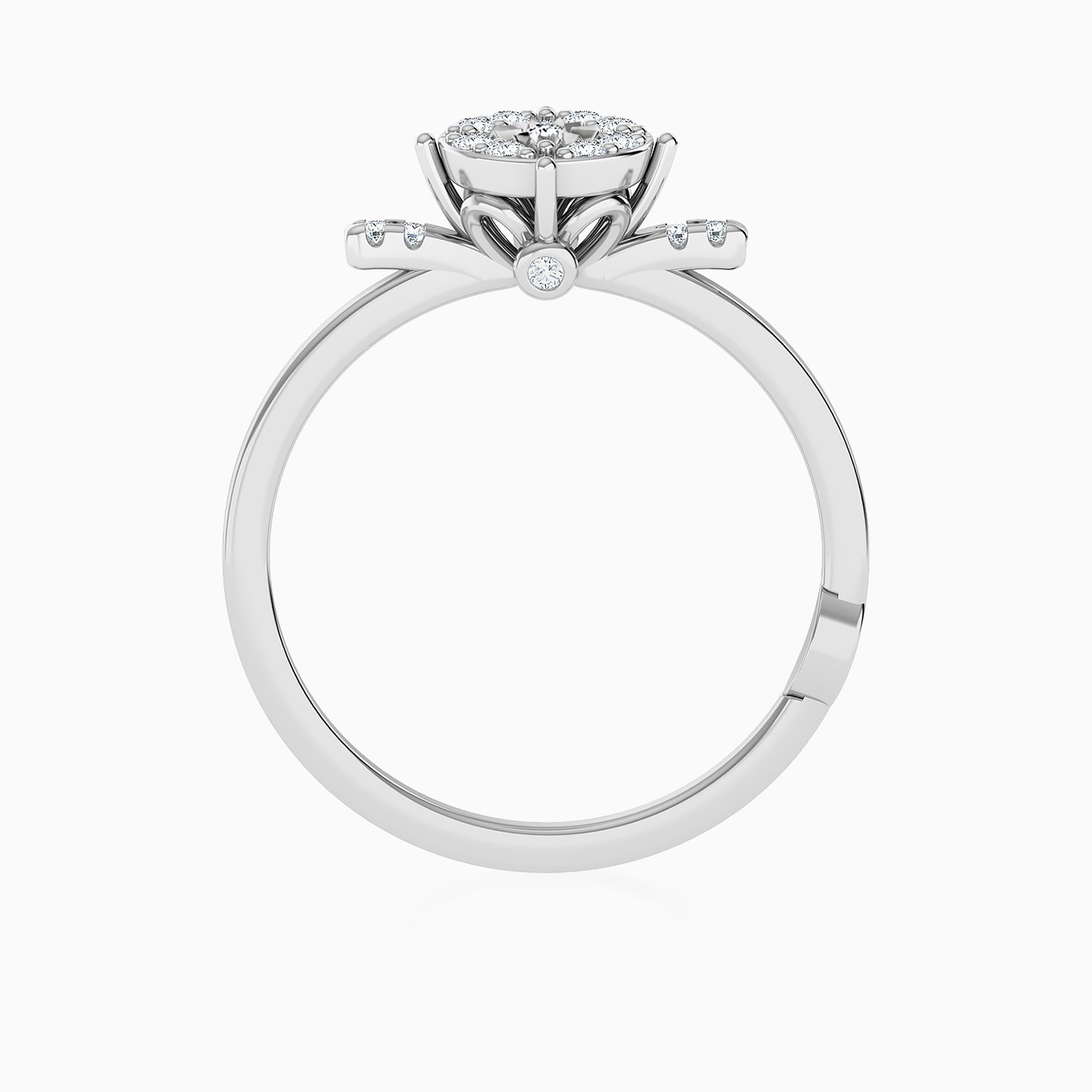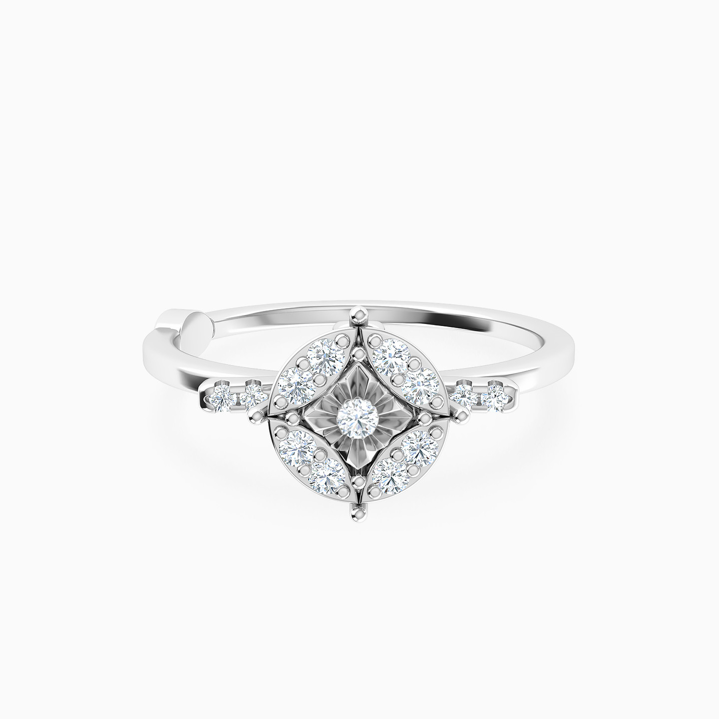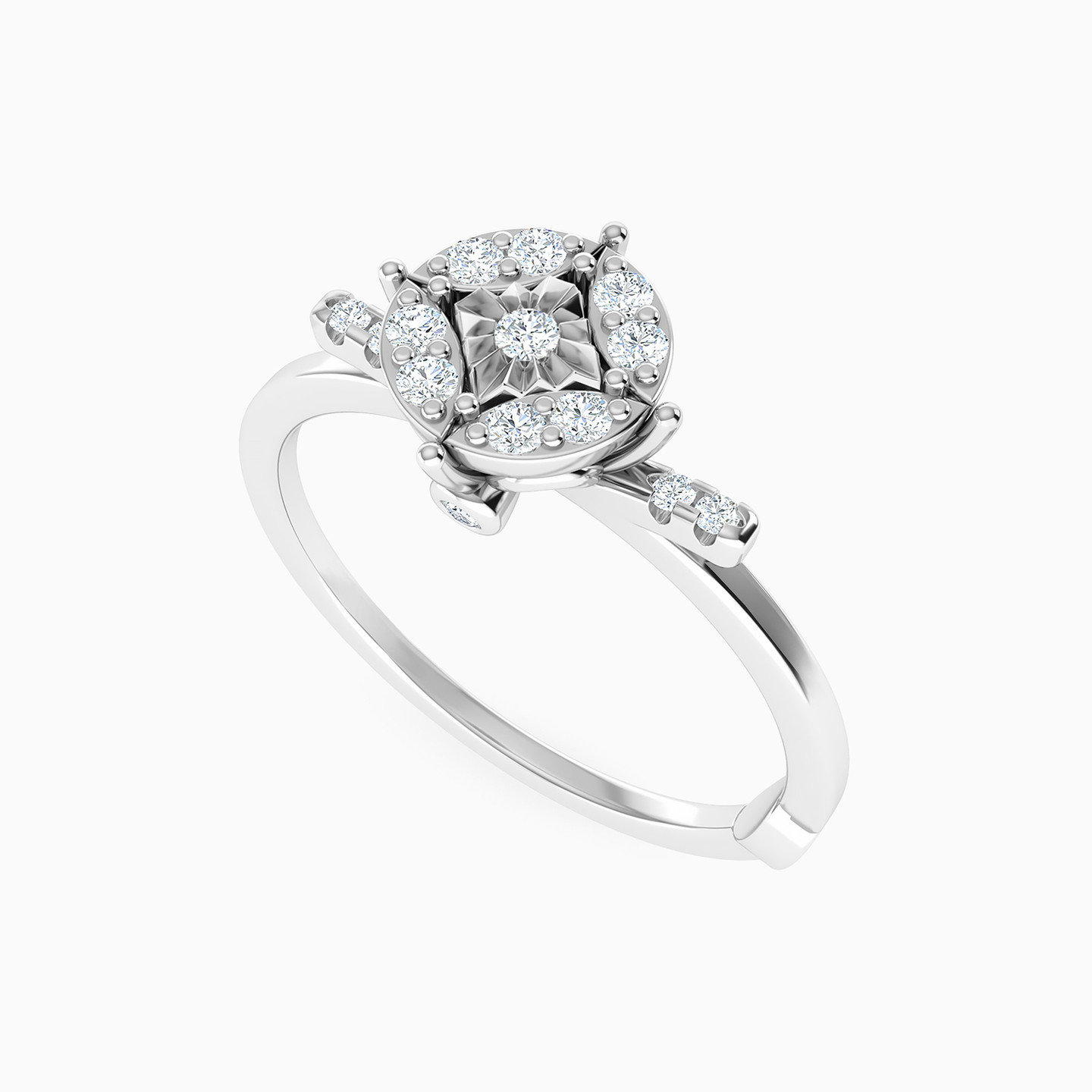 Bring timeless elegance to your wardrobe with this classic diamond statement ring from Miss L. With eye-catching shine, this stunning ring dazzles with a round cluster of brilliant cut diamonds and a diamond lined shank shimmering in 18-karat white gold. So elegant and sophisticated, this ring is the perfect everyday piece to add sparkle to daytime or weekend looks.