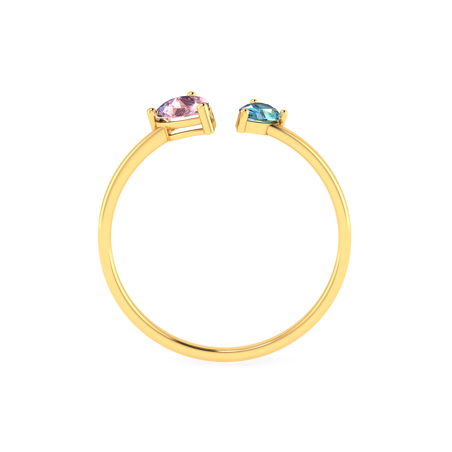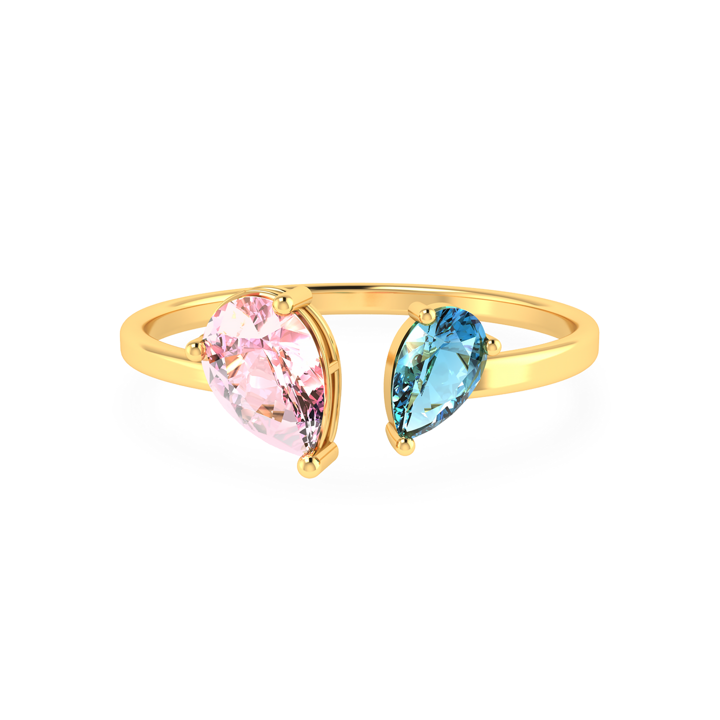 Add sparkle to your collection with this stylish piece from Miss L'! This elegant two-headed ring wraps your finger in radiant yellow gold, showcasing two pear-shaped stones in perfect harmony—one a vibrant pink, the other a serene aqua blue in a smaller size. A modern twist on classic glamour, this ring is designed to turn heads and elevate your everyday style with a playful pop of color.