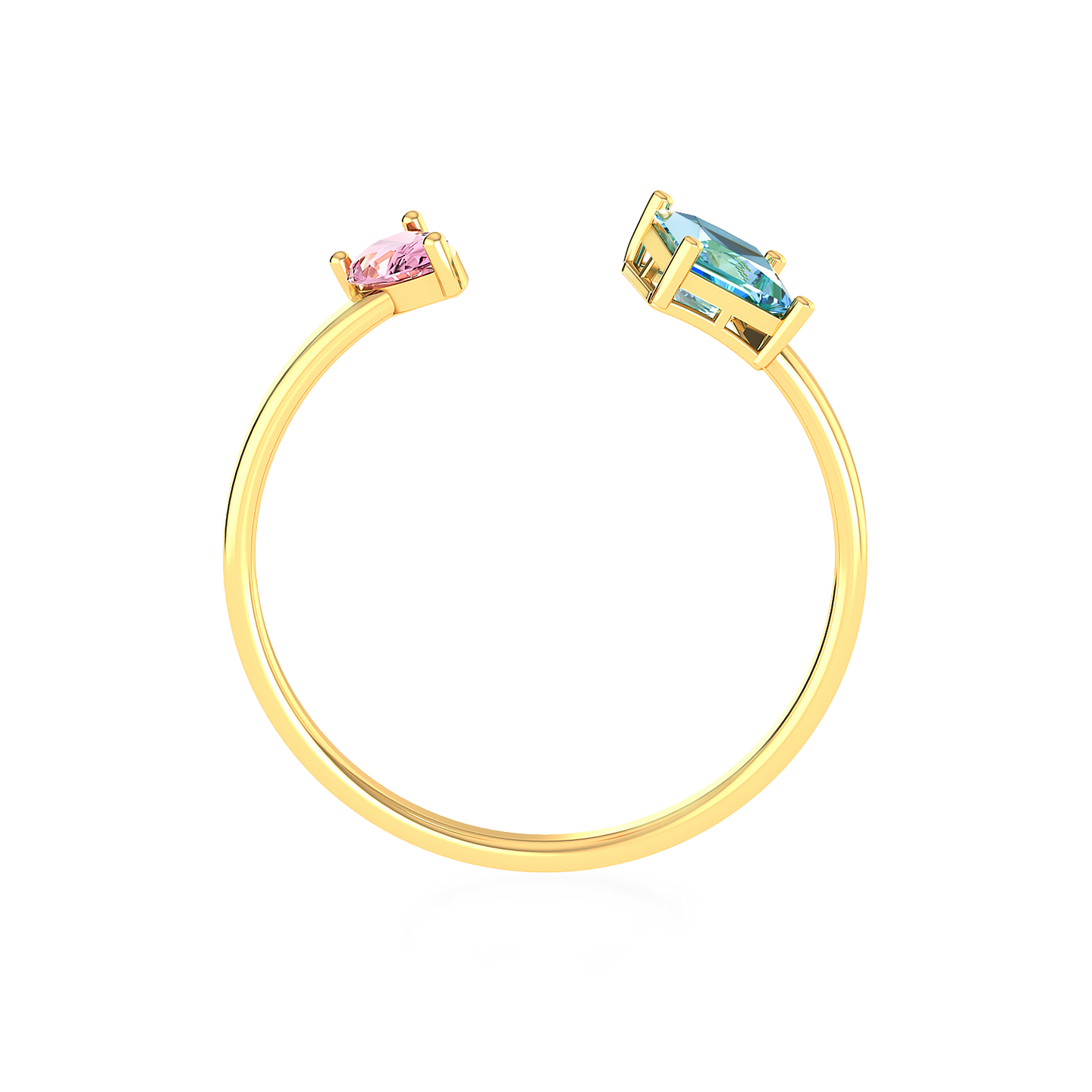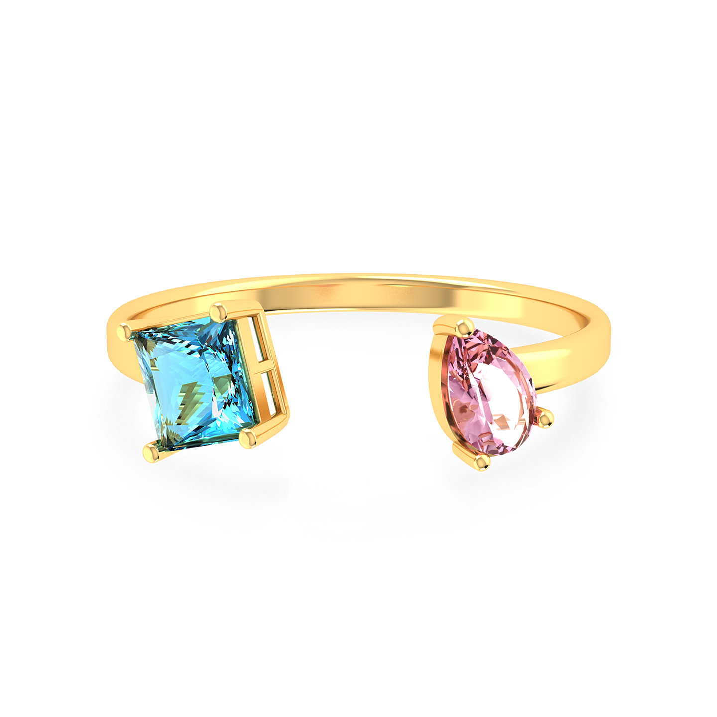 Add sparkle to your collection with this stylish piece from Miss L'! This unique two-headed ring in radiant yellow gold strikes the perfect balance between soft and bold—featuring one head adorned with a pear-shaped pink stone and the other with a square-shaped aqua blue stone. A fresh fusion of shapes and colors, this ring brings playful elegance to your look, whether you're dressing up or keeping it casual.