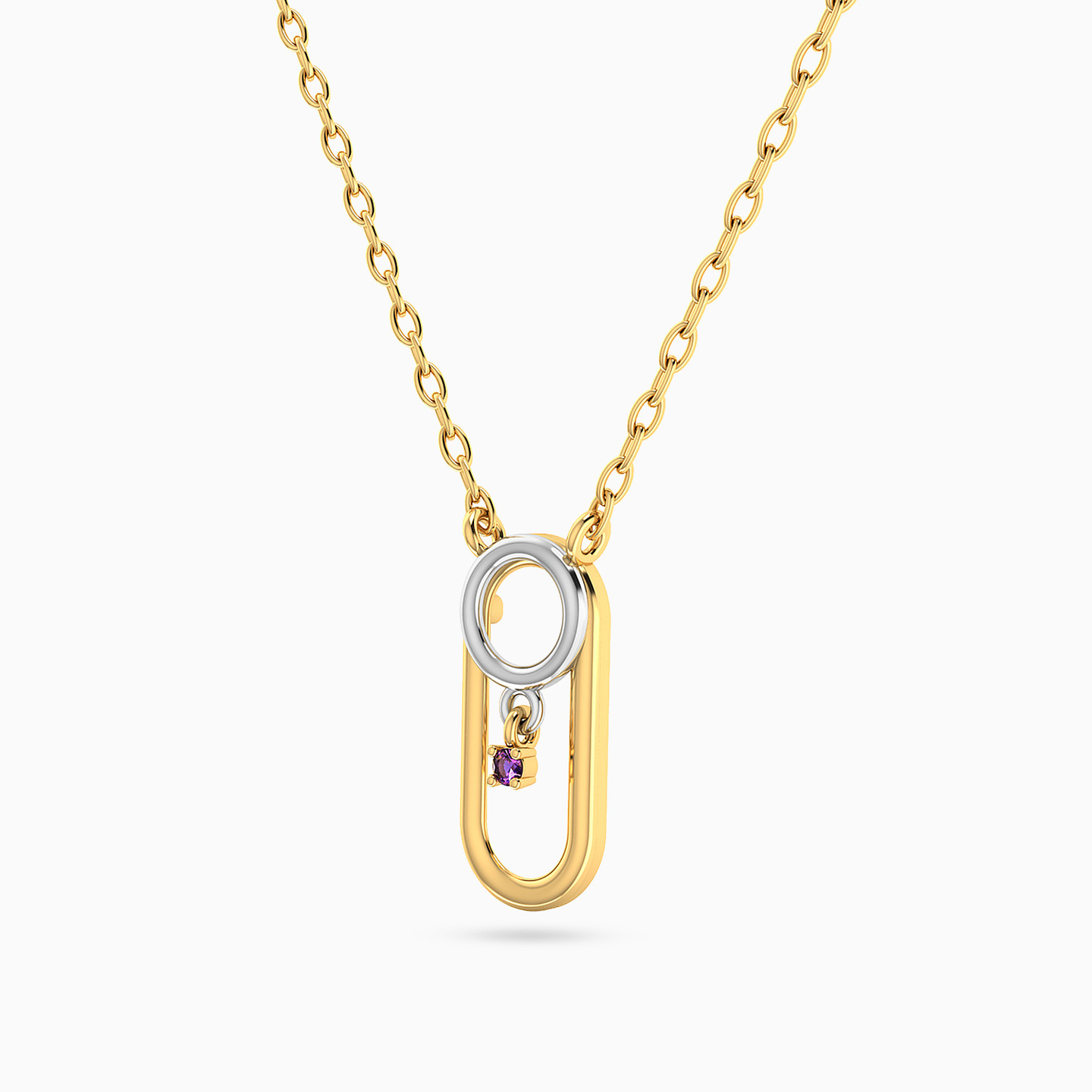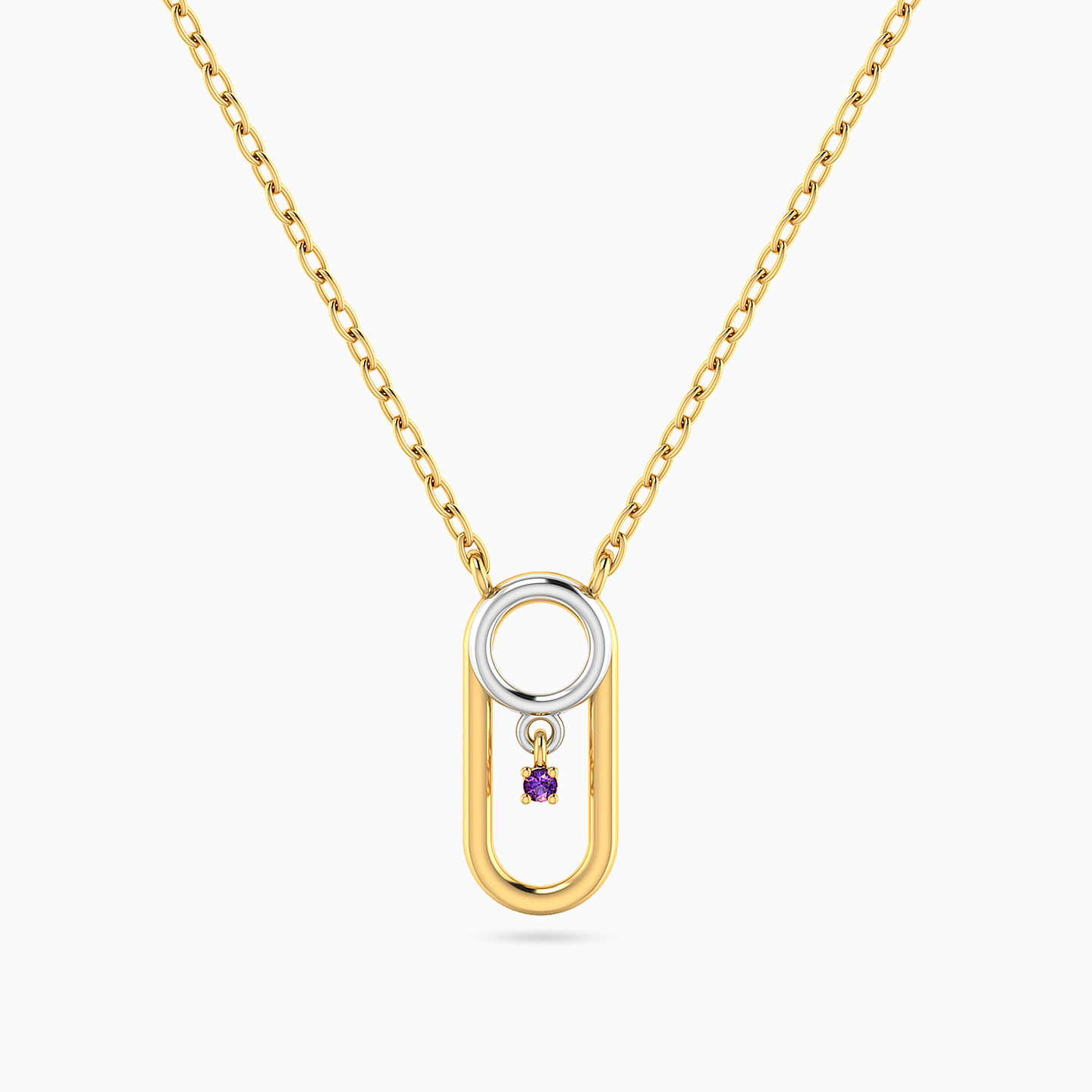 Modern elegance with a hint of color. This Miss L’ necklace from the Matrix Collection showcases a golden pendant with a soft elongated oval frame, crowned by a white gold circle that drops into a tiny purple stone. A sleek and meaningful piece, perfect as a gift for someone who values subtle beauty.