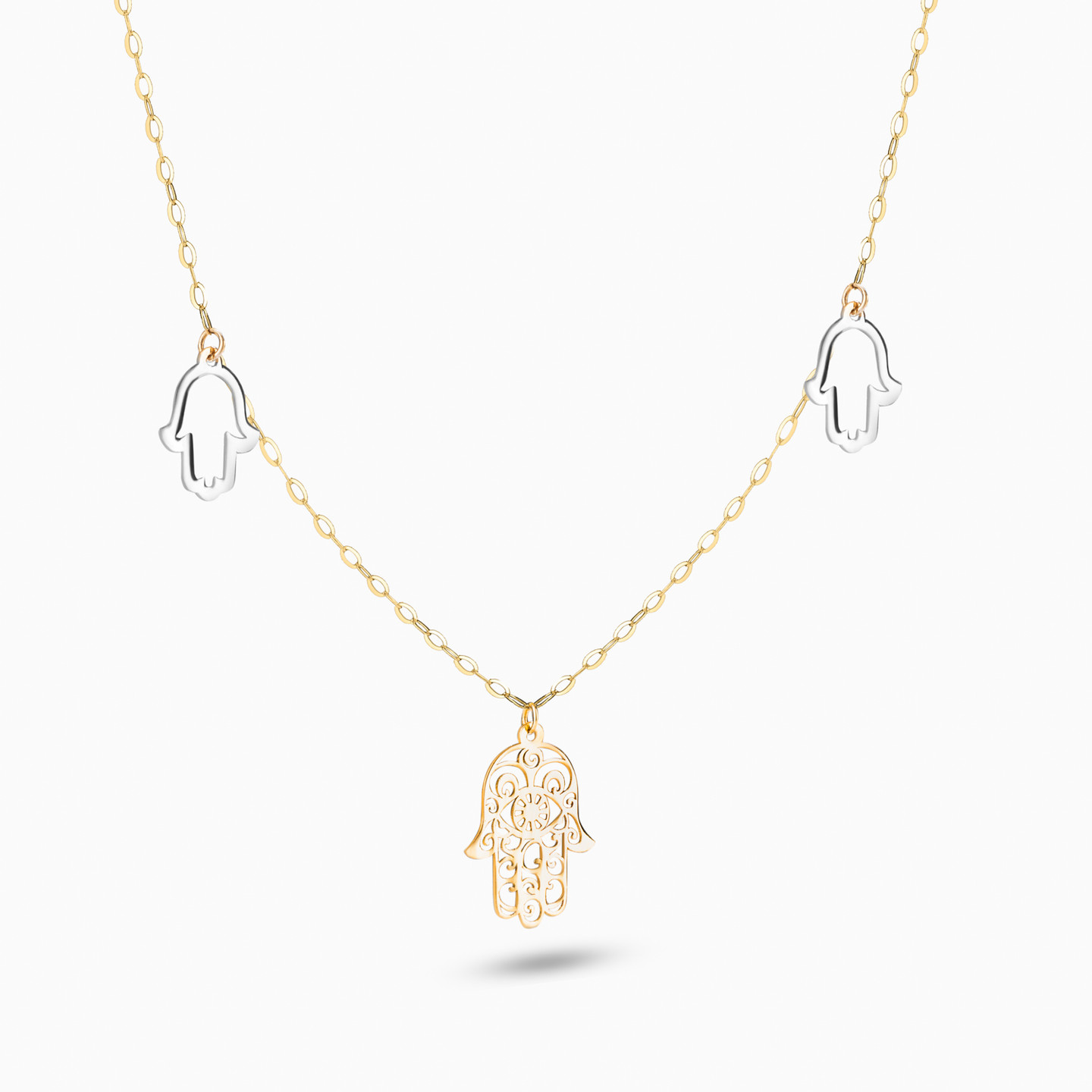 A charm of protection and grace. This Miss L’ necklace features three hamsa hand motifs, with a central filigree design framed by two sleek outlines. Delicate and symbolic, it carries a touch of heritage while remaining stylish for everyday layering or gifting.