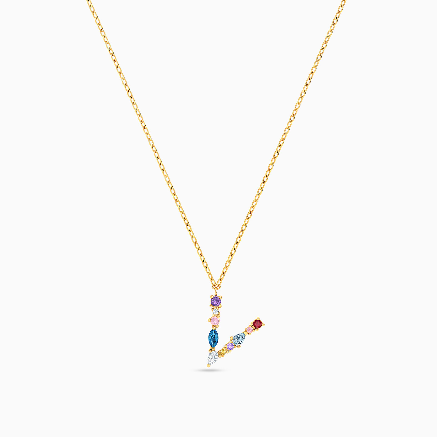 Flaunt your initial in style with this V letter necklace from L’azurde Instyle. Studded with a bouquet of colorful stones, it is designed to add a sparkle to any day to evening outfit. It gracefully drops from an 14-karat yellow gold chain and will work perfectly as a solo accessory or paired with petite ear studs.