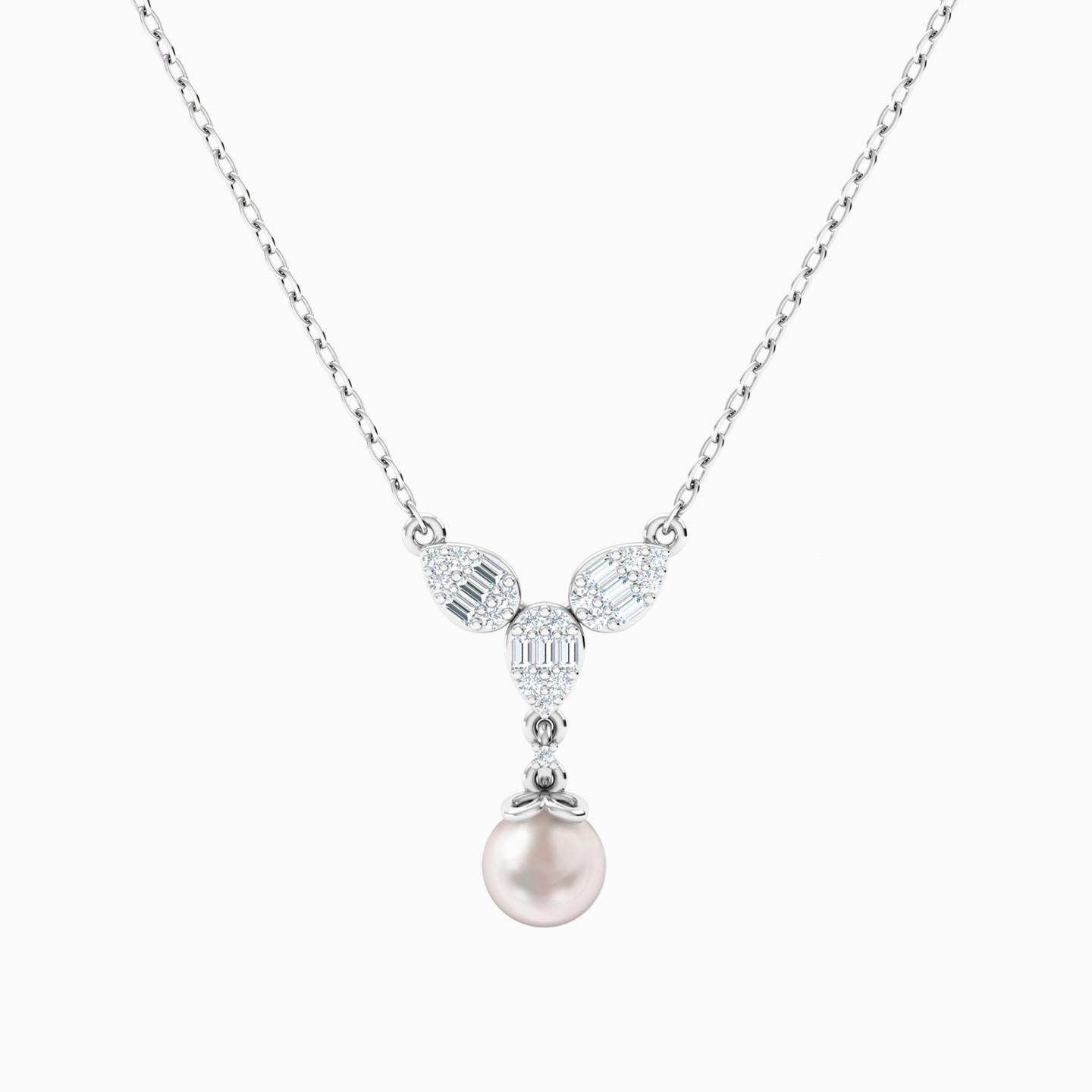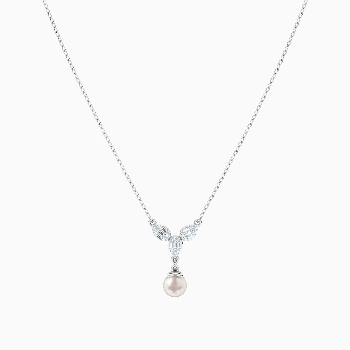 Add a touch of sophistication to your wardrobe by wearing this elegant pendant necklace from Miss L. A trio of pear-shaped motifs with brilliant and baguette cut diamonds adorn this chic necklace with a stunning pearl drop at the center. Crafted in 18-karat white gold, we love this necklace for daytime and evening glam. It’s subtle enough to wear with casual wear and fancy enough to pair with a little black dress.