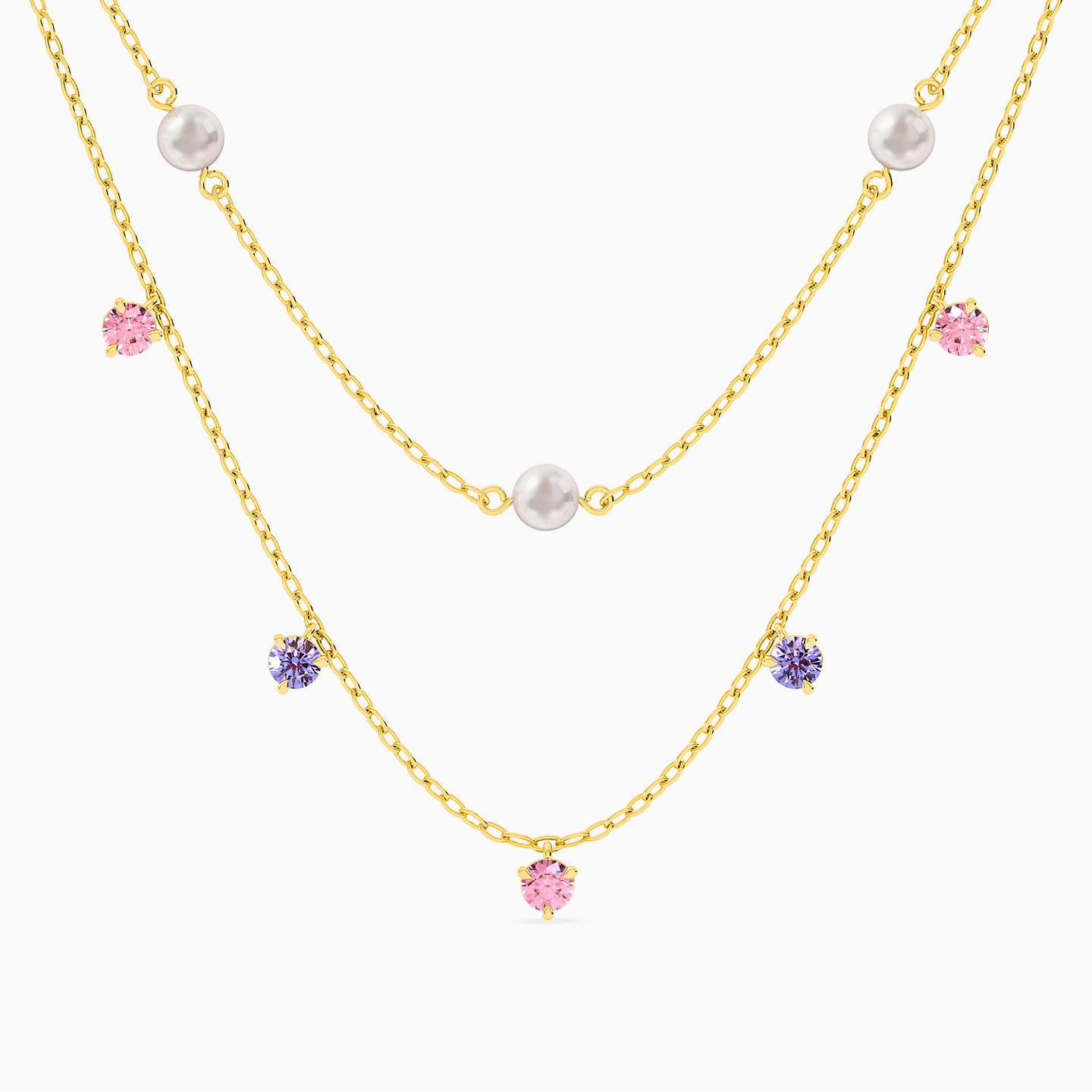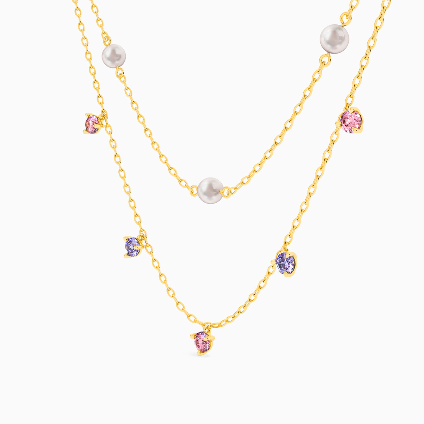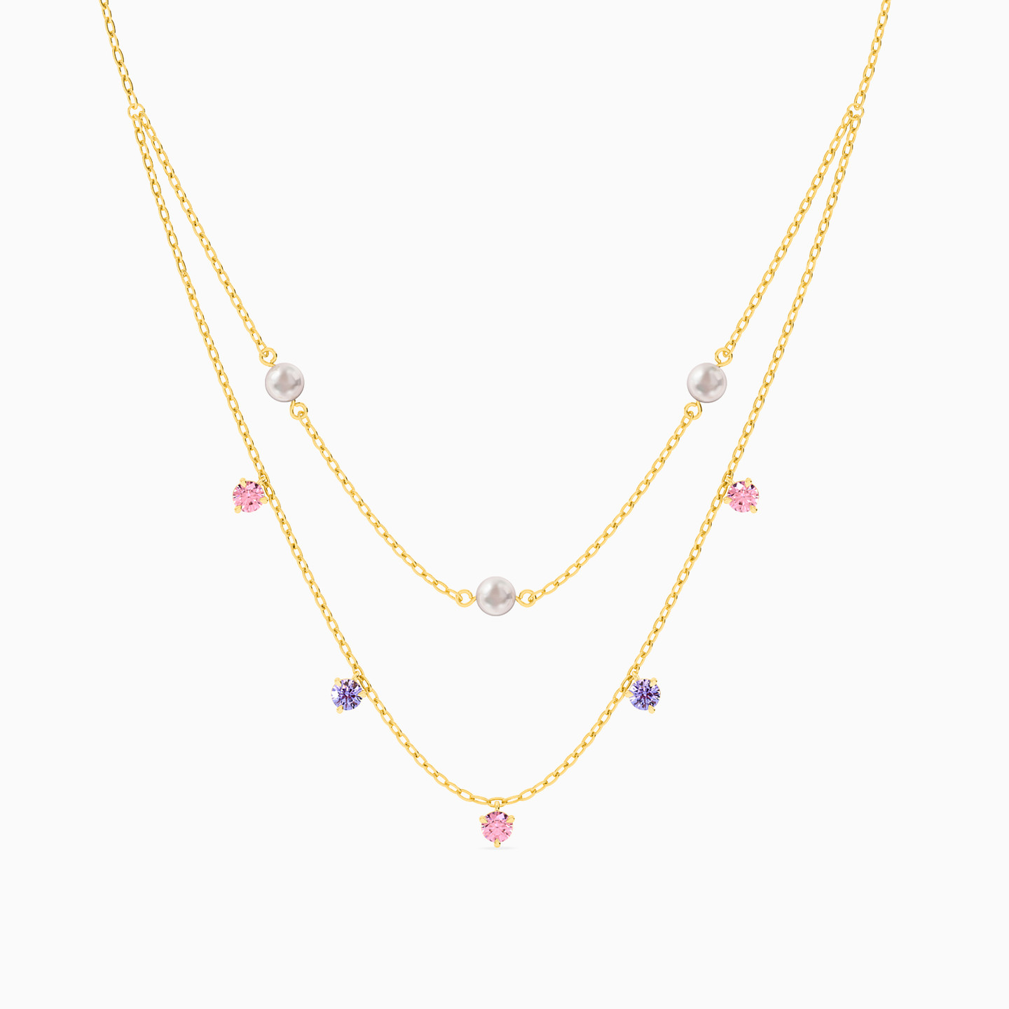 This one is all set to add a bout of on trend style to your outfit. Layered yellow gold chains are dotted with pink and blue stones, and pearls in this delicate piece. Pair it with a high neckline in a contrast hue to truly bring out its magic.