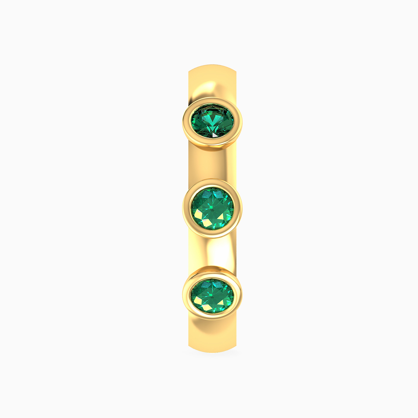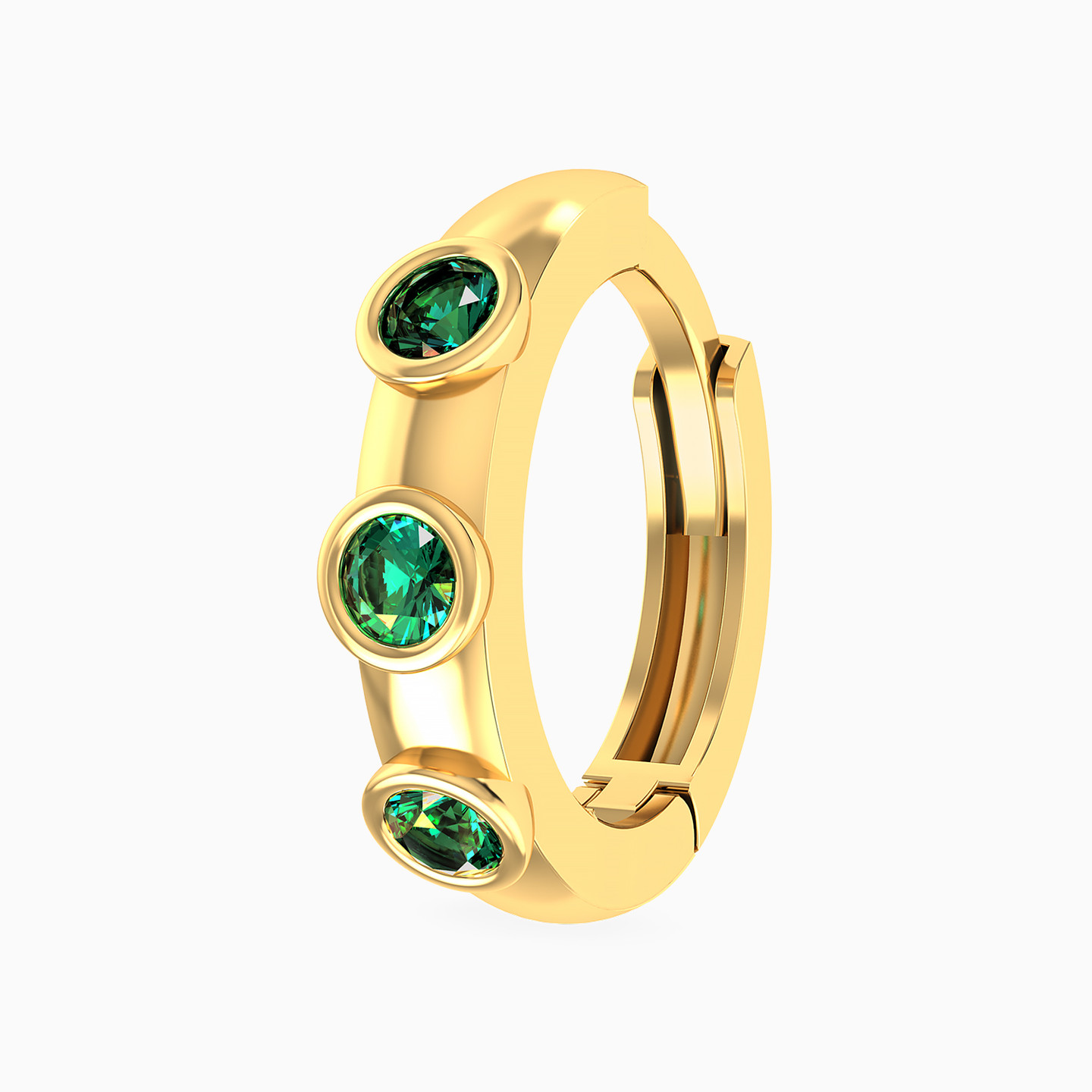 Pop on this hoop earring from Miss L' that packs a stylish punch. This charming 14-karat yellow gold hoop earring is adorned with a trio of bezel-set multi-faceted colored stones that bring instant glam to office attire, casual weekend looks and elegant evenings. We love this powerhouse earring worn alone or stacked and styled with other earrings to create a variety of looks.