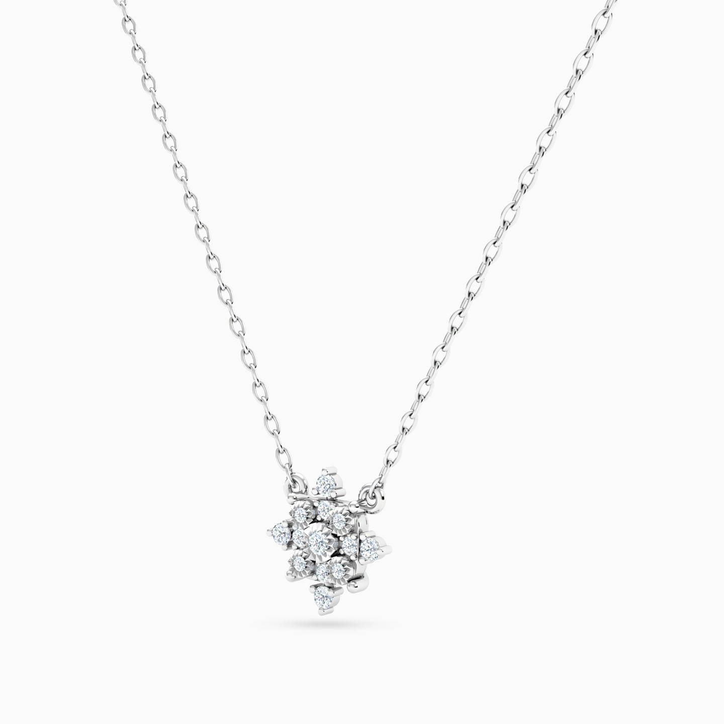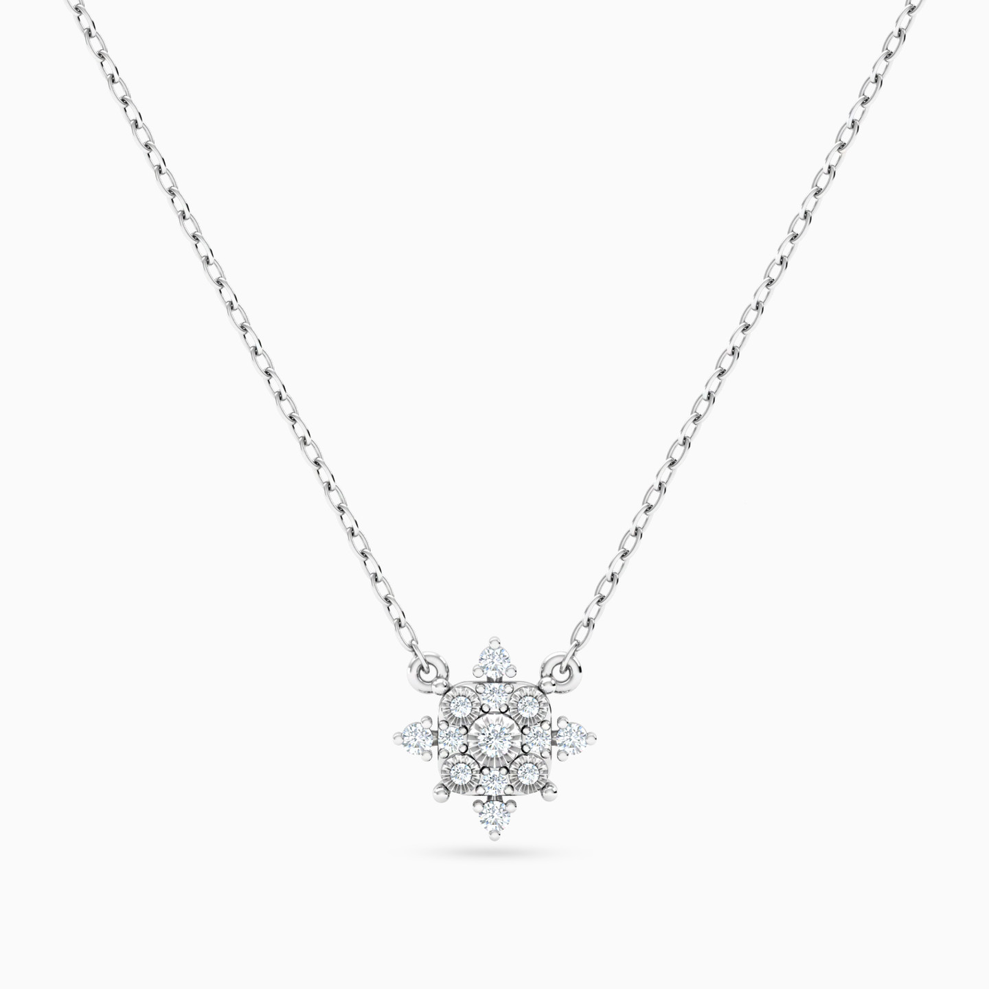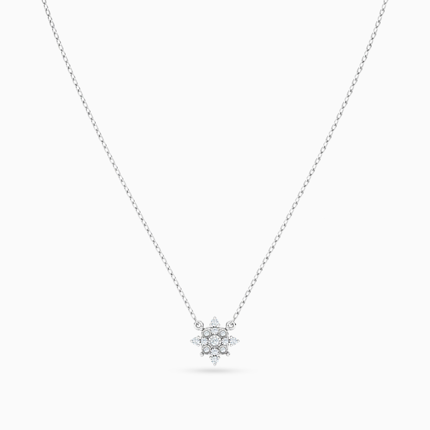 Sparkle and shine with sweet sophistication by wearing this dainty diamond pendant necklace from Miss L. Brilliant cut diamonds and pleated gold details give this snowflake-like pendant necklace its irresistible feminine allure. Crafted in lustrous 18-karat white gold, this is the ideal piece for workdays, weekends and special nights out.