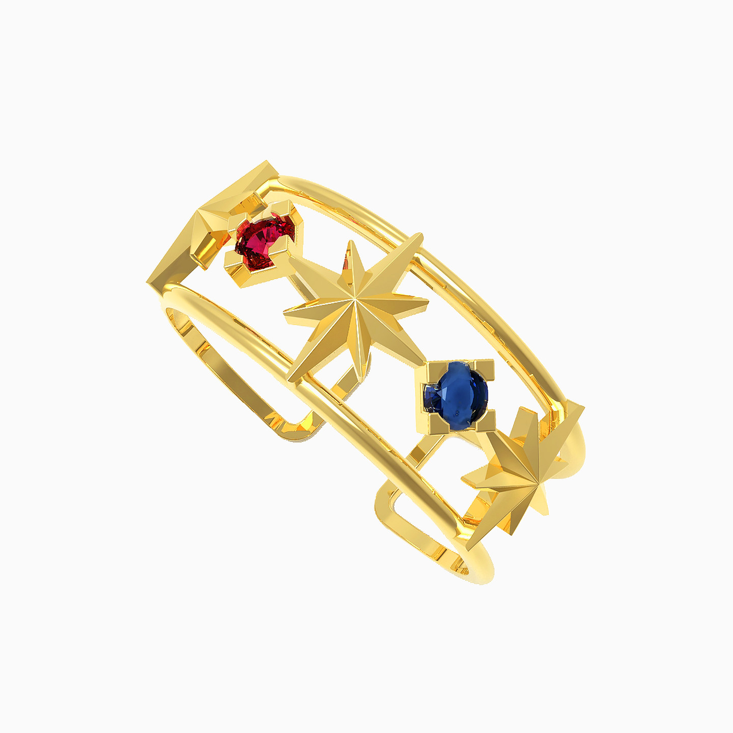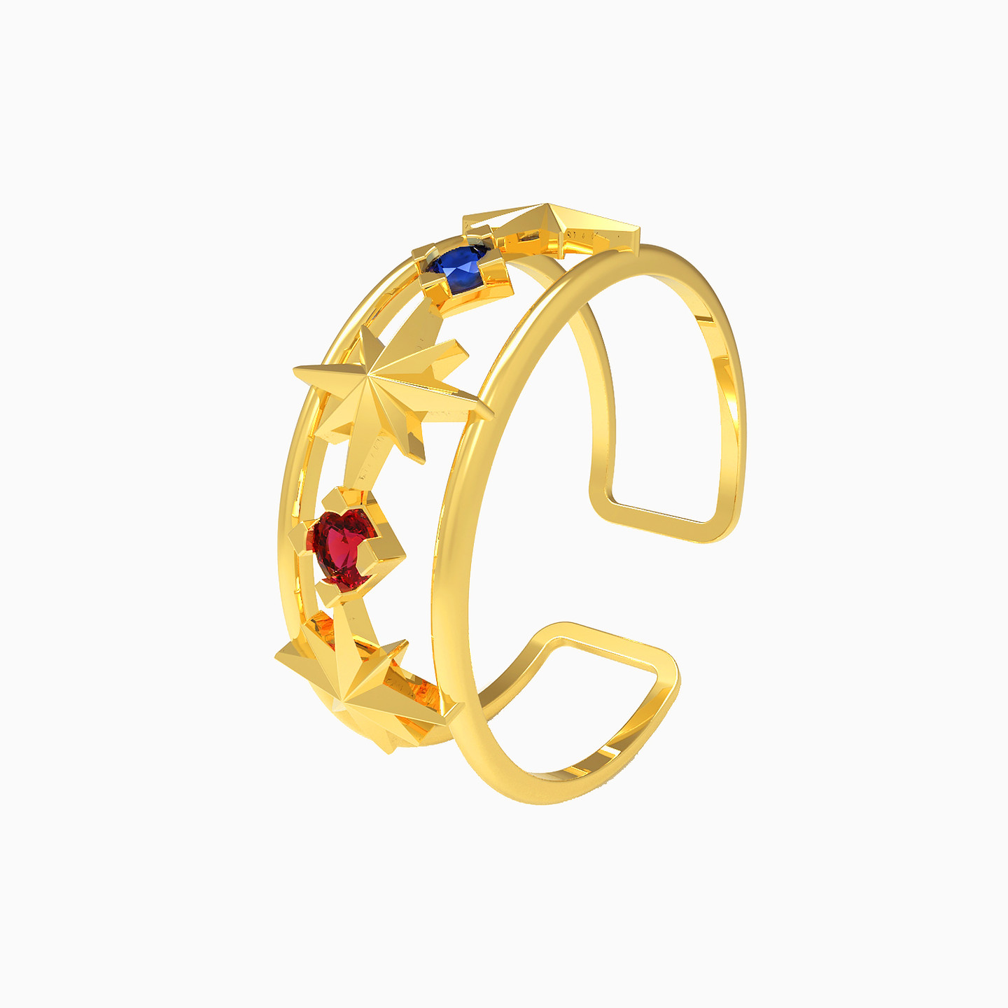 This ring from Miss L’ is a total conversation starter. Giving off an elite vibe, it is cast in 18-karat yellow gold and decked with star accents and multicolored stones. We love the broad cuff styled construct and recommend it for everyday wear.