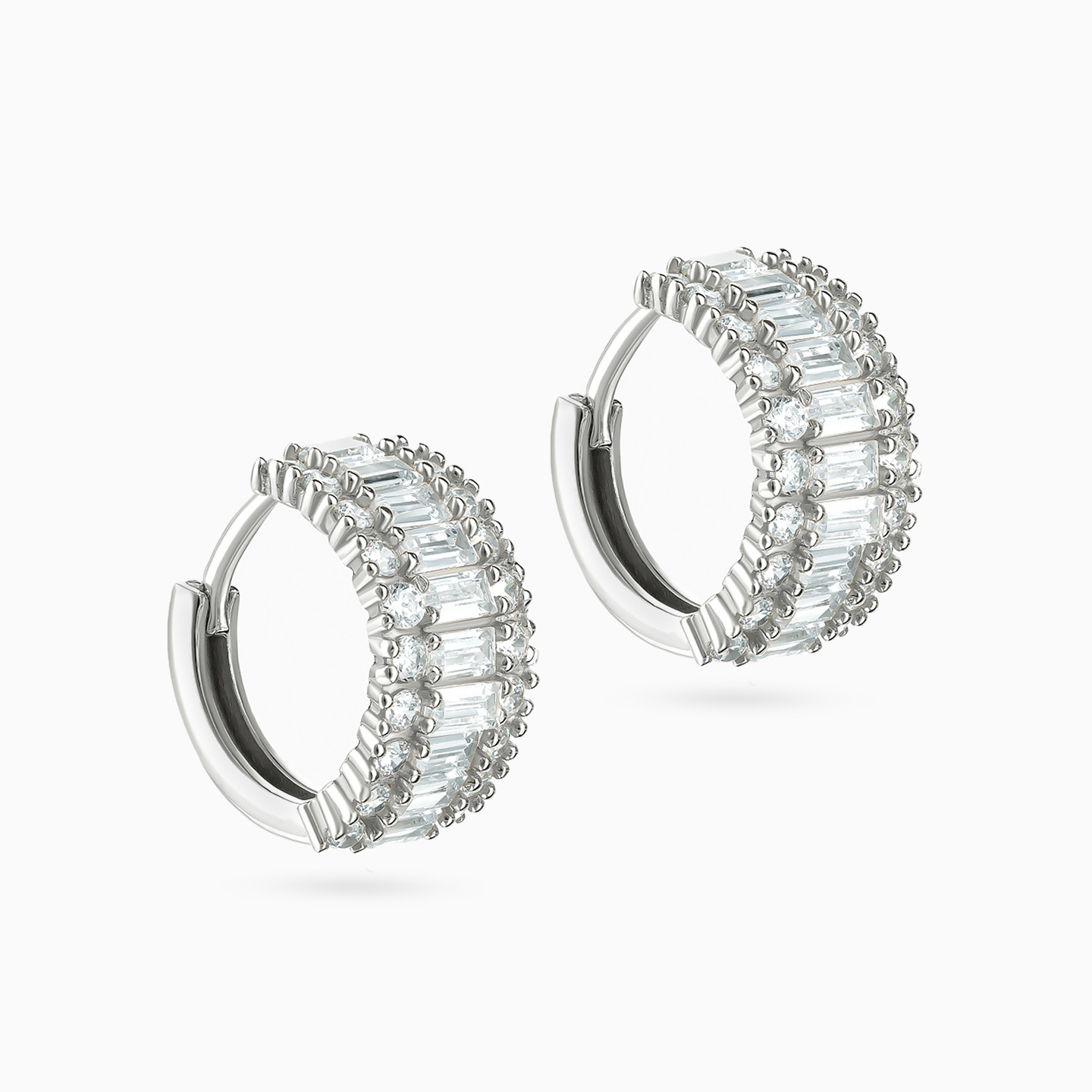 Take your ear game to the next level with these fabulous 18-karat white gold stud earrings from L'azurde Gold, where elegance meets extravagance. In the center, a mesmerizing row of prong-set baguette-shaped cubic zirconia steals the spotlight, while on either side, rows of brilliant round-shaped cubic zirconia, each meticulously set on four prongs, add a captivating touch of radiance. These studs are the ultimate expression of luxury and make the perfect accessory to make a statement that shines day or night.