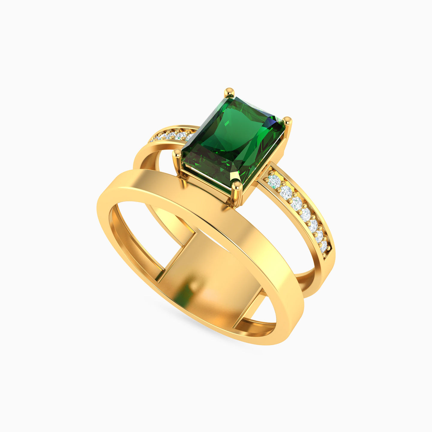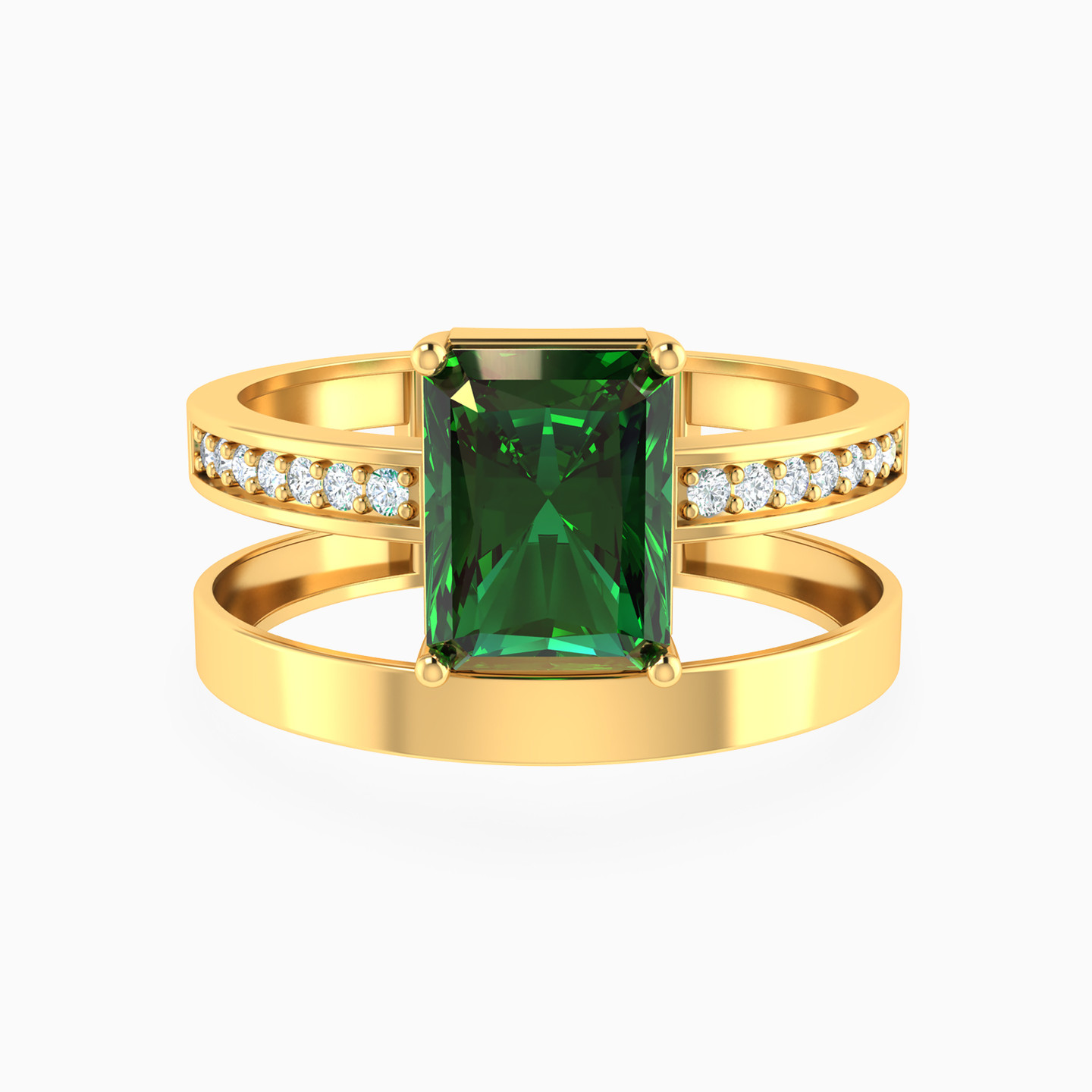 Invest in timeless elegance with this exquisite piece from Lazurde Gold! This sophisticated yellow gold double shank ring features one sleek strand paired with another delicately studded with small clear stones, with a striking vertical baguette-shaped green stone at its center, creating a harmonious balance between modern simplicity and sparkling luxury—perfect for making an elegant statement wherever you go.