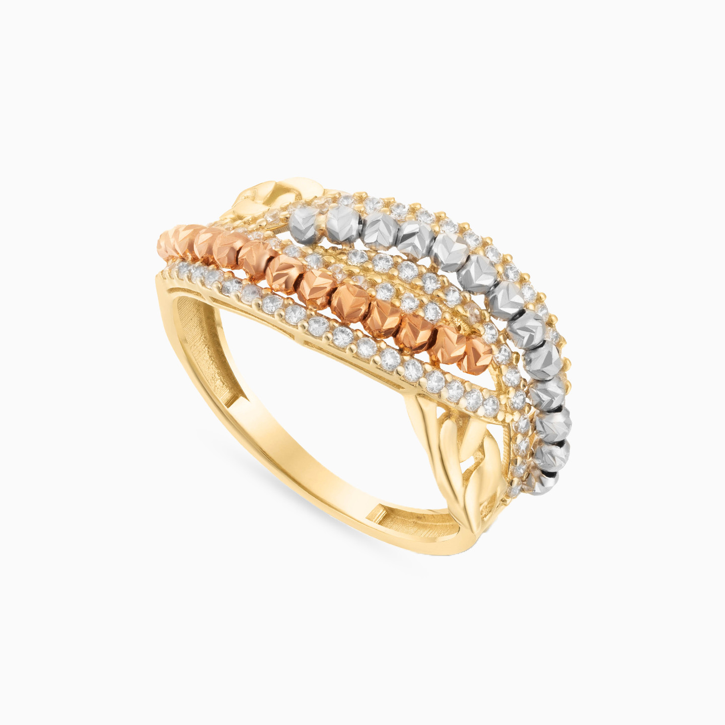 A stunning crossover-style ring by L'azurde Gold that will leave you mesmerized! Crafted from 18-karat yellow gold, this beauty features two crossover bands made of a beautiful trio of two-prong set cubic zirconia studded bands with one cradling a layer of round textured 18-karat rose beads and the other 18-karat white gold beads. This exquisite arrangement sits beautifully on top of a chain links band, creating an accessory that is more than just a piece of jewelry; it’s a piece of art. This statement ring makes a perfect pick for days when you want to stand out.