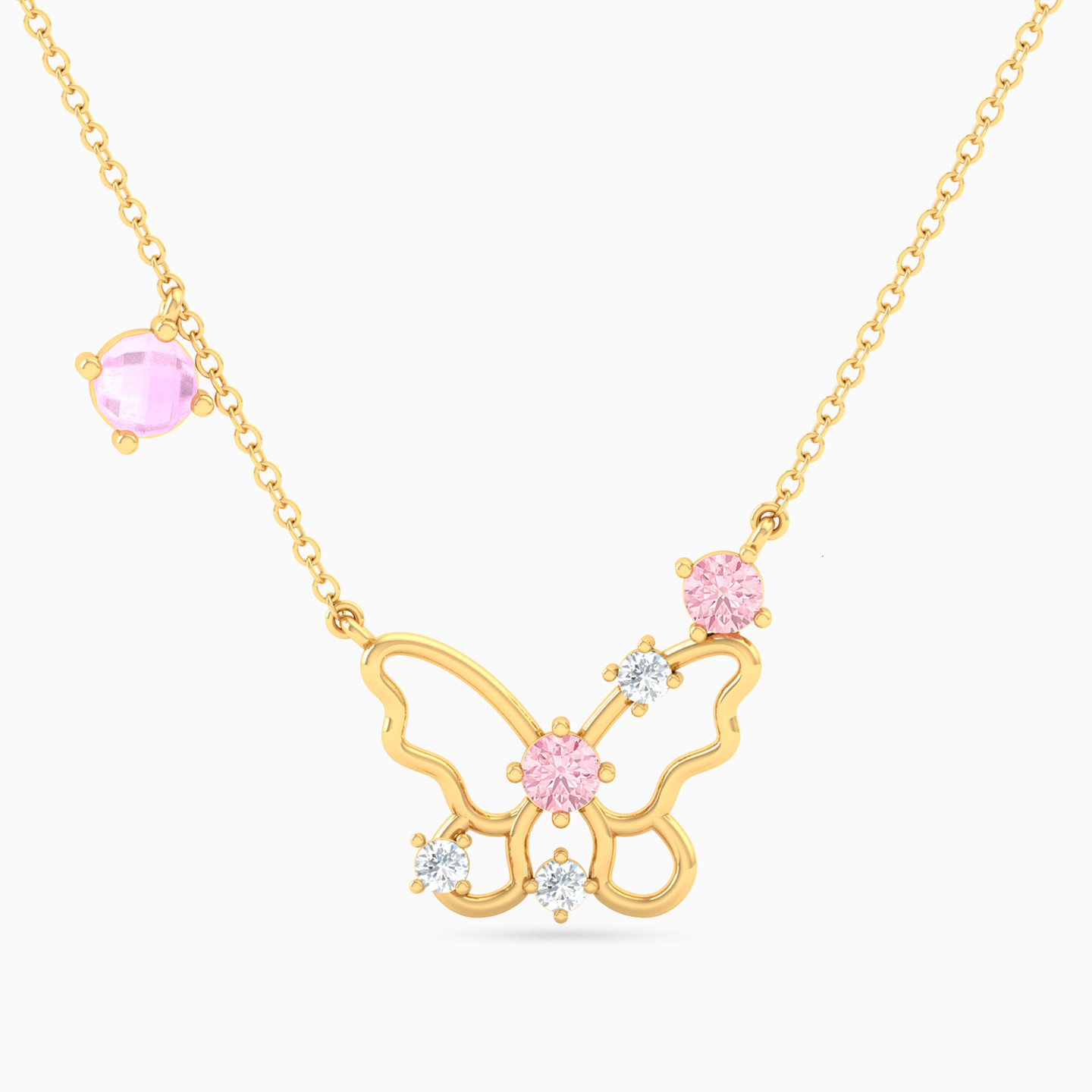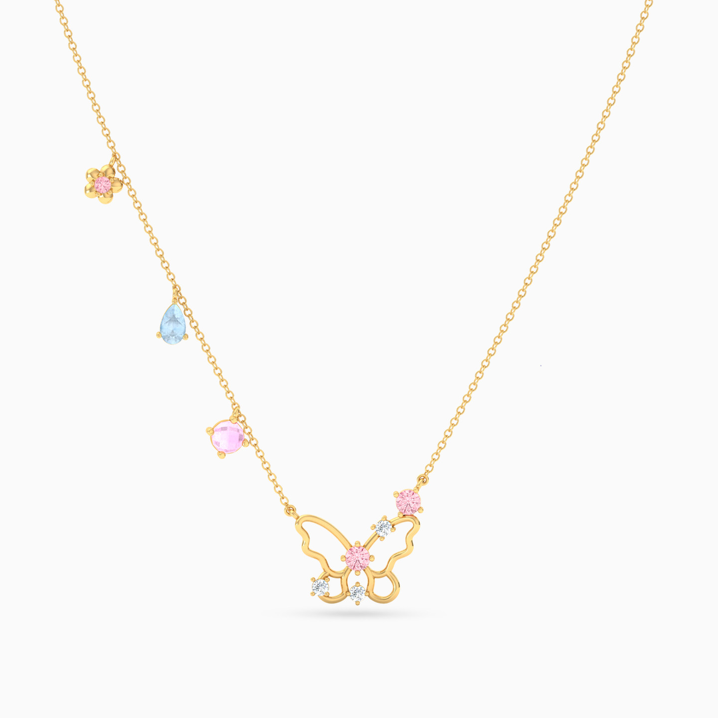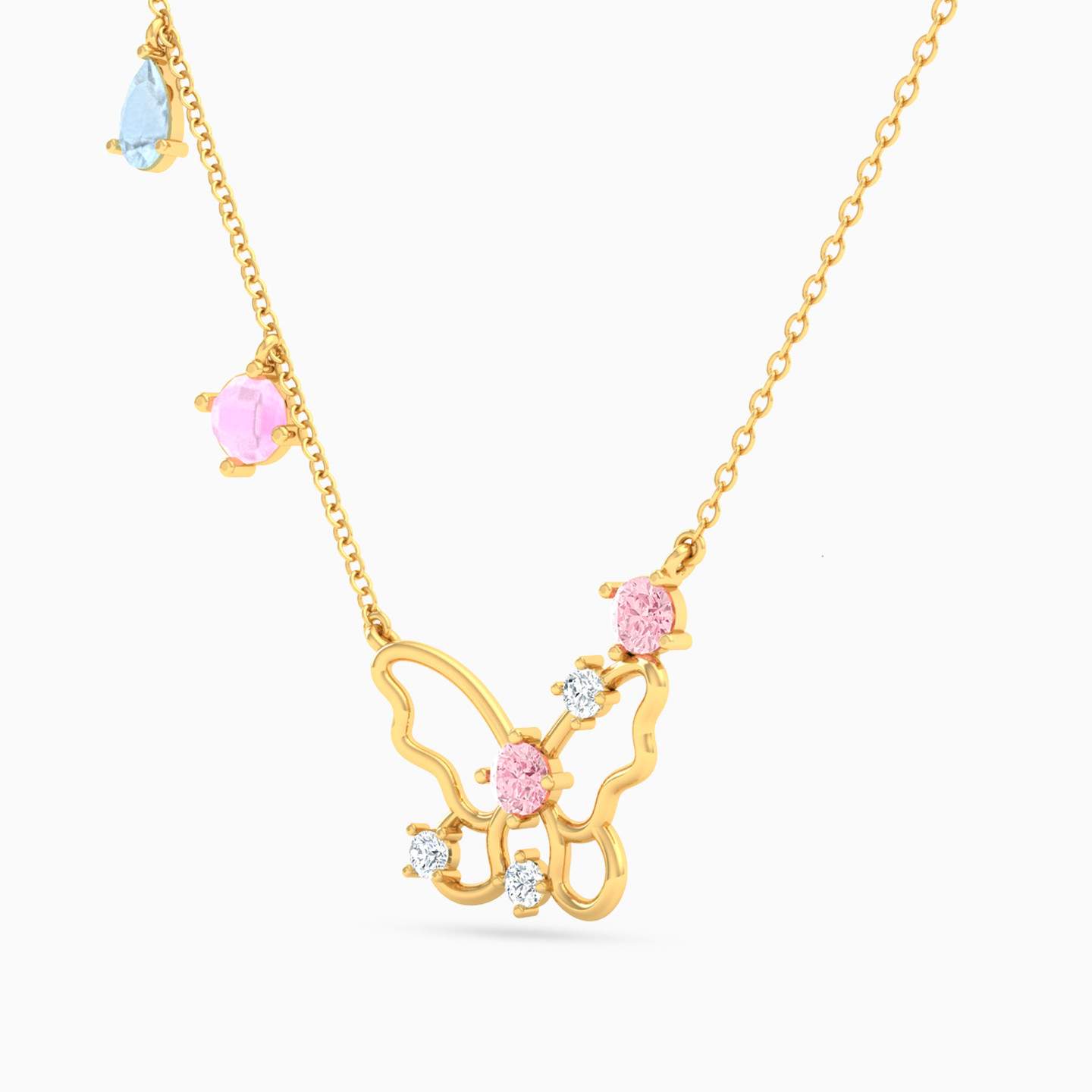 Enhance your personality with this stone studded butterfly necklace from L’azurde Instyle. The pink and blue stones beautifully contrast with the 18-karat yellow gold construct and make it a fitting choice for a self-treat or a gift for a special woman.
