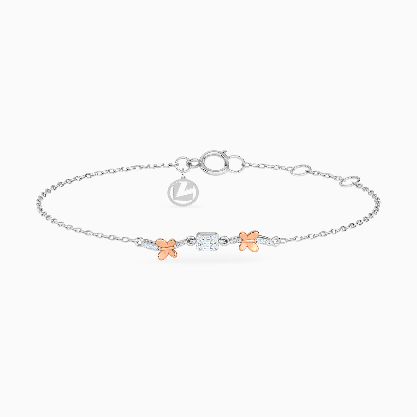 Elegance takes a delicate turn with this 18-karat white gold chain bracelet from L'azurde Diamonds. The centerpiece of this bracelet features a square-shaped motif adorned with 0.06-carat brilliant cut diamonds, creating a mesmerizing play of light and sparkle. On either side, a symphony of elements unfolds – a sleek bar embellished with round beads, a graceful 18-karat rose gold butterfly motif, and another sleek bar adorned with diamonds, culminating in an enchanting piece that effortlessly transitions from day to night.