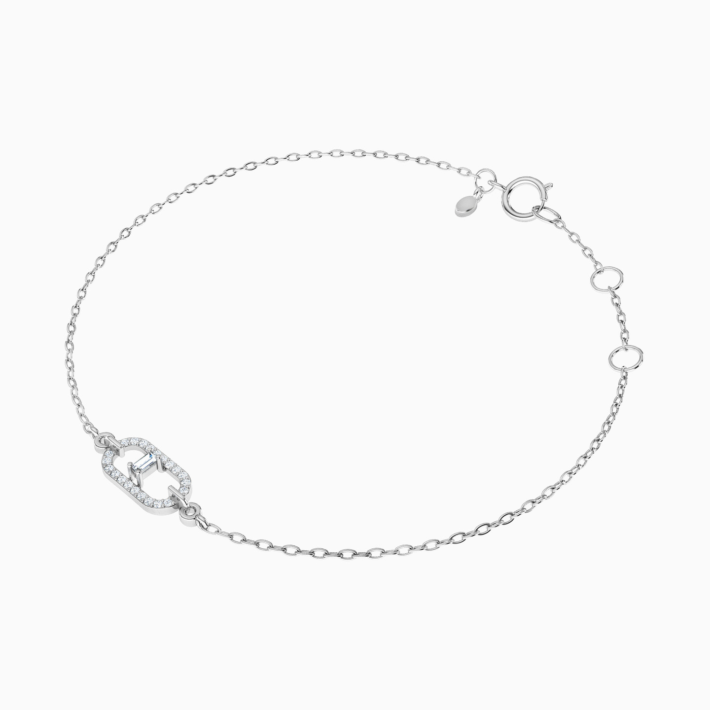 This 18-karat white gold dainty chain bracelet from L'azurde Diamonds features a subtle yet captivating design. At its center, a rounded rectangular frame gracefully embraces a line of sparkling brilliant cut diamonds, adding a touch of shimmer and brilliance. The frame is flanked by delicate loops on either side, creating a perfect blend of delicate sophistication and timeless beauty. If you are looking for an everyday partner, then this bracelet is what you need.