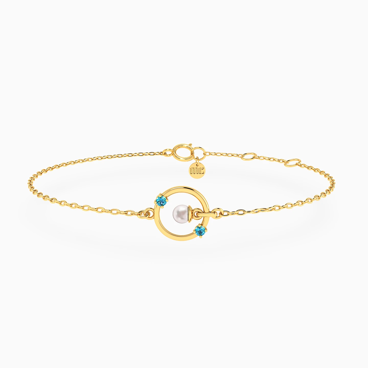 A gentle circle of elegance, this yellow gold bracelet graces the wrist with a luminous white pearl embraced by a golden ring, while a tiny blue stone sparkles like a drop of ocean water. A perfect gift for those who adore delicate beauty and a whisper of color to brighten every gesture.