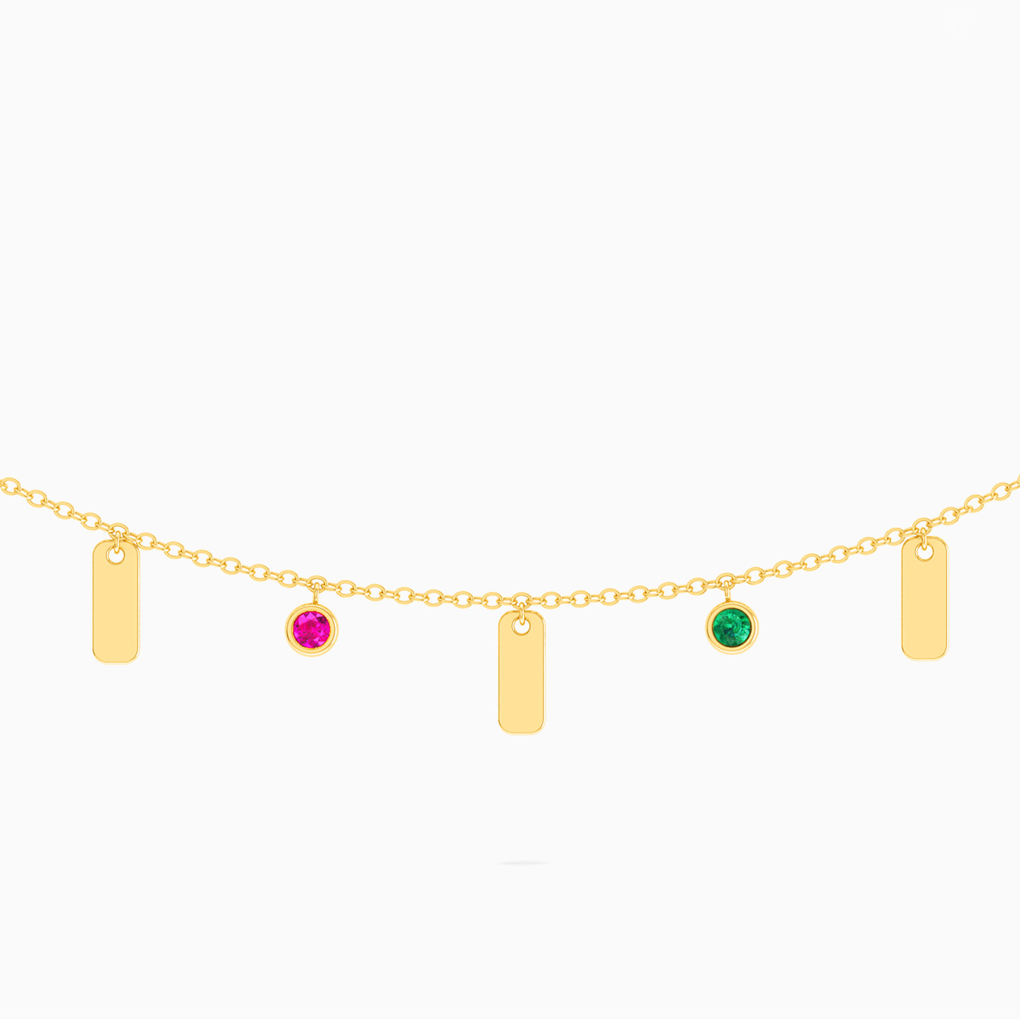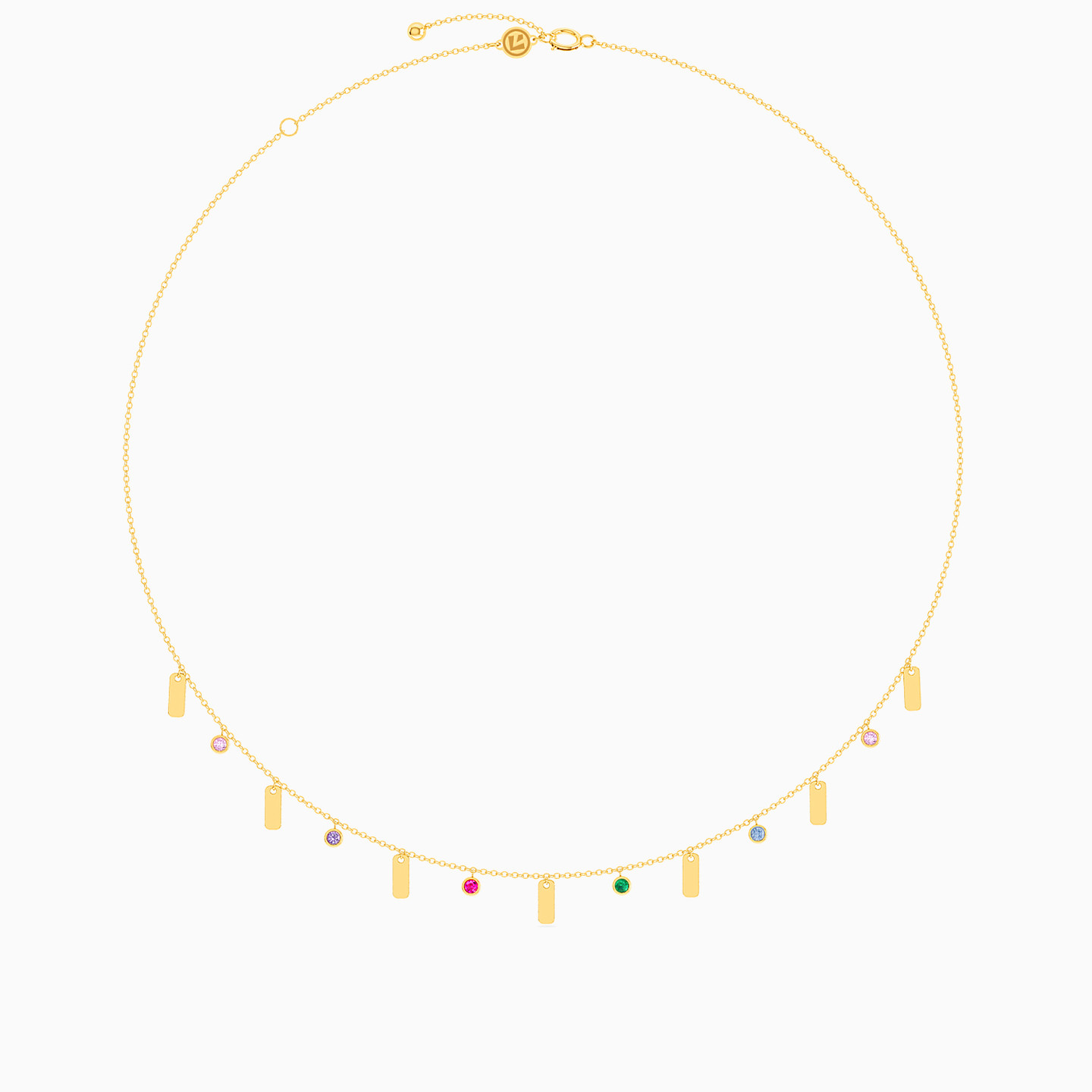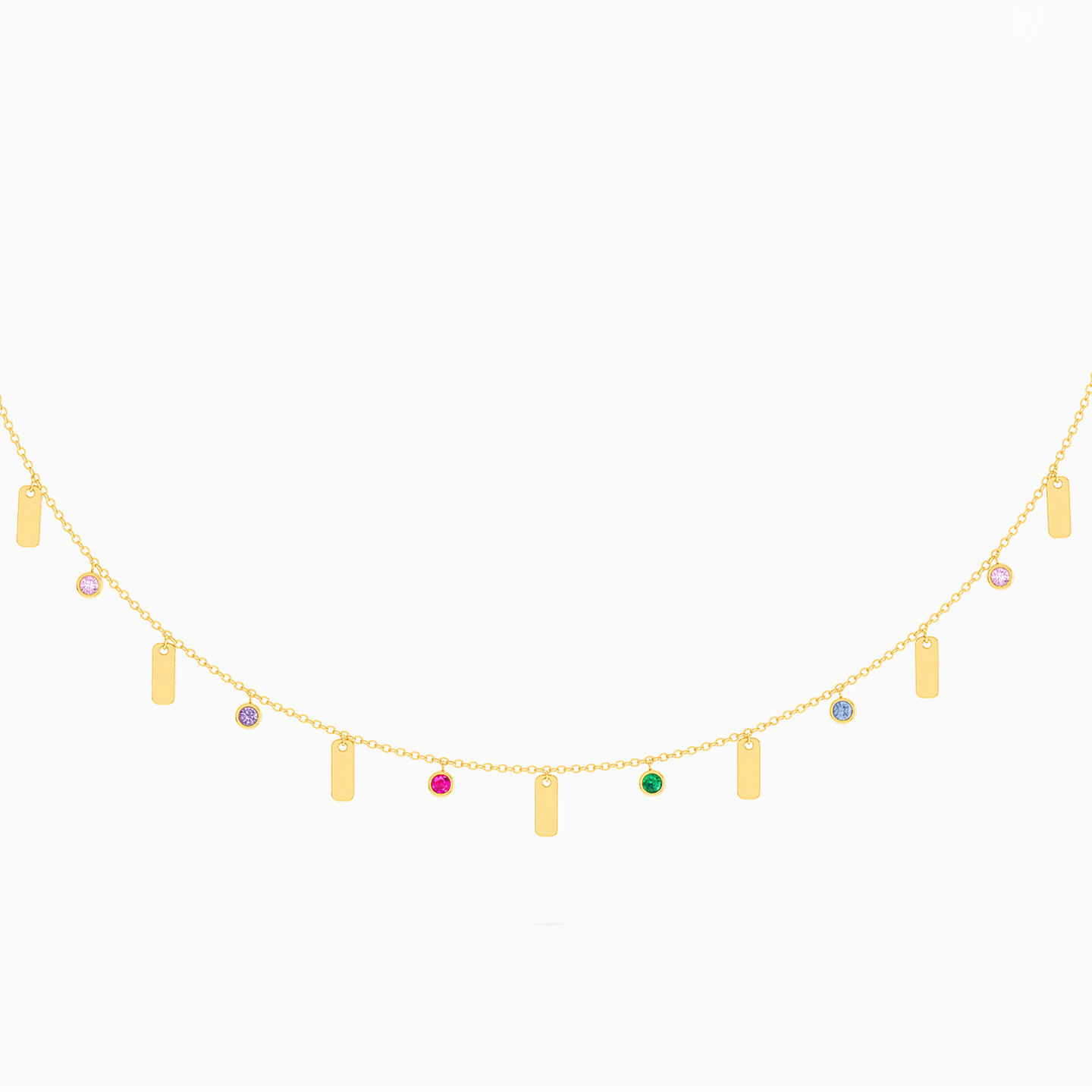 Perfect for everyday wear, this petite necklace from L’azurde Instyle features alternating colored stones and bar charms that lend subtle elegance to your look. Cast in 18-karat yellow gold, this necklace will work beautifully solo for a minimal look, or you can layer it with other necklaces to add more depth.