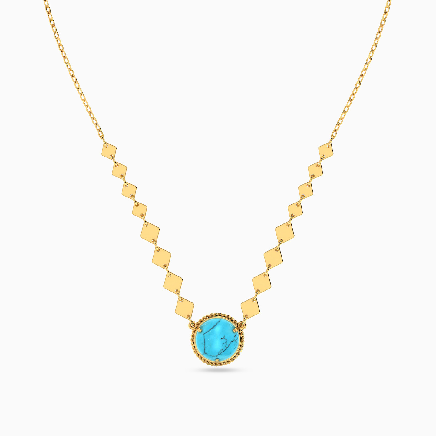 Mixing classic with a touch of glam, this necklace from L'azurde Instyle exudes an Arabesque vibe. We love it for the motifs lined up on the dainty 18-karat yellow gold chain that meet in a round turquoise stone pendant to the center. We recommend styling this over traditional wear with long earrings or over a modern outfit for a fusion look.